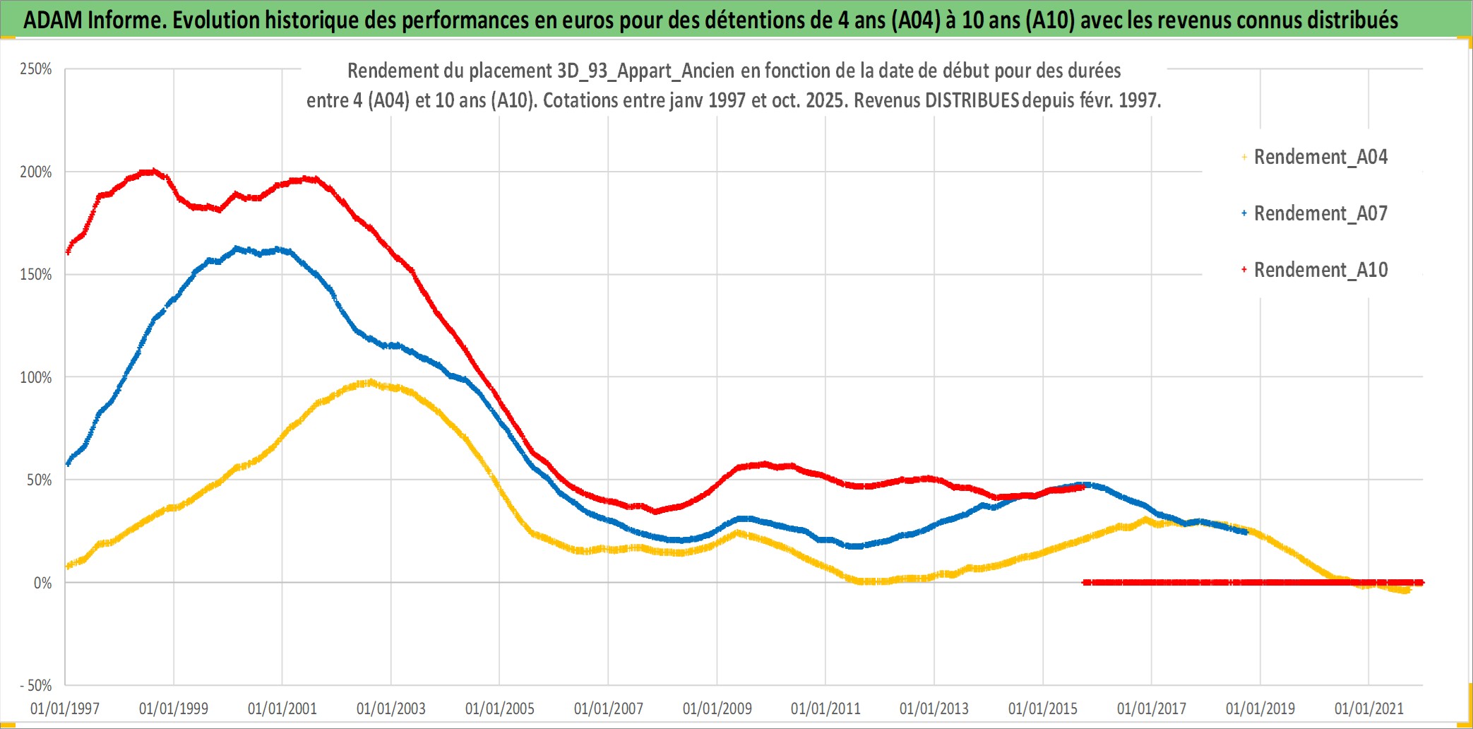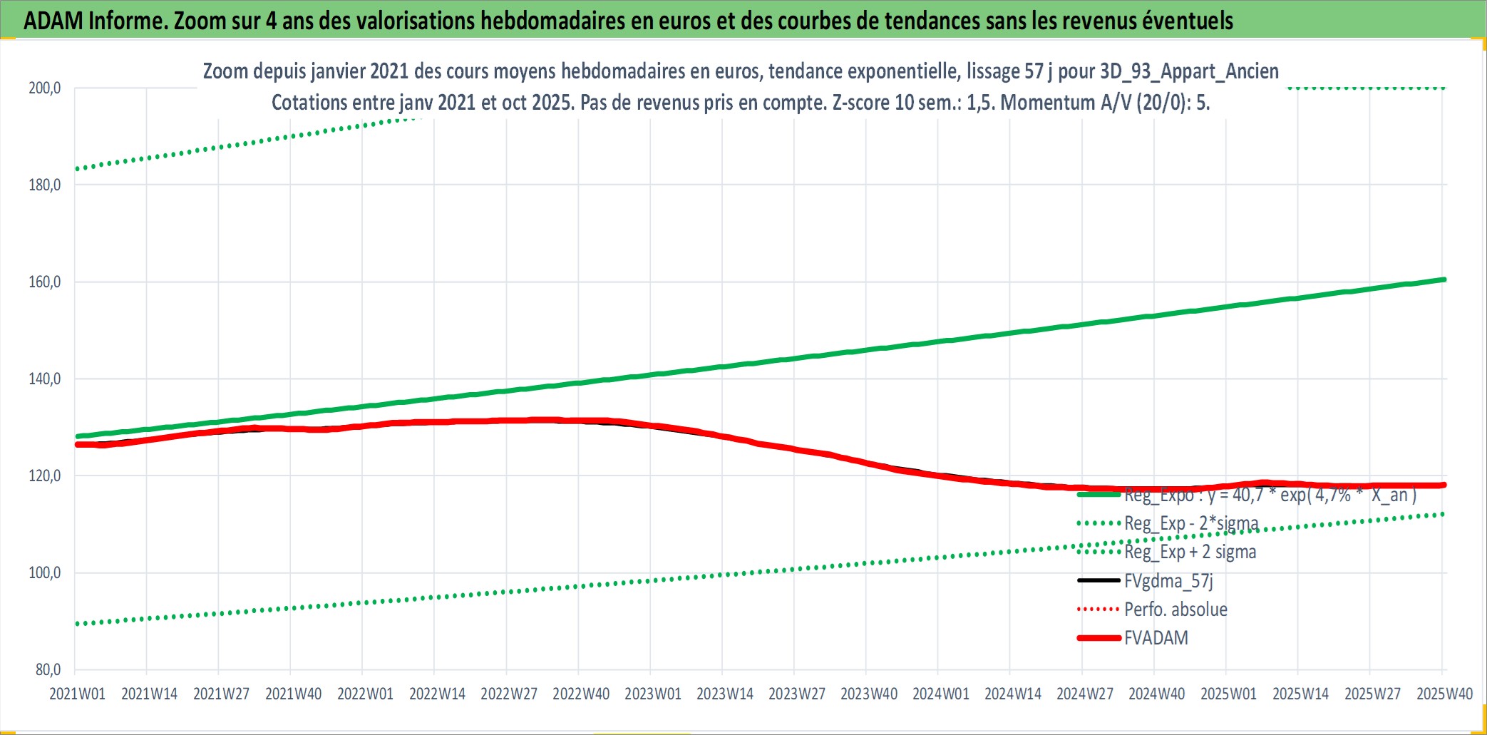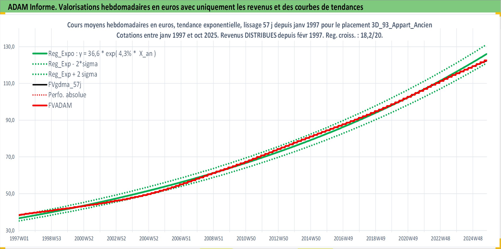 Site dédié aux investisseursPage dédiée sur site financeAnalyse des valorisations hebdomadaires de l'actif 3D_93_Appart_Ancien. Cet actif est cote en EUR. Les valorisations couvrent les semaines 1997W01 a 2025W40. Les loyers de cet actif immobilier sont pris egaux a 3,33% annuels de la valeur venale du logement.