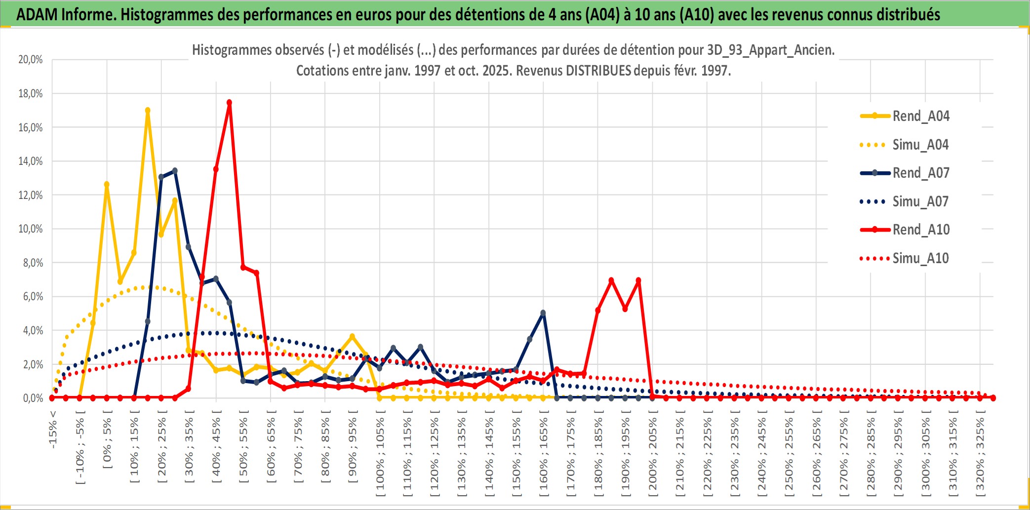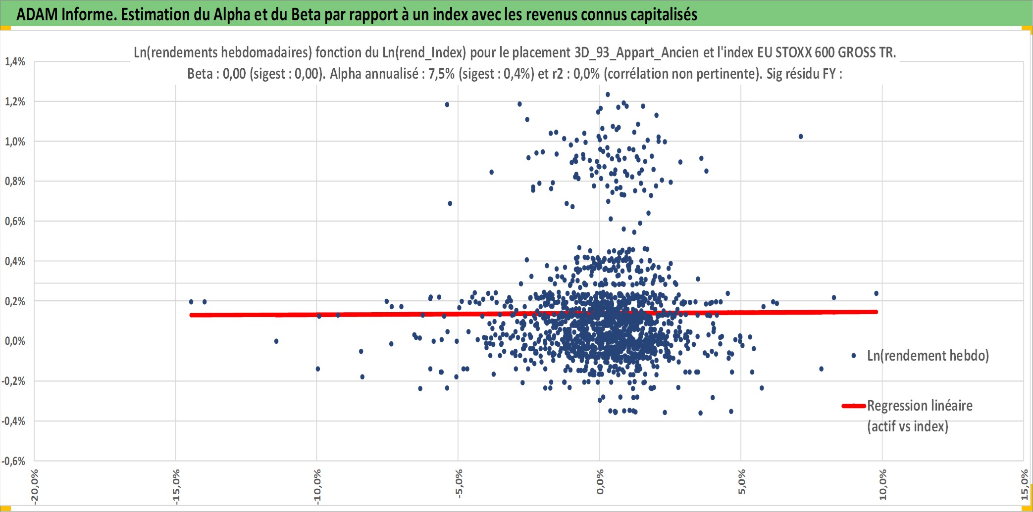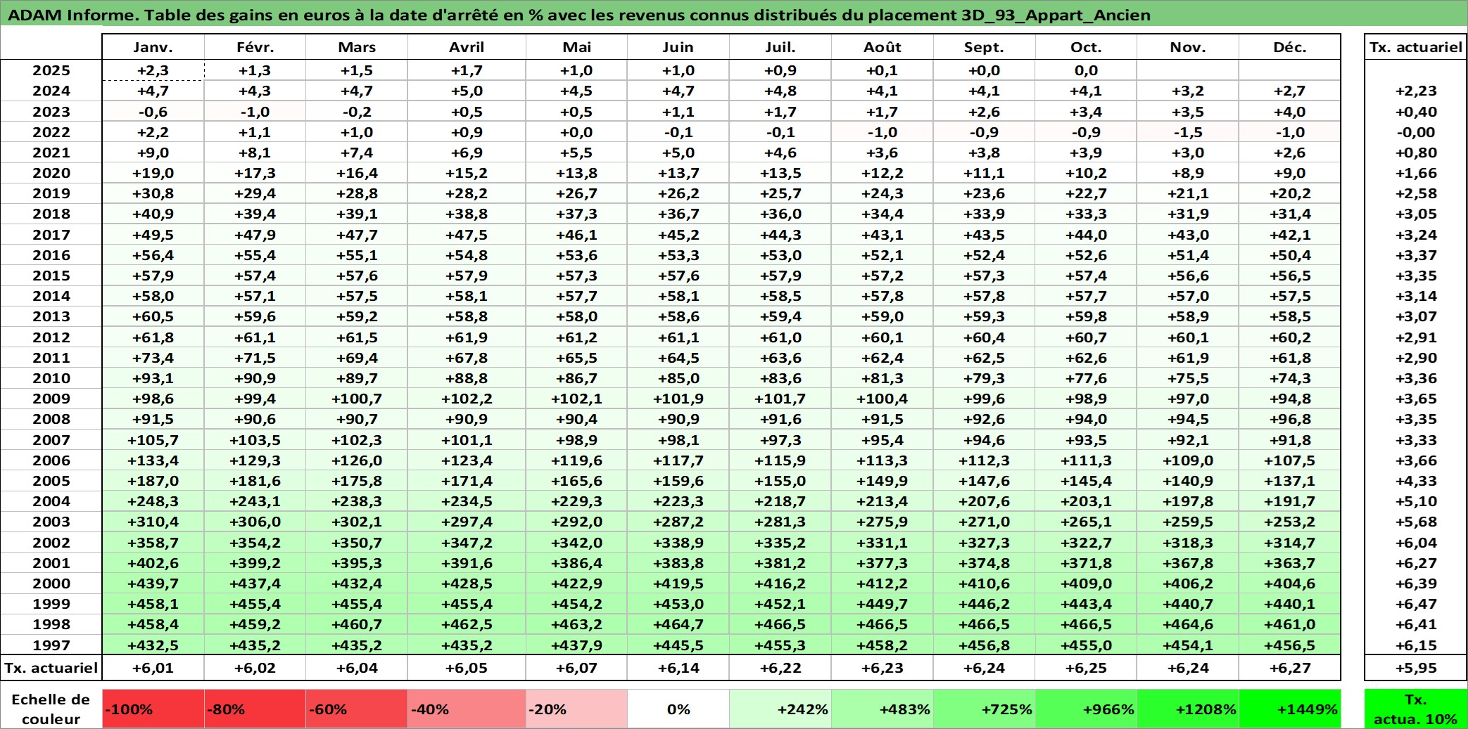 Site dédié aux investisseursPage dédiée sur site financeAnalyse des valorisations hebdomadaires de l'actif 3D_93_Appart_Ancien. Cet actif est cote en EUR. Les valorisations couvrent les semaines 1997W01 a 2025W40. Les loyers de cet actif immobilier sont pris egaux a 3,33% annuels de la valeur venale du logement.