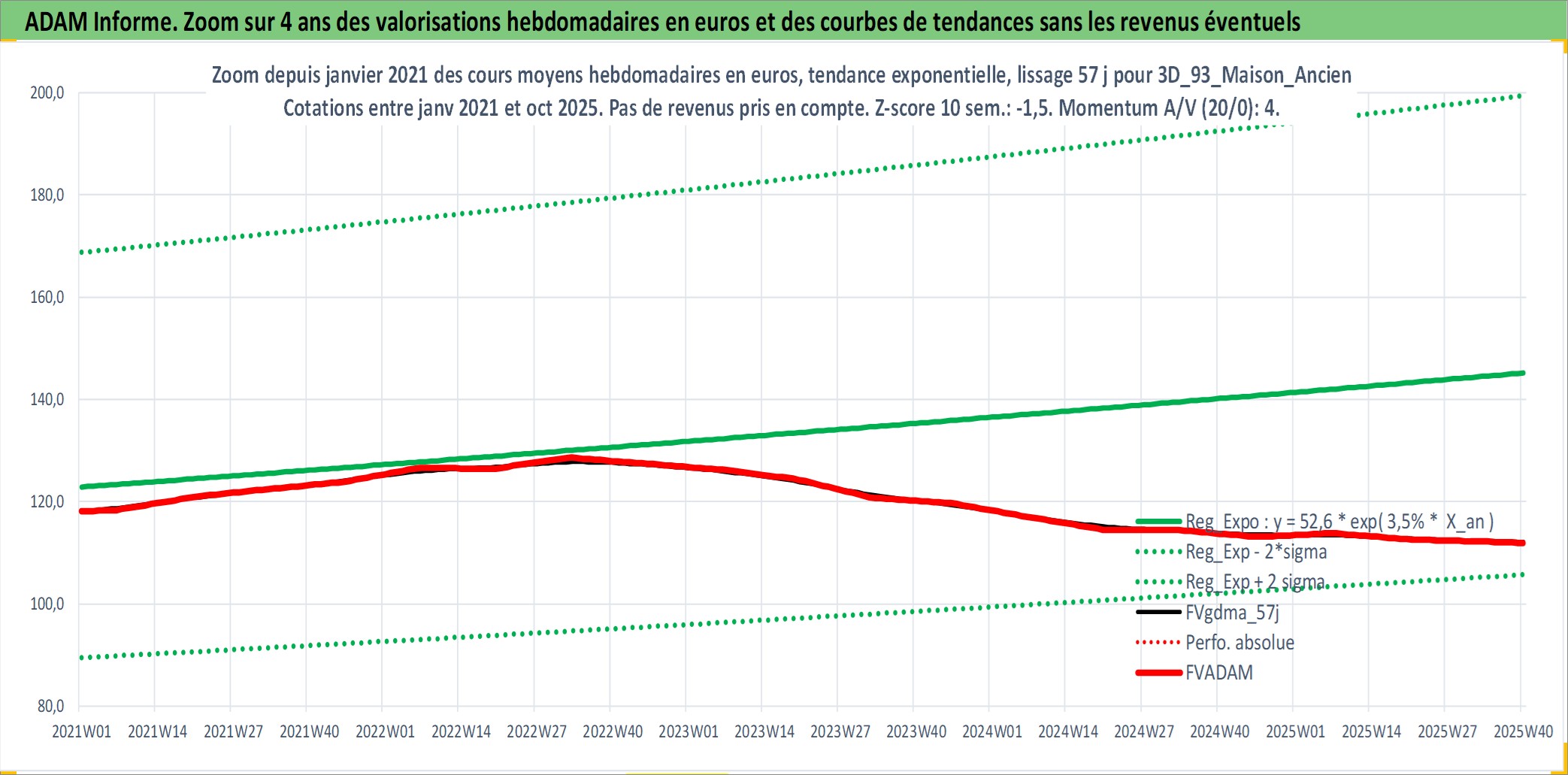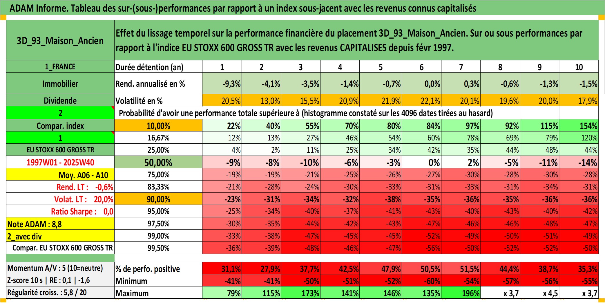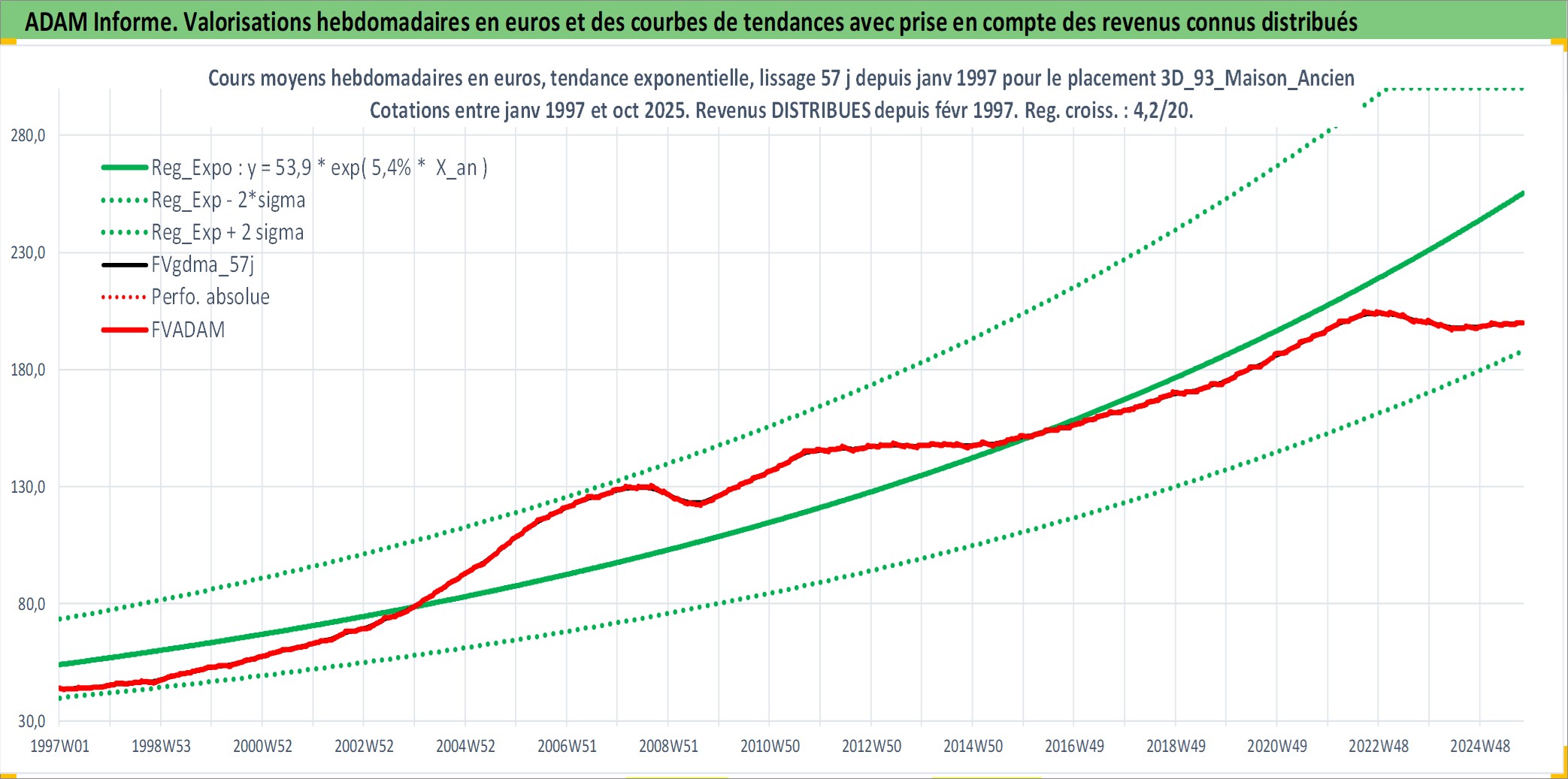 Site dédié aux investisseursPage dédiée sur site financeAnalyse des valorisations hebdomadaires de l'actif 3D_93_Maison_Ancien. Cet actif est cote en EUR. Les valorisations couvrent les semaines 1997W01 a 2025W40. Les loyers de cet actif immobilier sont pris egaux a 3,33% annuels de la valeur venale du logement.