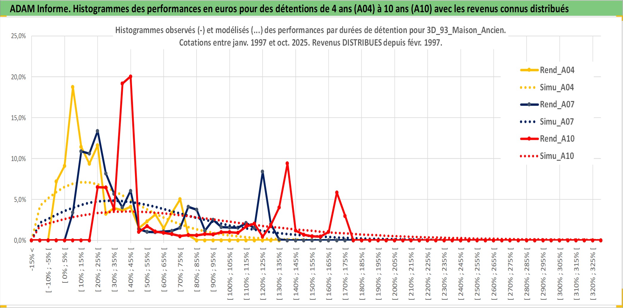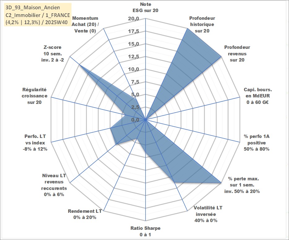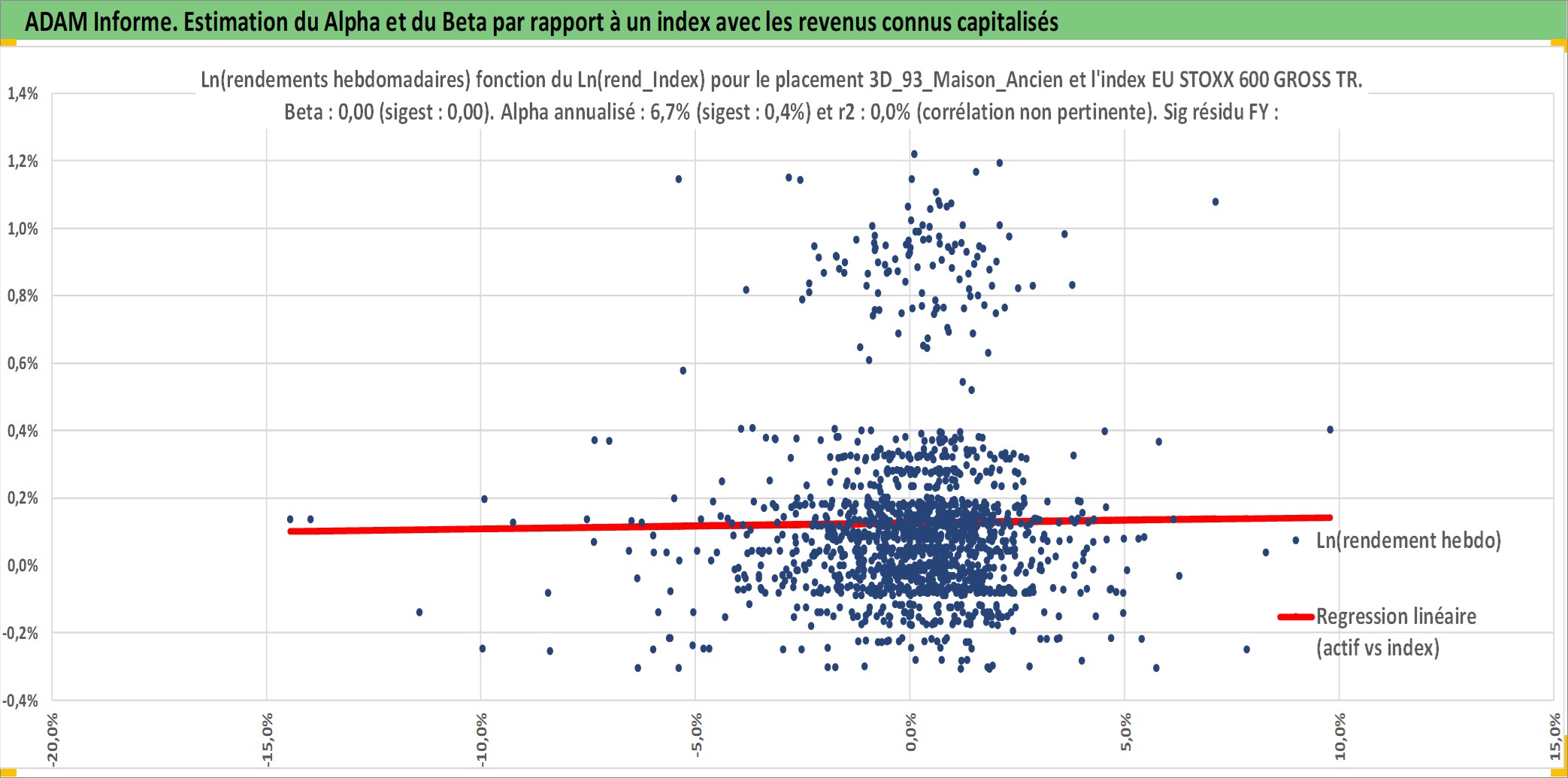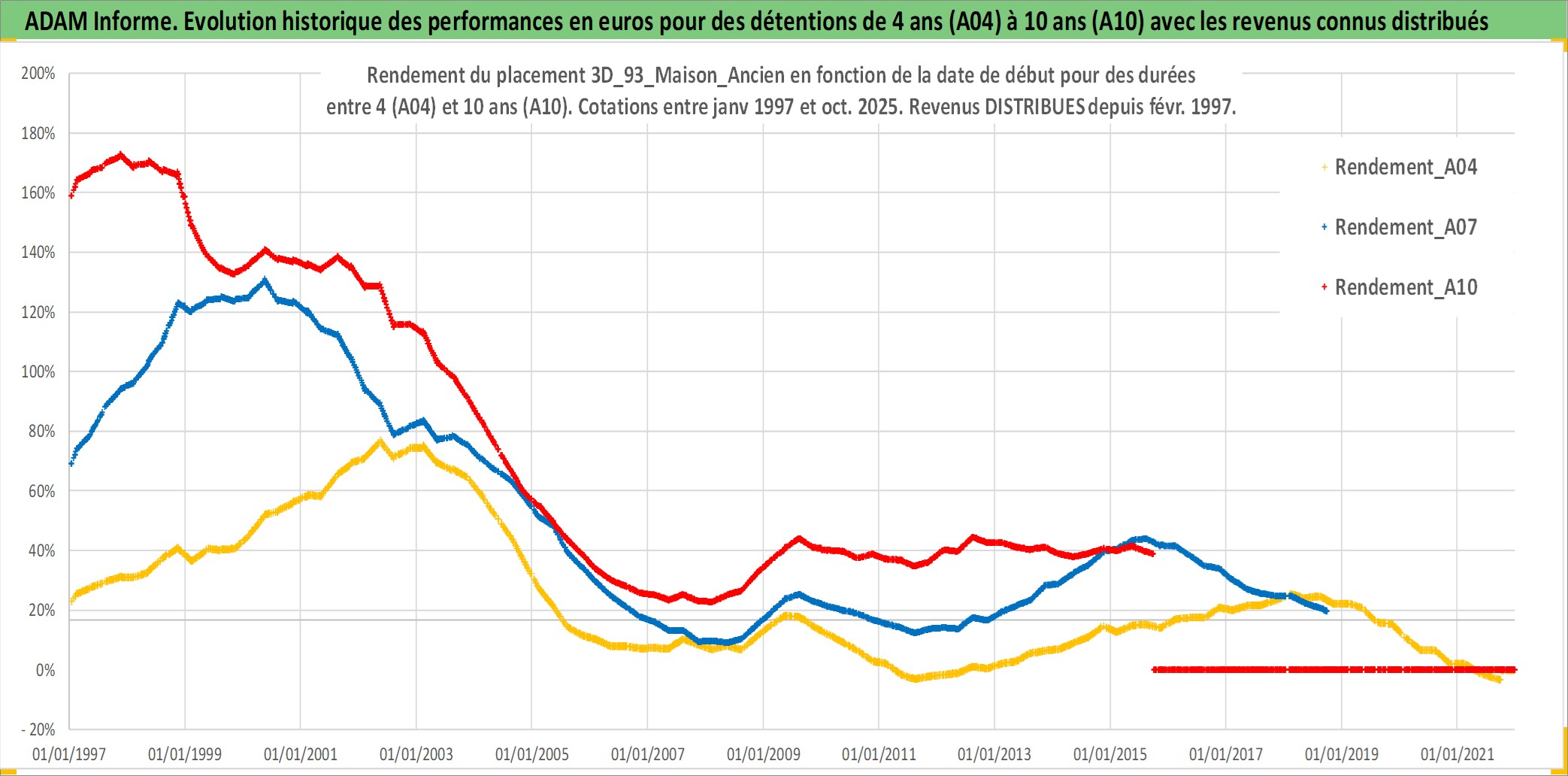 Site dédié aux investisseursPage dédiée sur site financeAnalyse des valorisations hebdomadaires de l'actif 3D_93_Maison_Ancien. Cet actif est cote en EUR. Les valorisations couvrent les semaines 1997W01 a 2025W40. Les loyers de cet actif immobilier sont pris egaux a 3,33% annuels de la valeur venale du logement.