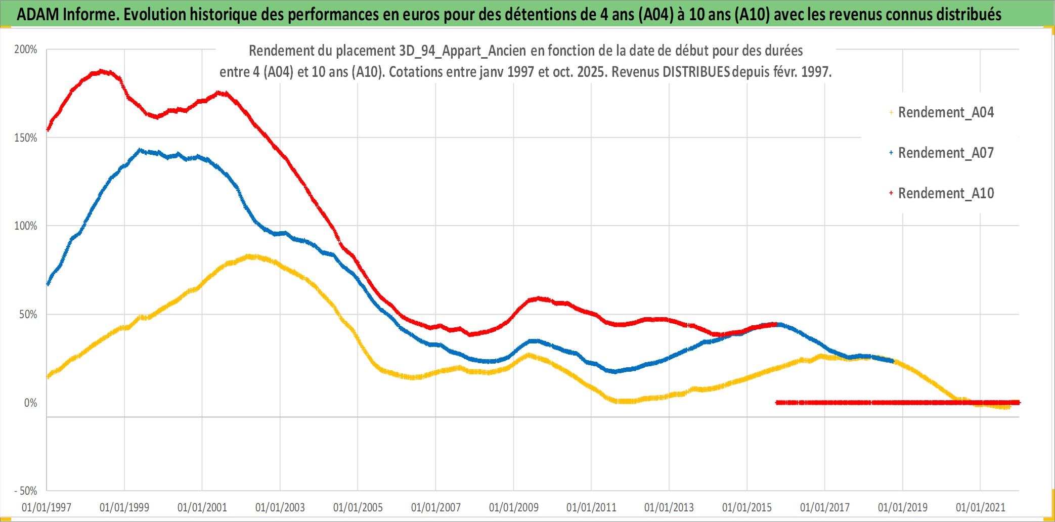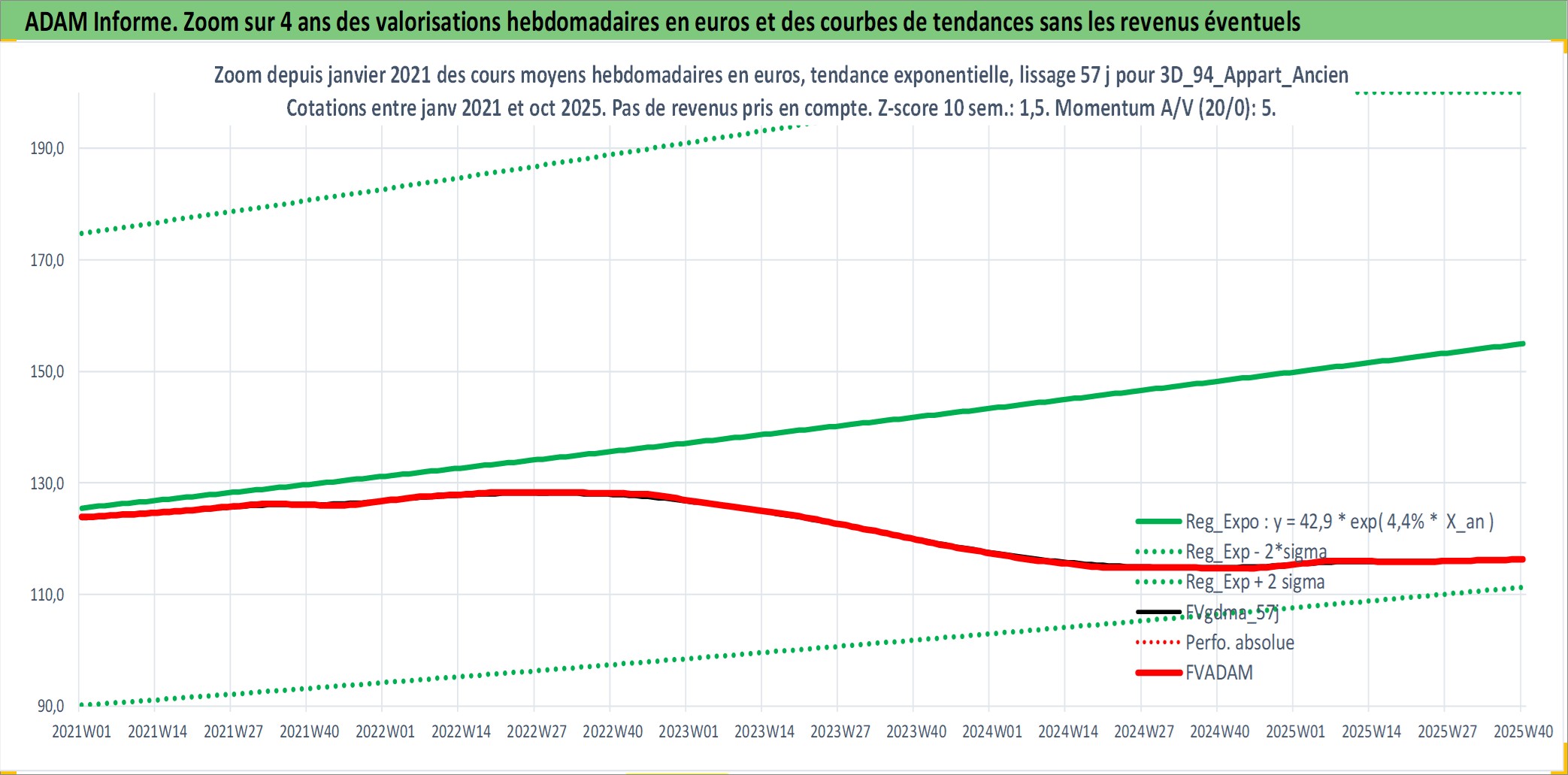 Site dédié aux investisseursPage dédiée sur site financeAnalyse des valorisations hebdomadaires de l'actif 3D_94_Appart_Ancien. Cet actif est cote en EUR. Les valorisations couvrent les semaines 1997W01 a 2025W40. Les loyers de cet actif immobilier sont pris egaux a 3,33% annuels de la valeur venale du logement.