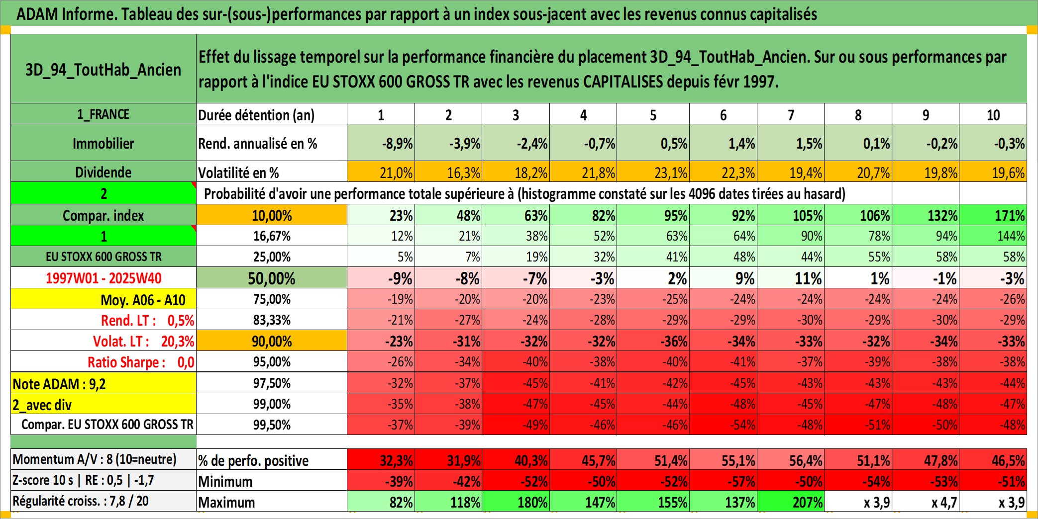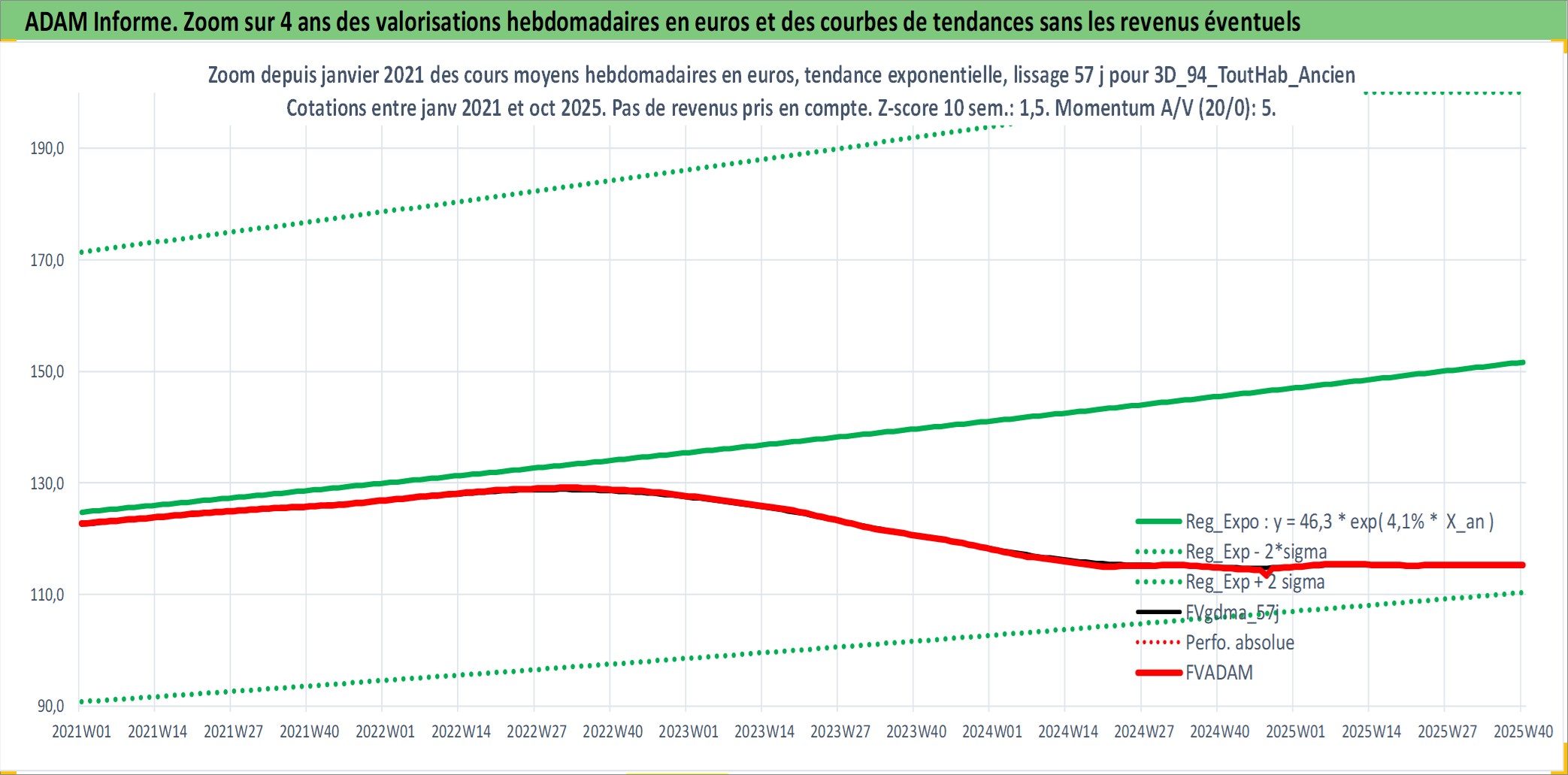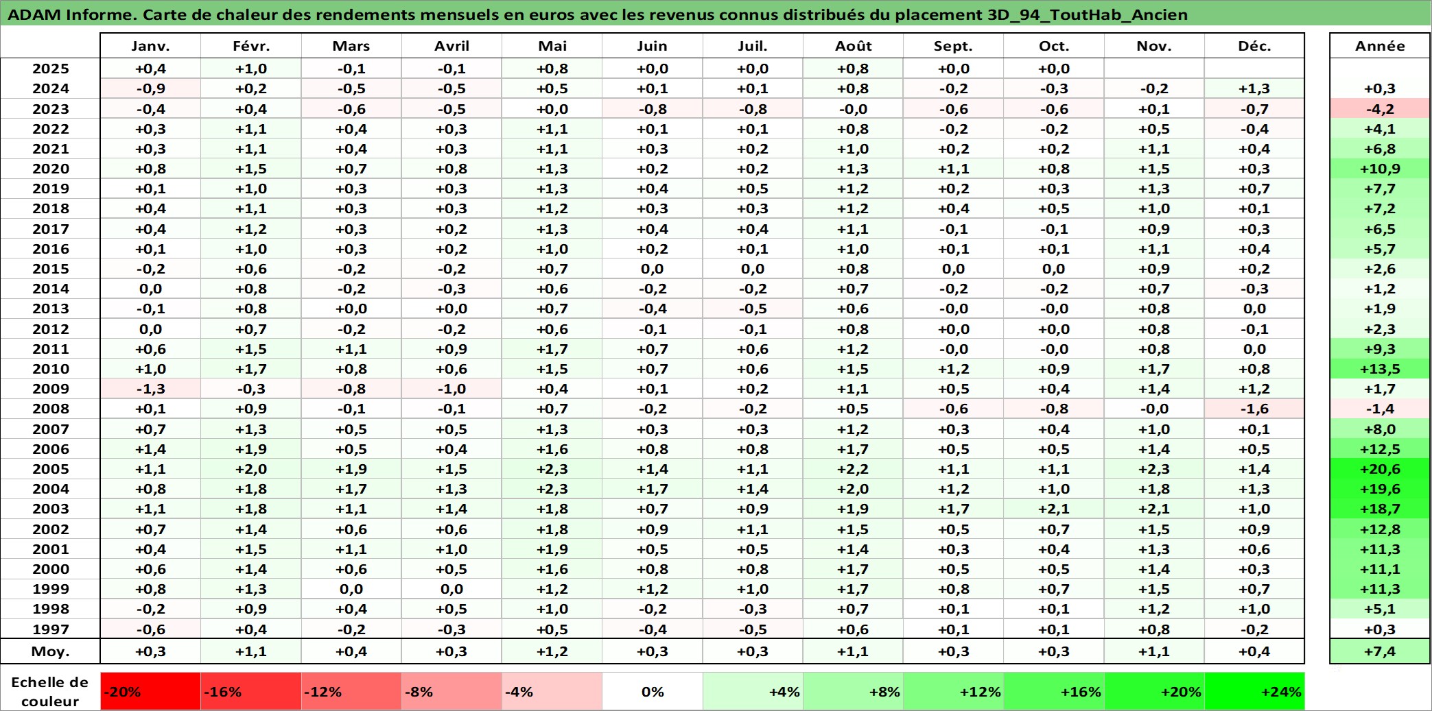 Site dédié aux investisseursPage dédiée sur site financeAnalyse des valorisations hebdomadaires de l'actif 3D_94_ToutHab_Ancien. Cet actif est cote en EUR. Les valorisations couvrent les semaines 1997W01 a 2025W40. Les loyers de cet actif immobilier sont pris egaux a 3,33% annuels de la valeur venale du logement.