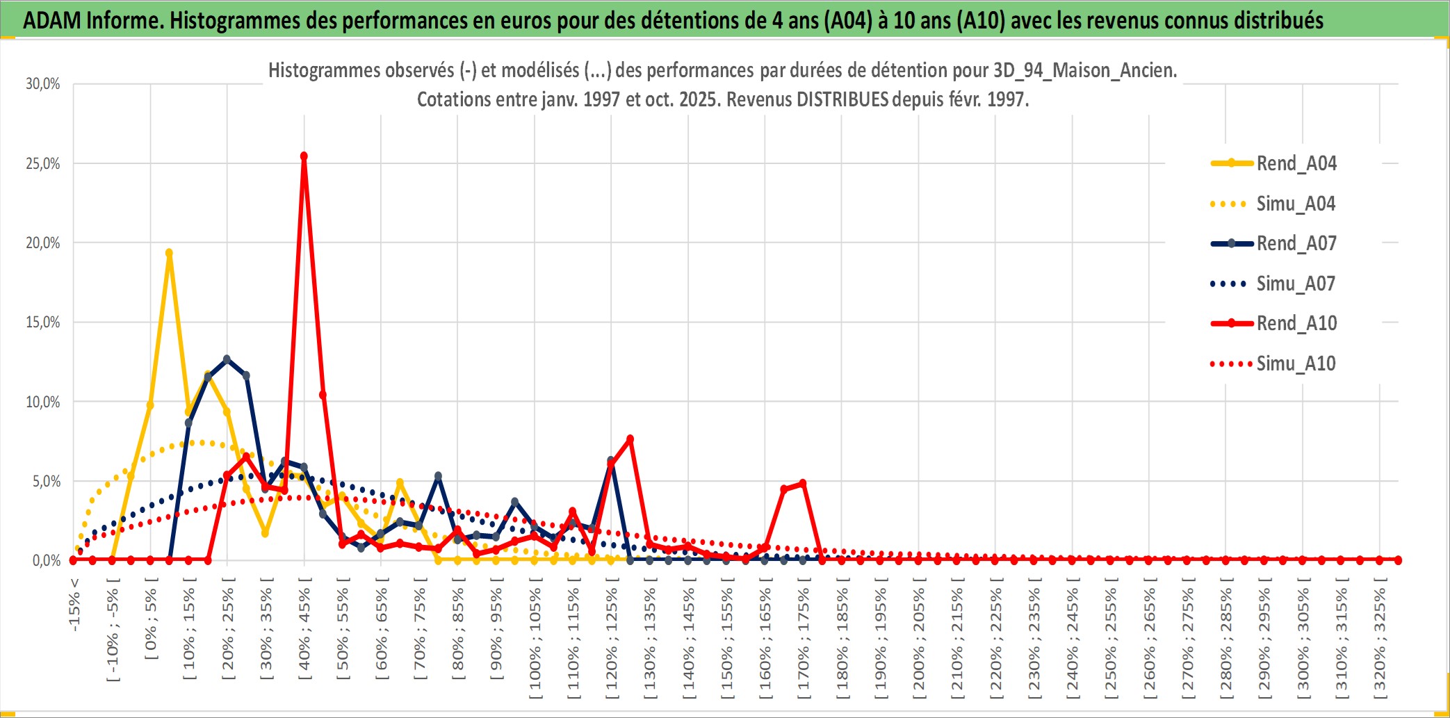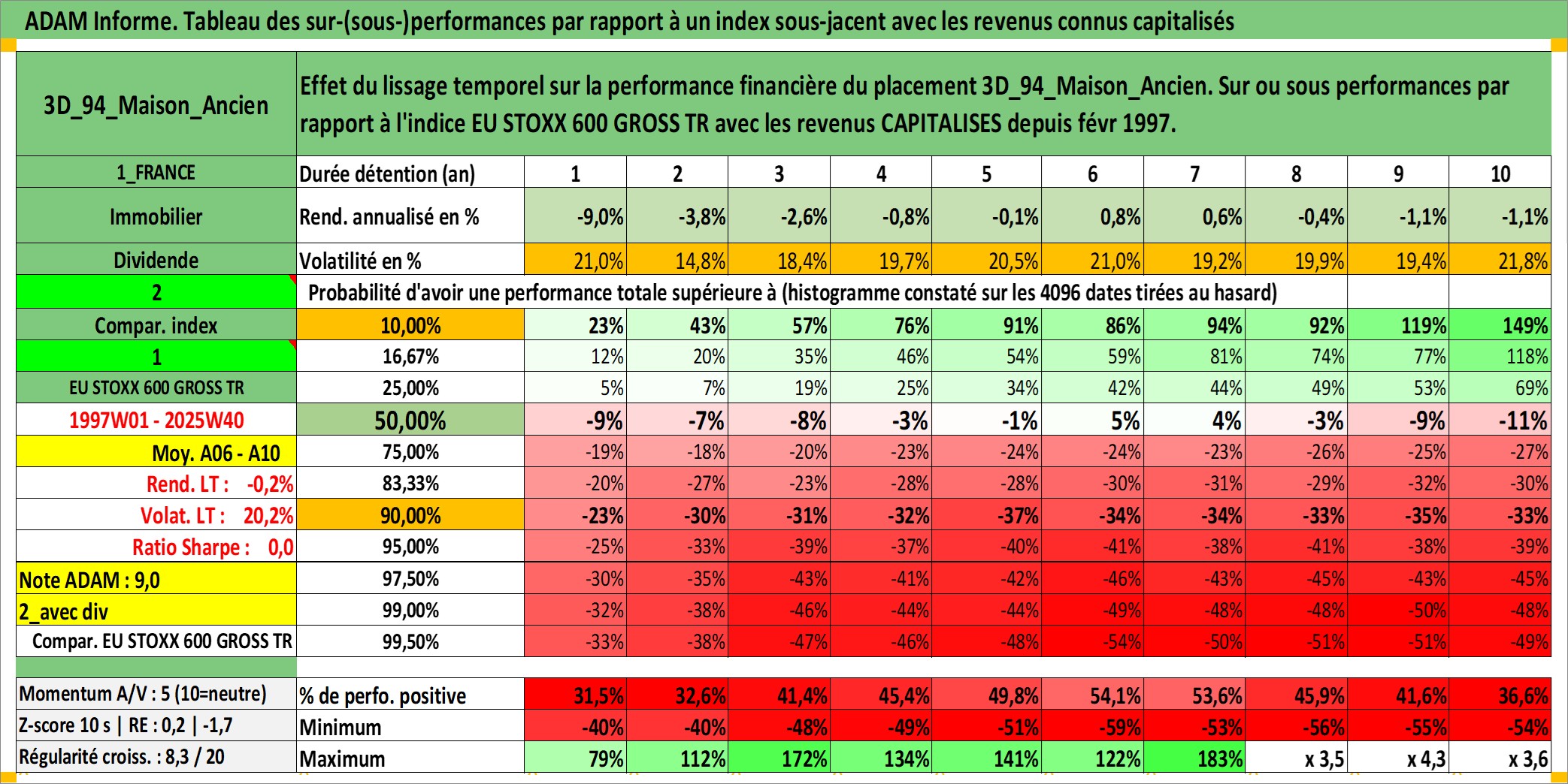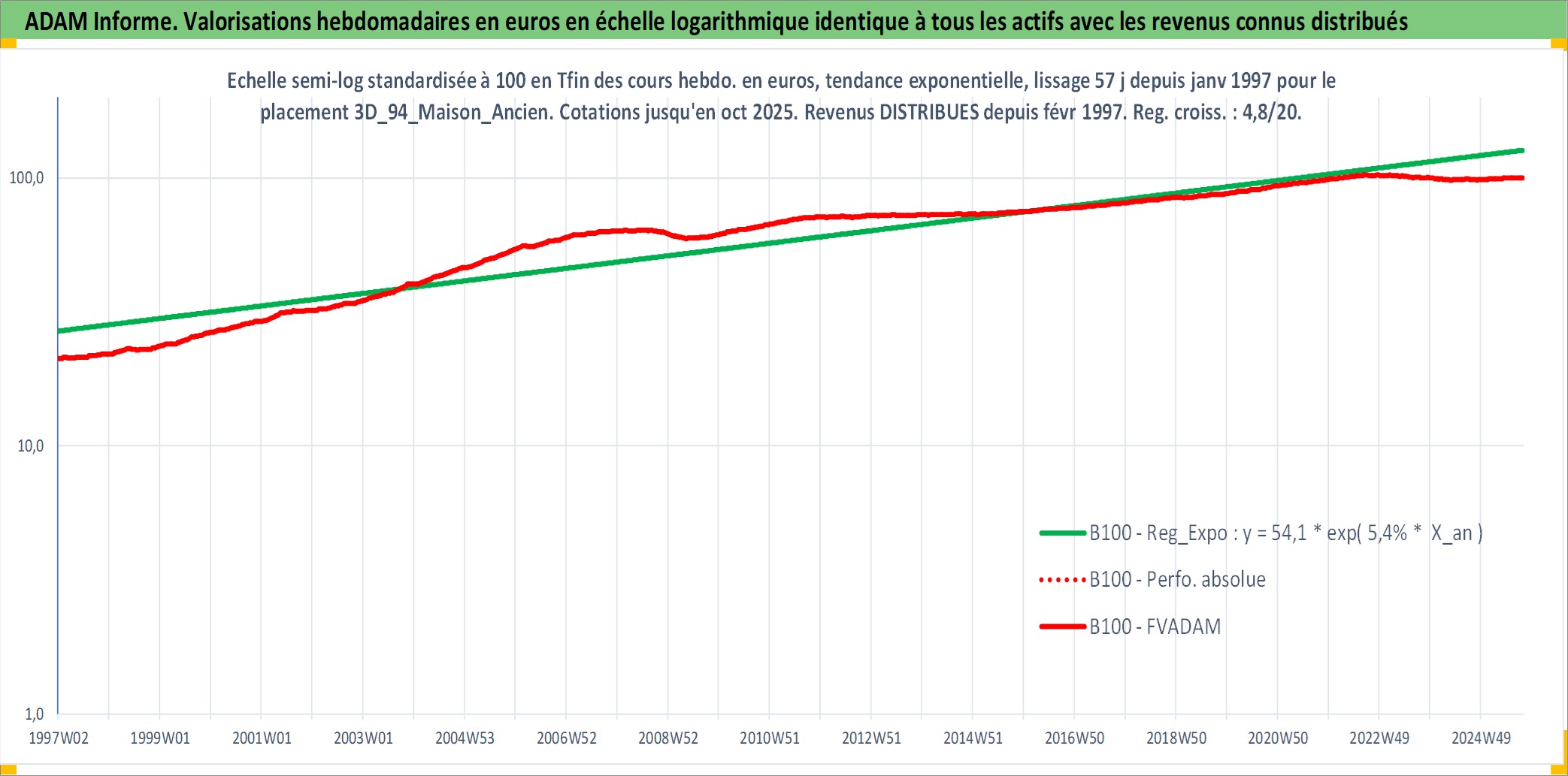 Site dédié aux investisseursPage dédiée sur site financeAnalyse des valorisations hebdomadaires de l'actif 3D_94_Maison_Ancien. Cet actif est cote en EUR. Les valorisations couvrent les semaines 1997W01 a 2025W40. Les loyers de cet actif immobilier sont pris egaux a 3,33% annuels de la valeur venale du logement.