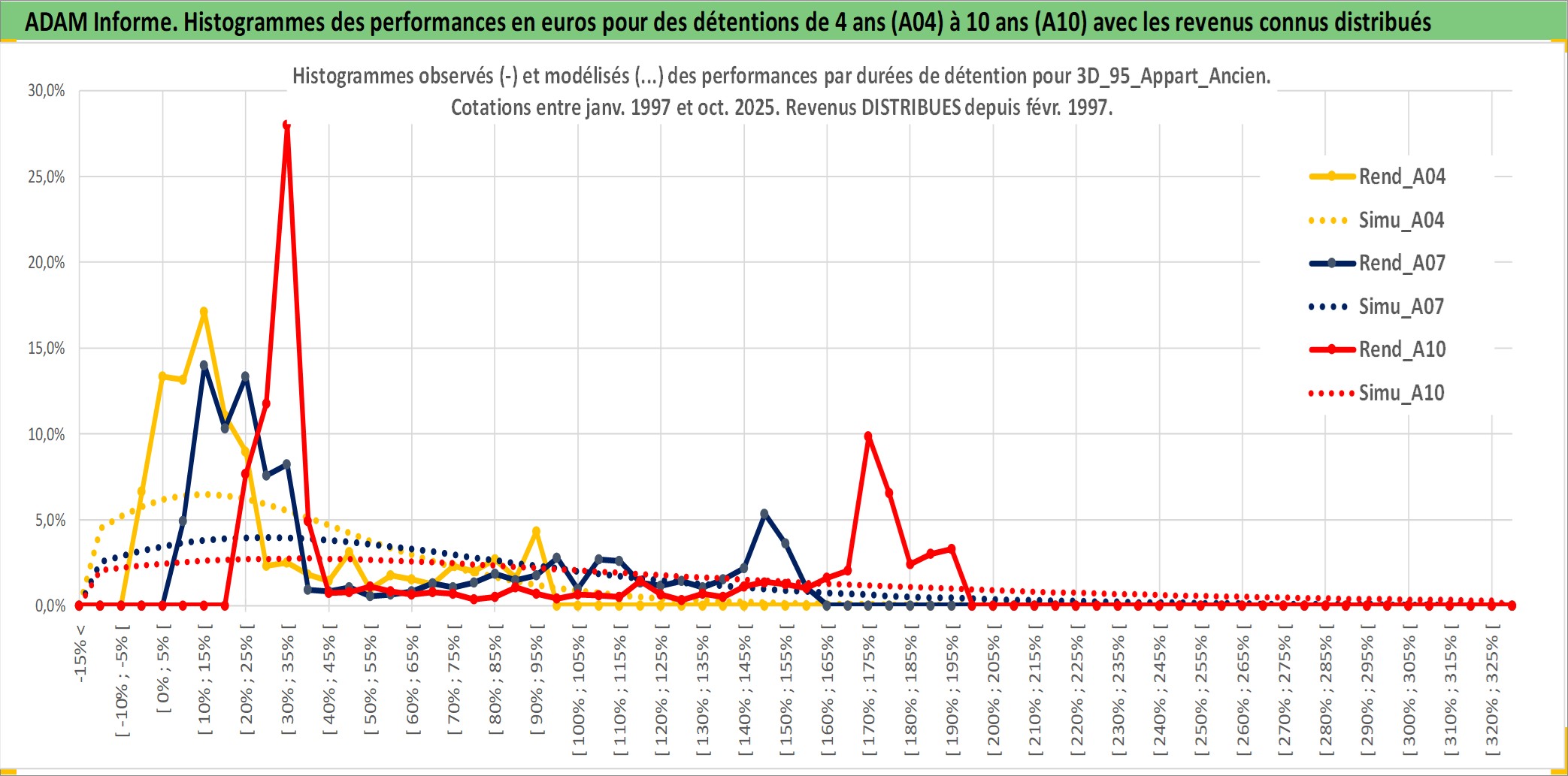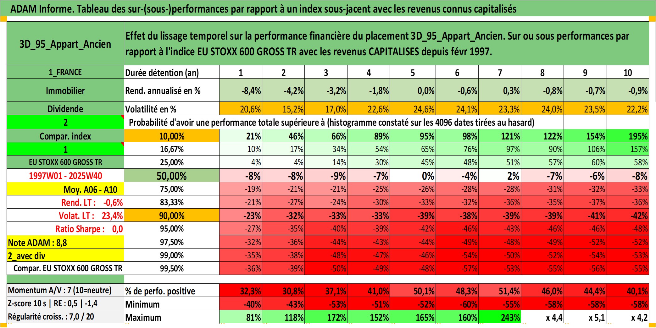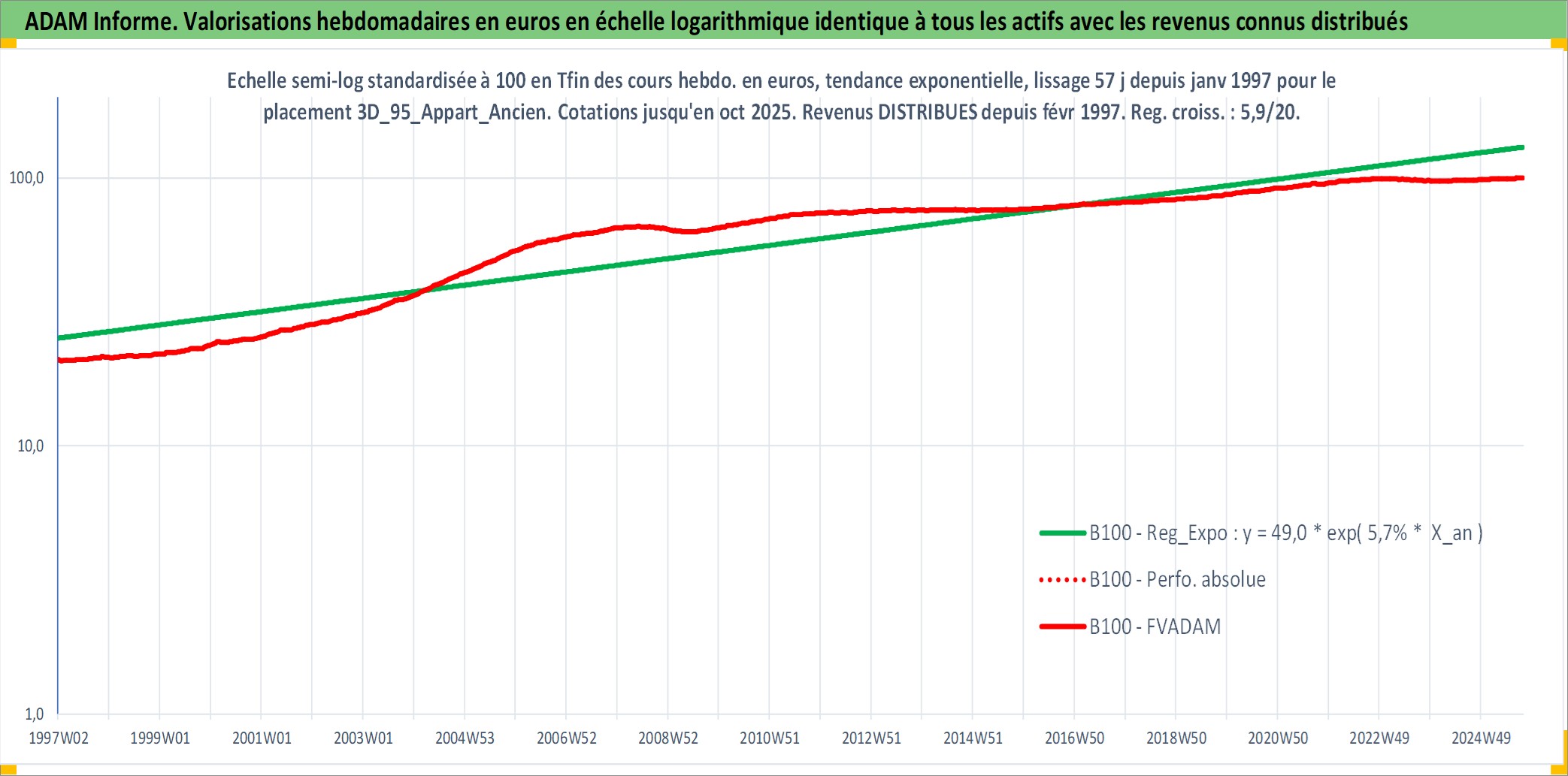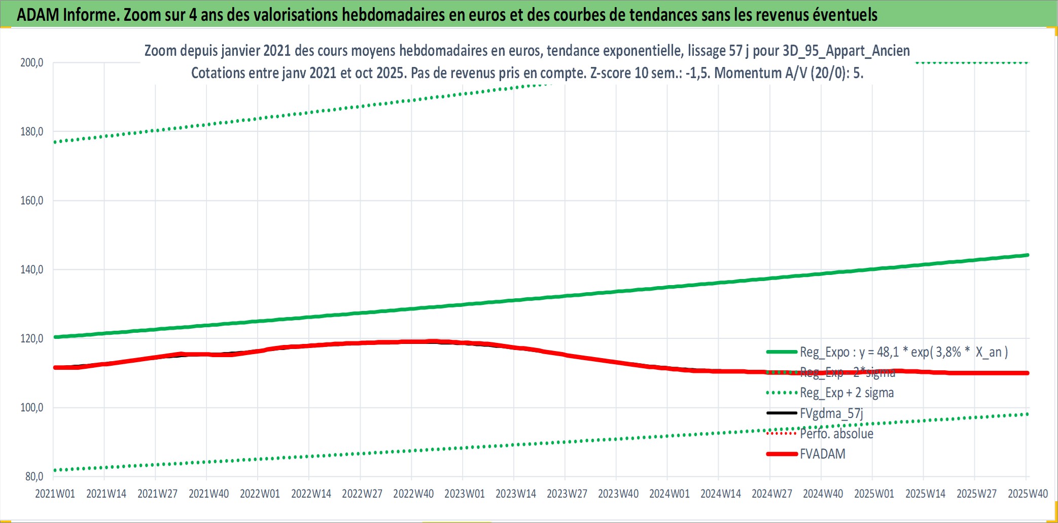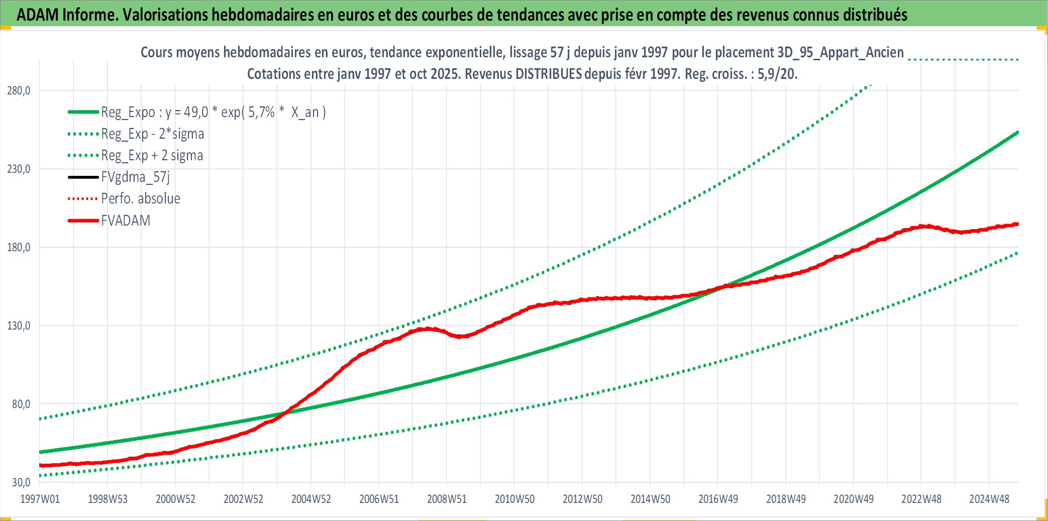 Site dédié aux investisseursPage dédiée sur site financeAnalyse des valorisations hebdomadaires de l'actif 3D_95_Appart_Ancien. Cet actif est cote en EUR. Les valorisations couvrent les semaines 1997W01 a 2025W40. Les loyers de cet actif immobilier sont pris egaux a 3,33% annuels de la valeur venale du logement.