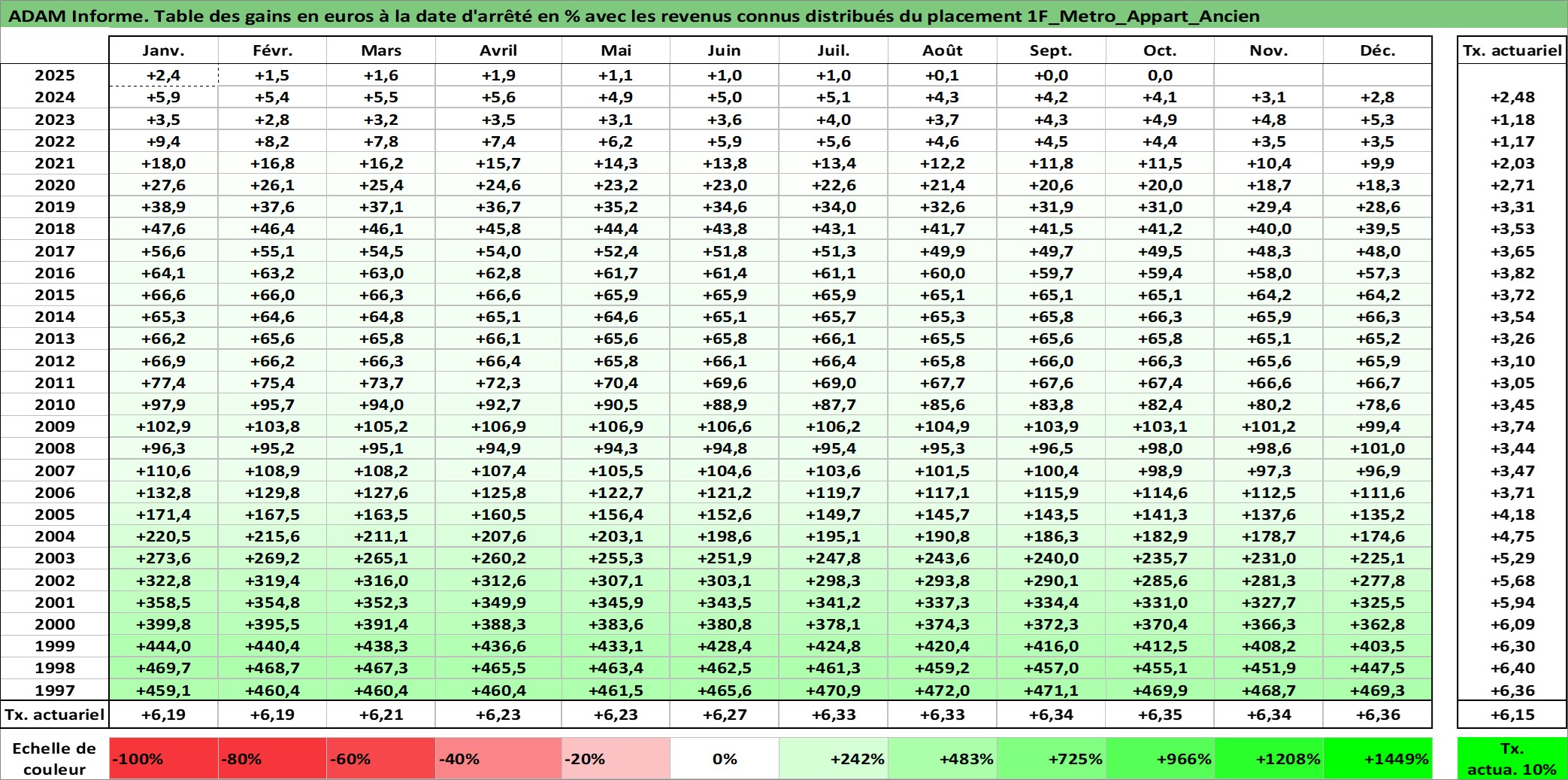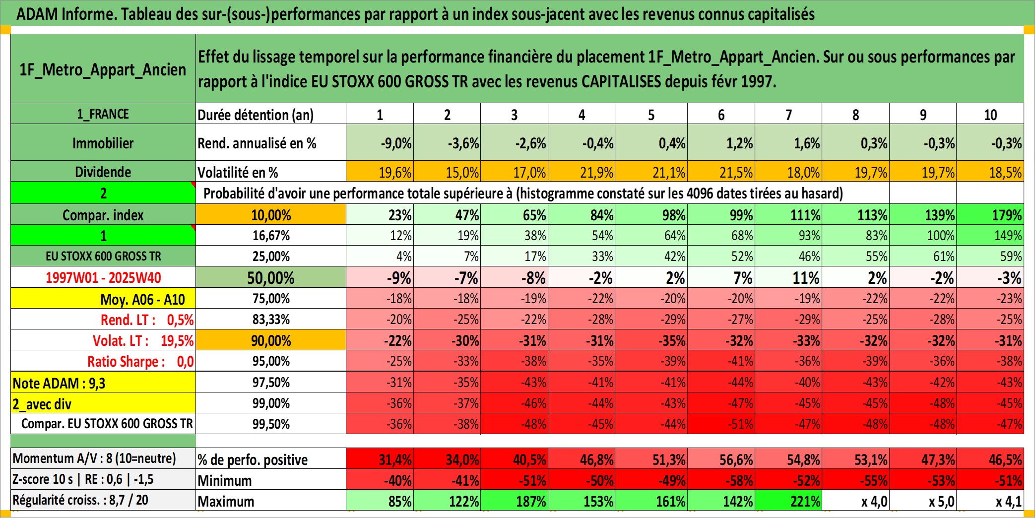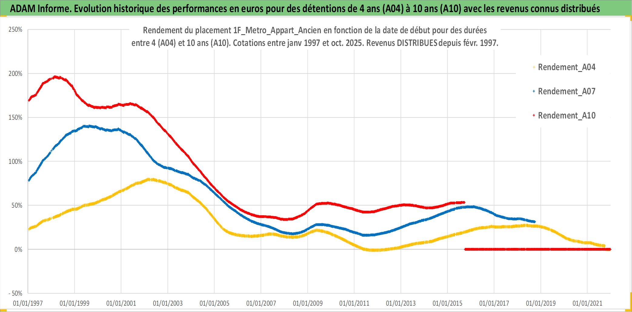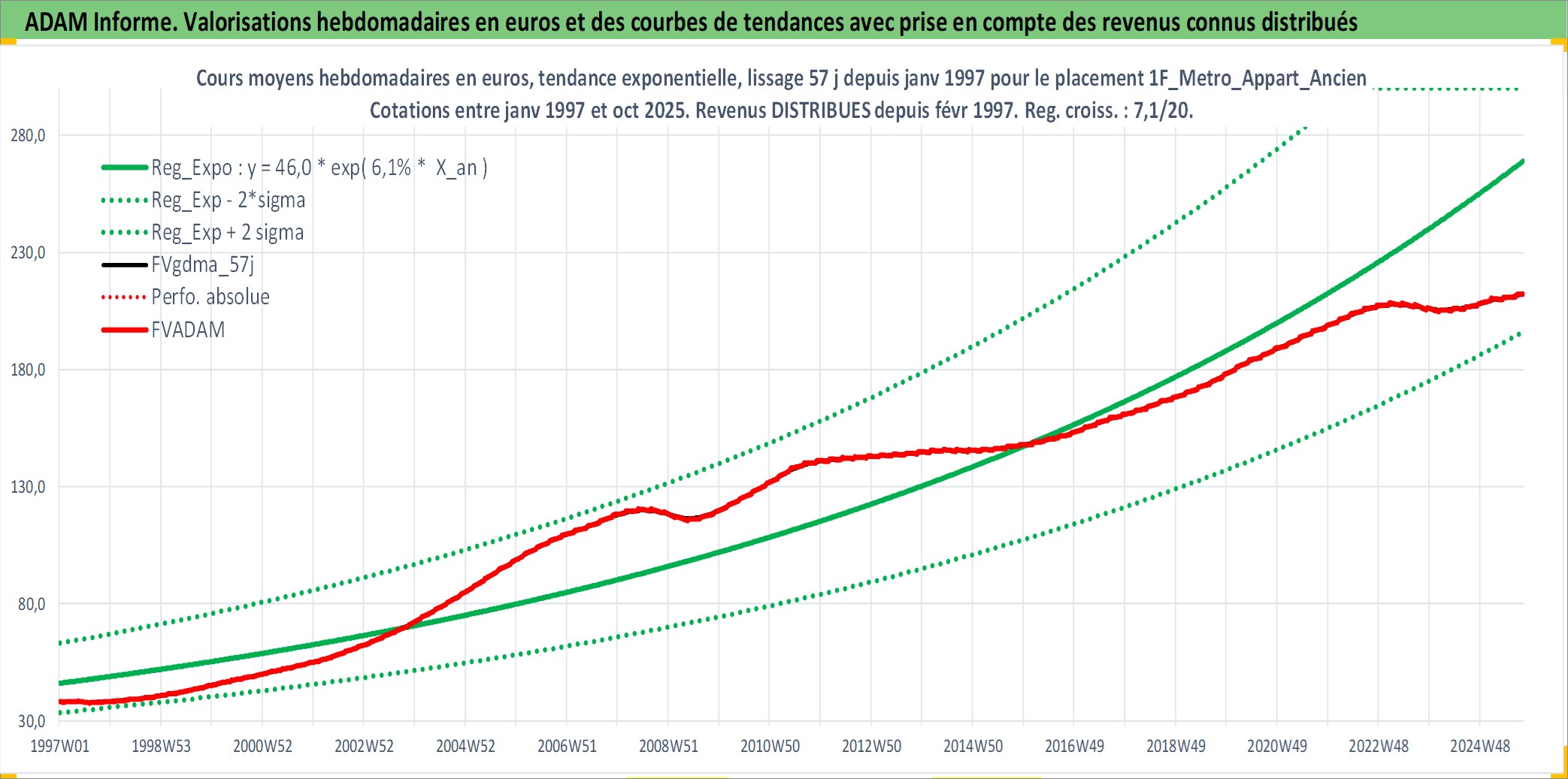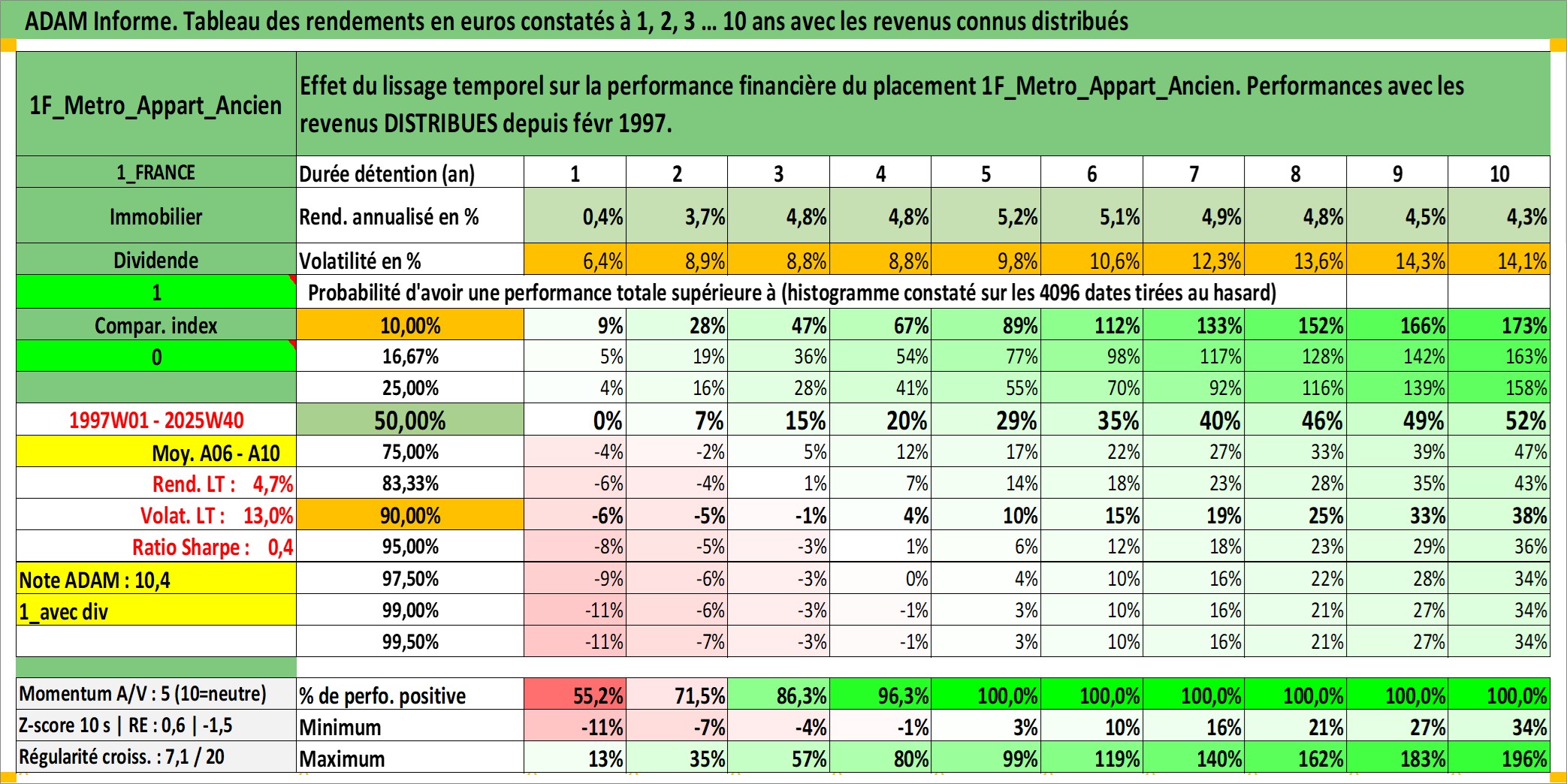 Site dédié aux investisseursPage dédiée sur site financeAnalyse des valorisations hebdomadaires de l'actif 1F_Metro_Appart_Ancien. Cet actif est cote en EUR. Les valorisations couvrent les semaines 1997W01 a 2025W40. Les loyers de cet actif immobilier sont pris egaux a 3,33% annuels de la valeur venale du logement.