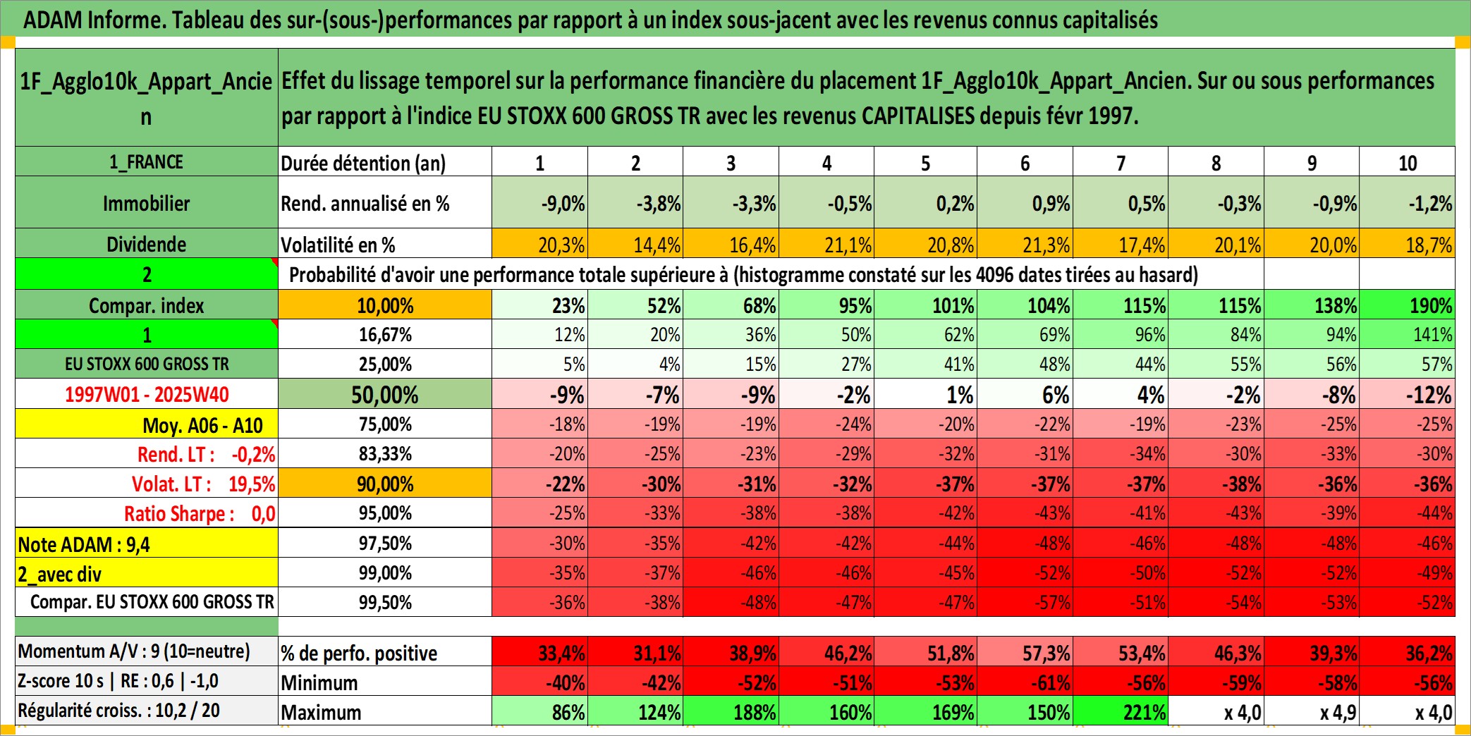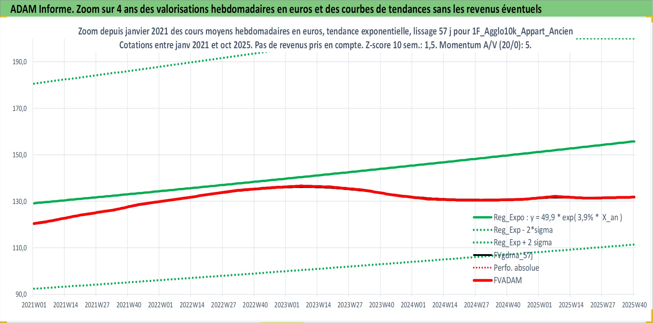 Site dédié aux investisseursPage dédiée sur site financeAnalyse des valorisations hebdomadaires de l'actif 1F_Agglo10k_Appart_Ancien. Cet actif est cote en EUR. Les valorisations couvrent les semaines 1997W01 a 2025W40. Les loyers de cet actif immobilier sont pris egaux a 3,33% annuels de la valeur venale du logement.