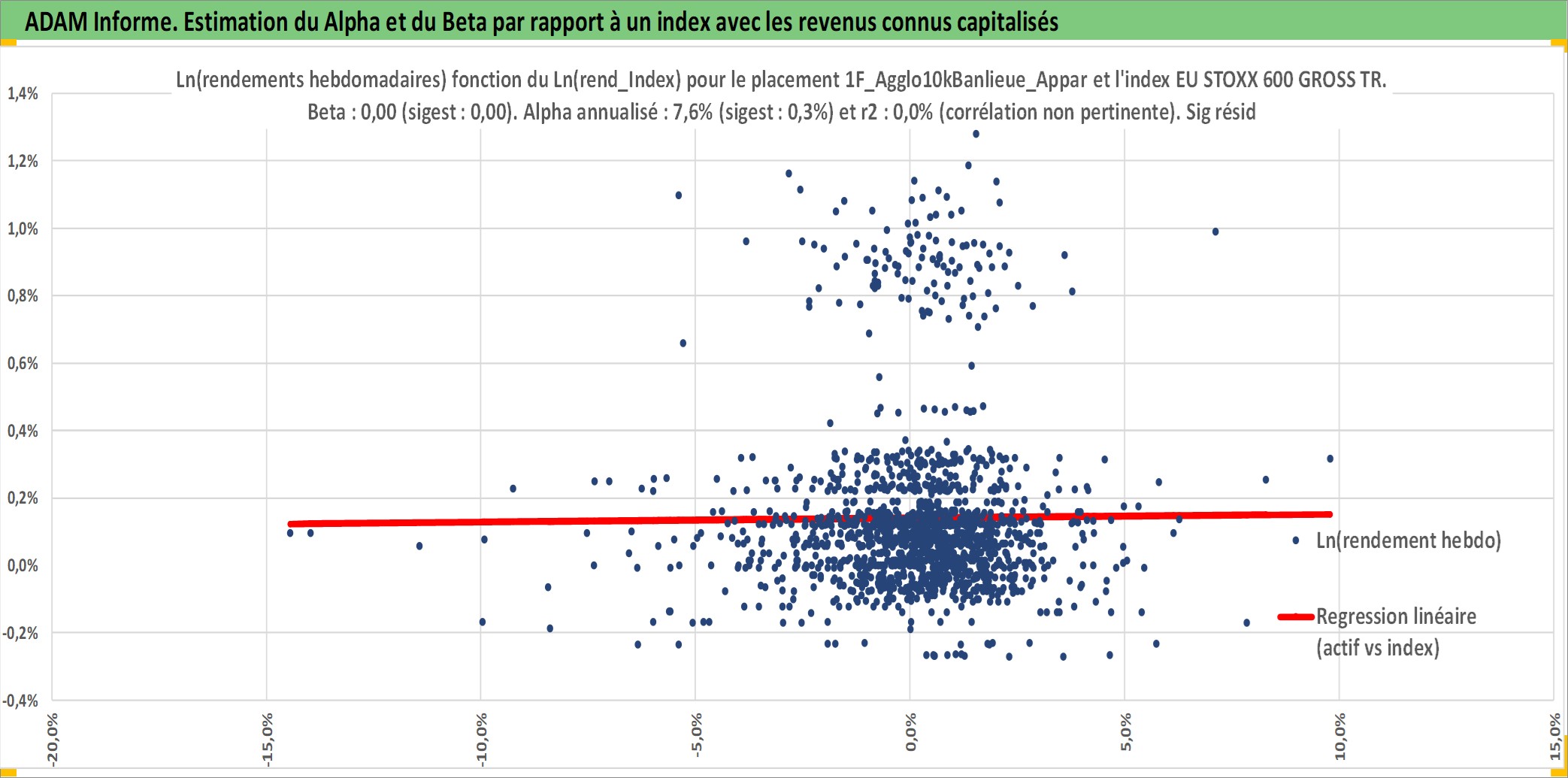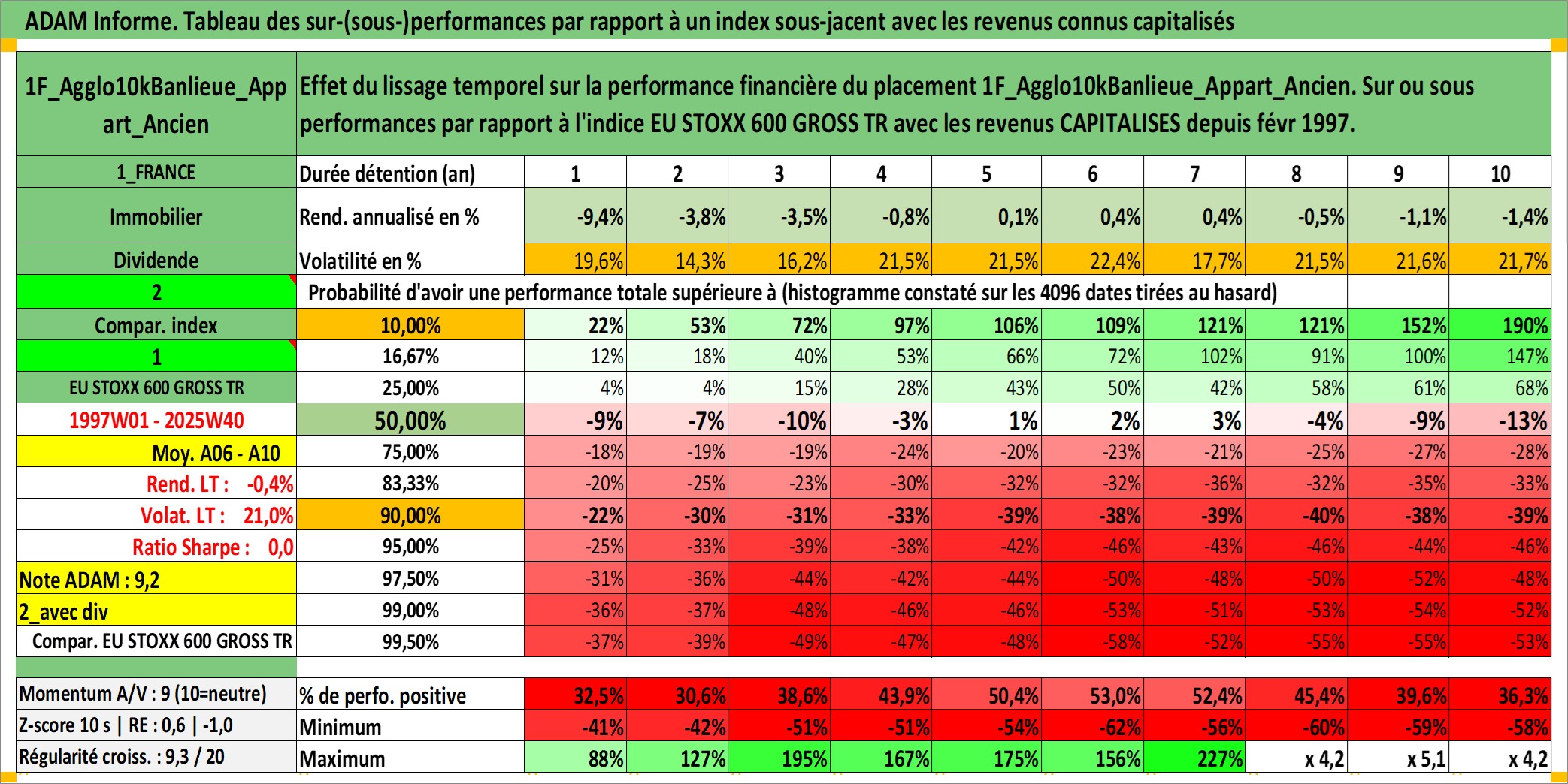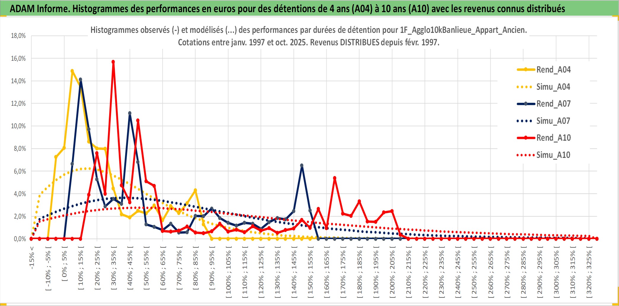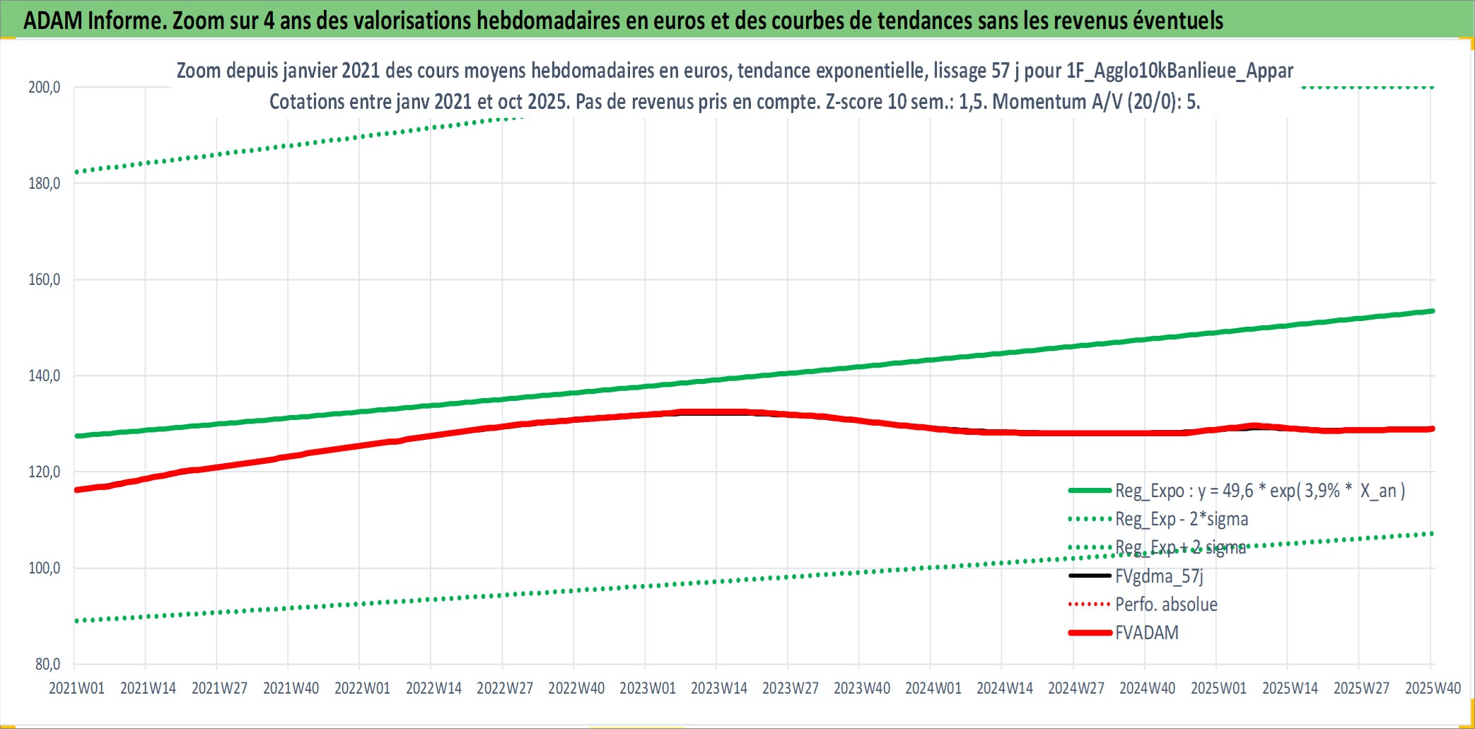 Site dédié aux investisseursPage dédiée sur site financeAnalyse des valorisations hebdomadaires de l'actif 1F_Agglo10kBanlieue_Appart_Ancien. Cet actif est cote en EUR. Les valorisations couvrent les semaines 1997W01 a 2025W40. Les loyers de cet actif immobilier sont pris egaux a 3,33% annuels de la valeur venale du logement.