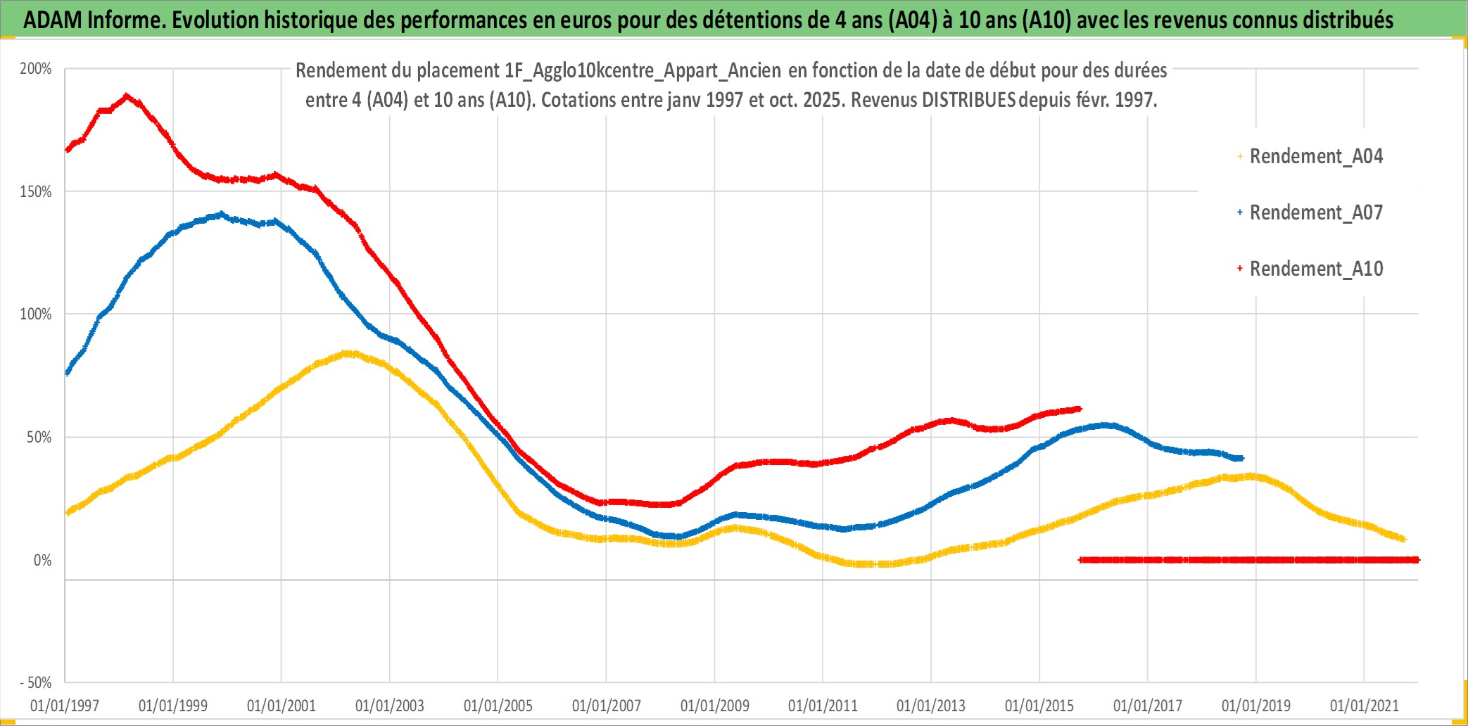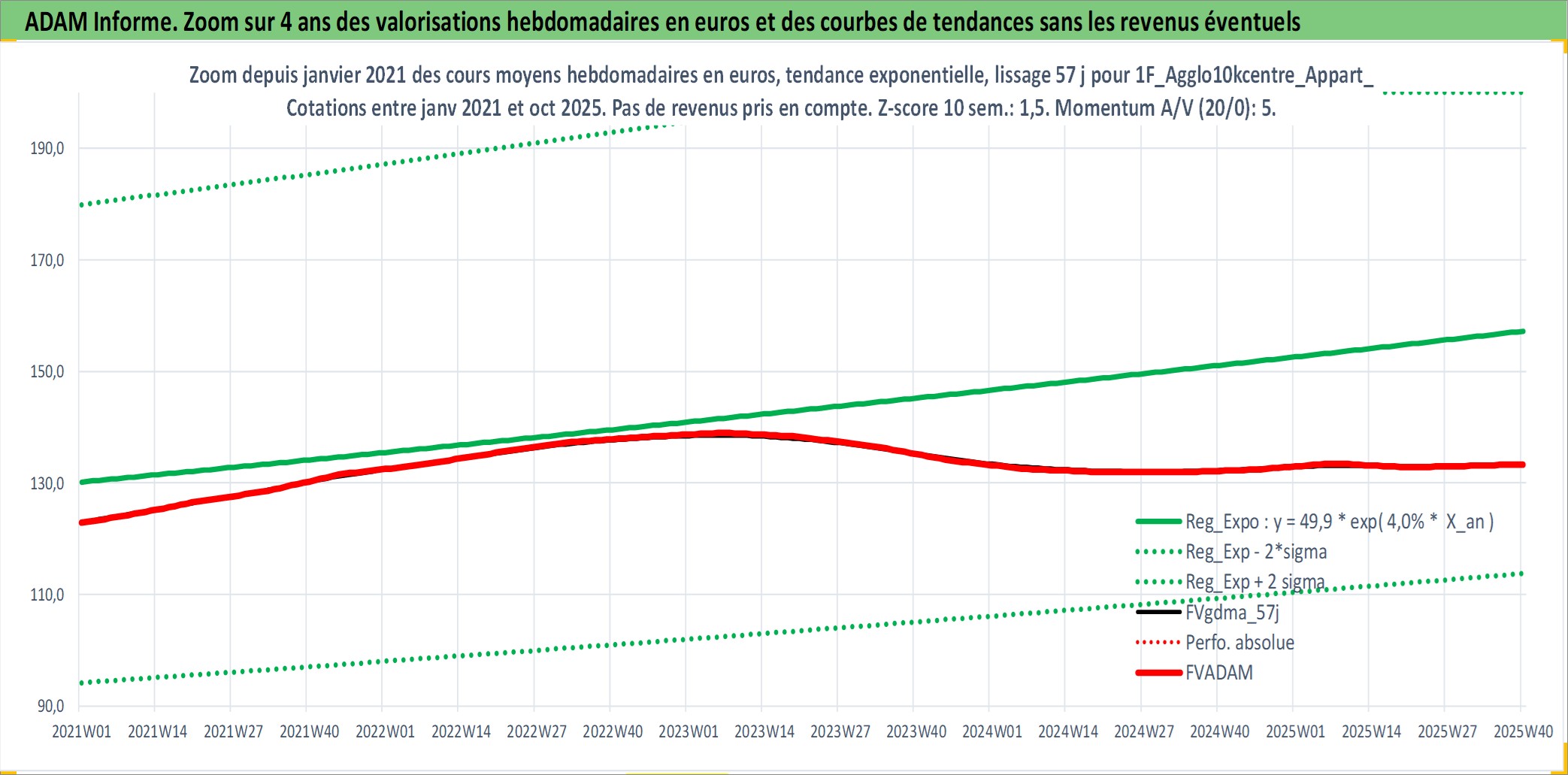 Site dédié aux investisseursPage dédiée sur site financeAnalyse des valorisations hebdomadaires de l'actif 1F_Agglo10kcentre_Appart_Ancien. Cet actif est cote en EUR. Les valorisations couvrent les semaines 1997W01 a 2025W40. Les loyers de cet actif immobilier sont pris egaux a 3,33% annuels de la valeur venale du logement.