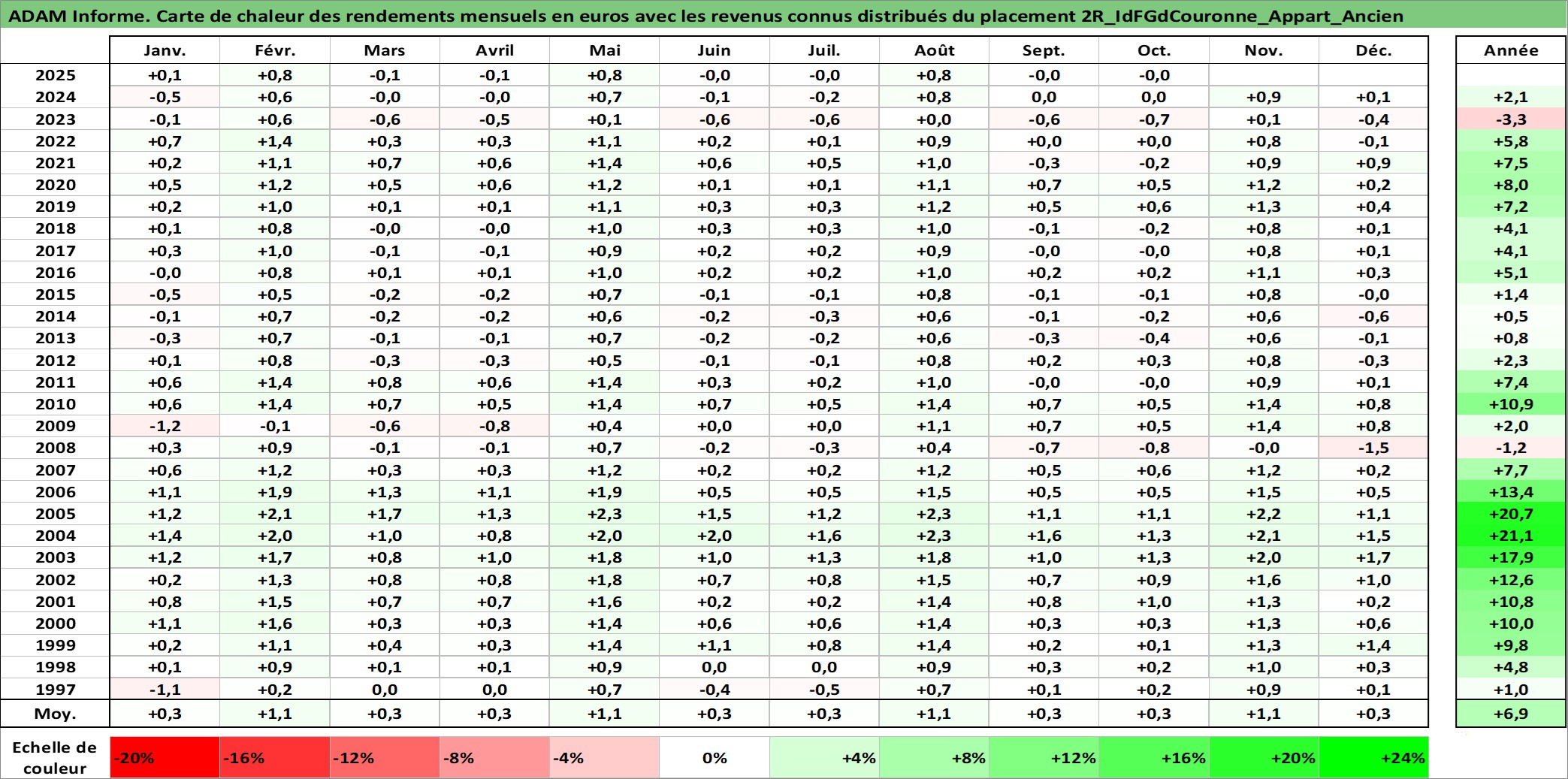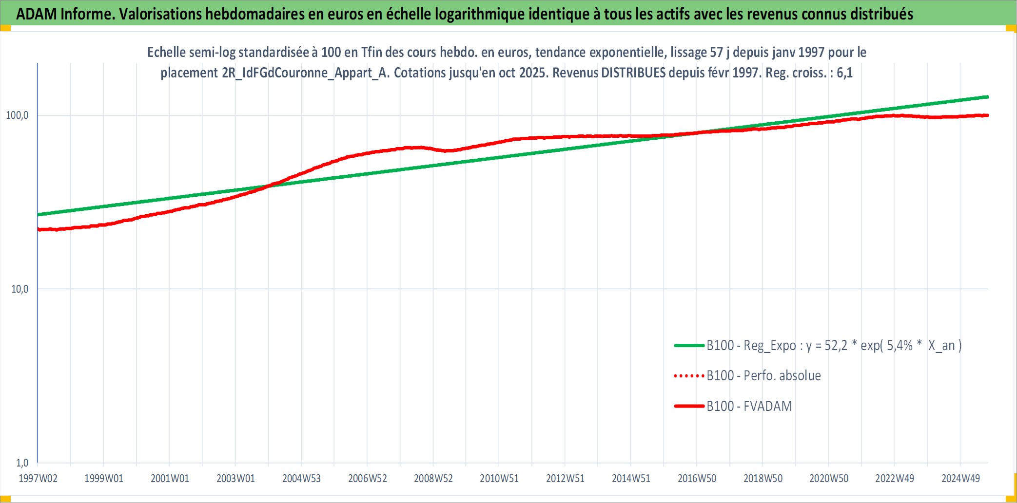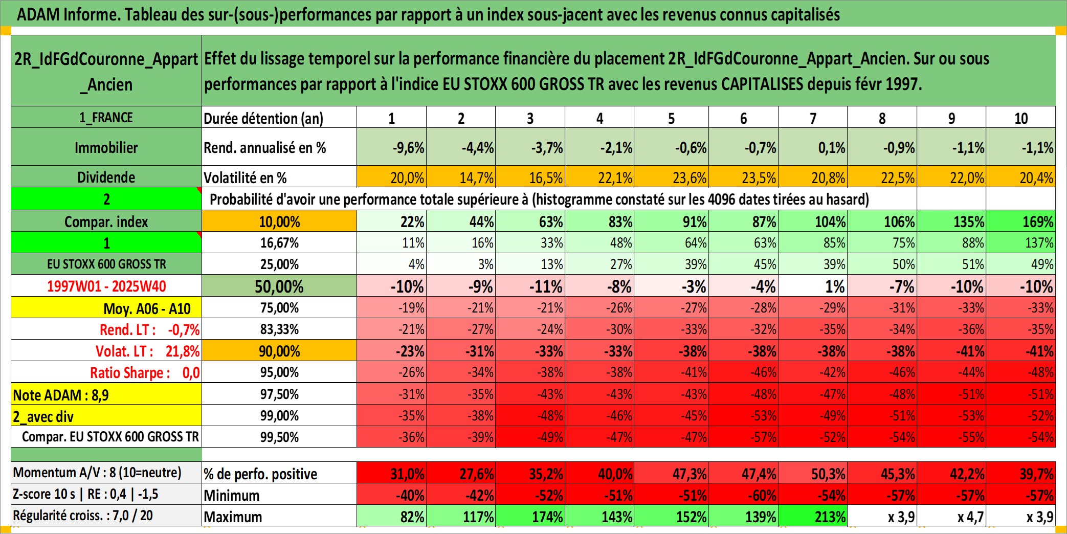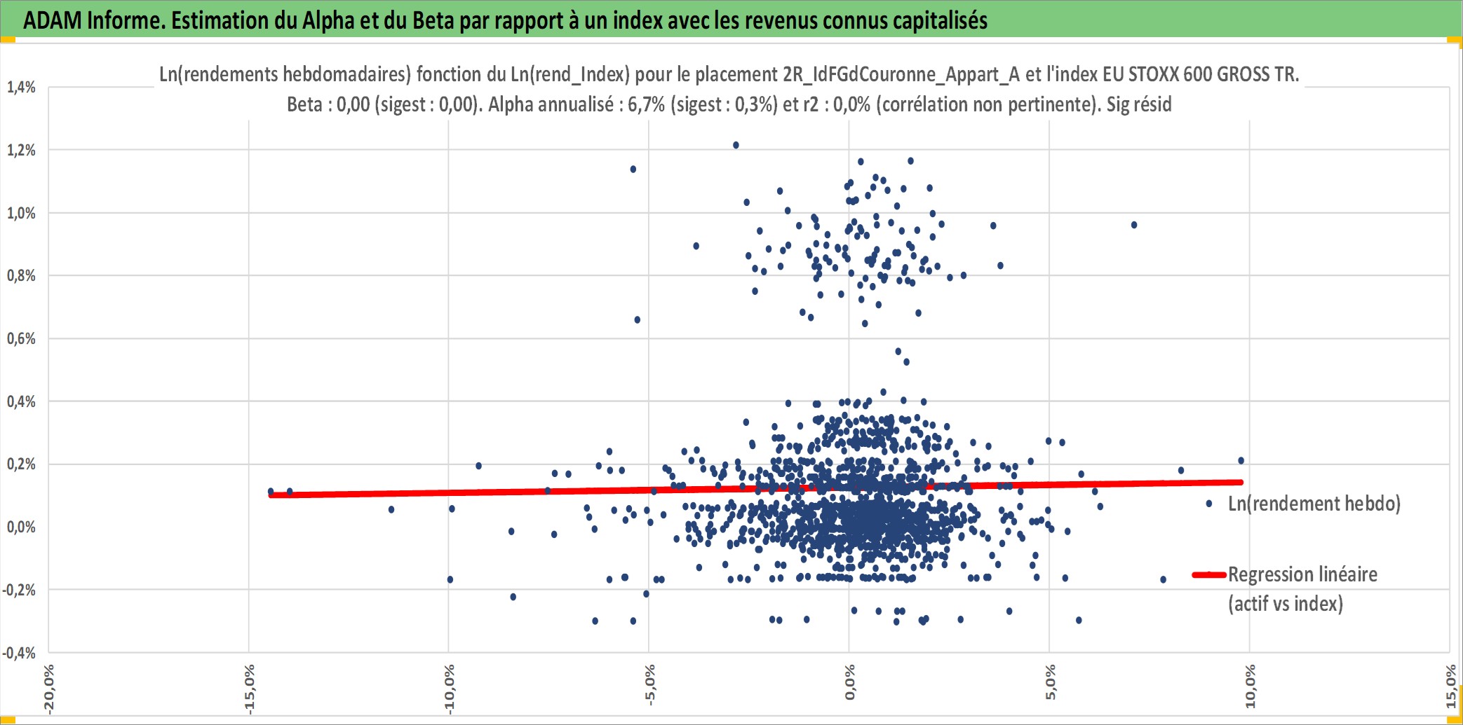 Site dédié aux investisseursPage dédiée sur site financeAnalyse des valorisations hebdomadaires de l'actif 2R_IdFGdCouronne_Appart_Ancien. Cet actif est cote en EUR. Les valorisations couvrent les semaines 1997W01 a 2025W40. Les loyers de cet actif immobilier sont pris egaux a 3,33% annuels de la valeur venale du logement.