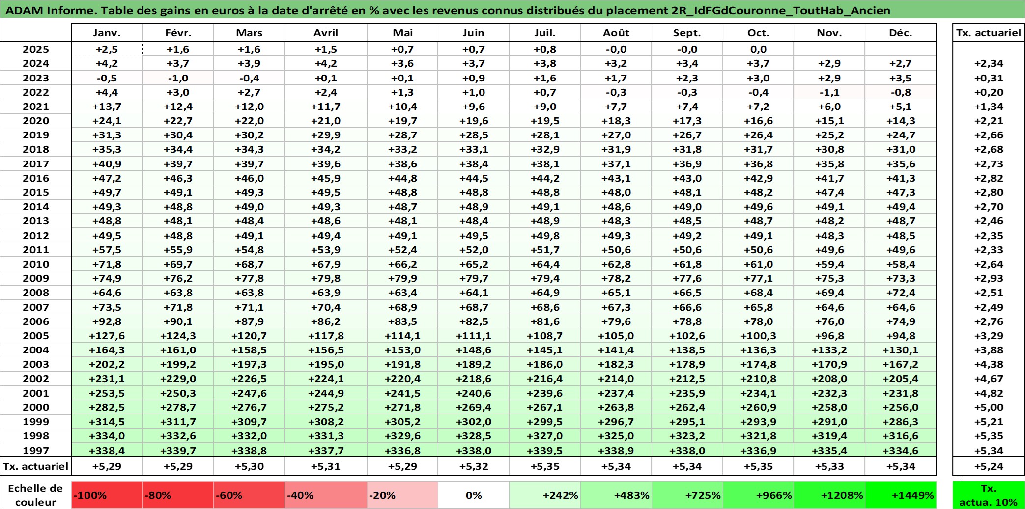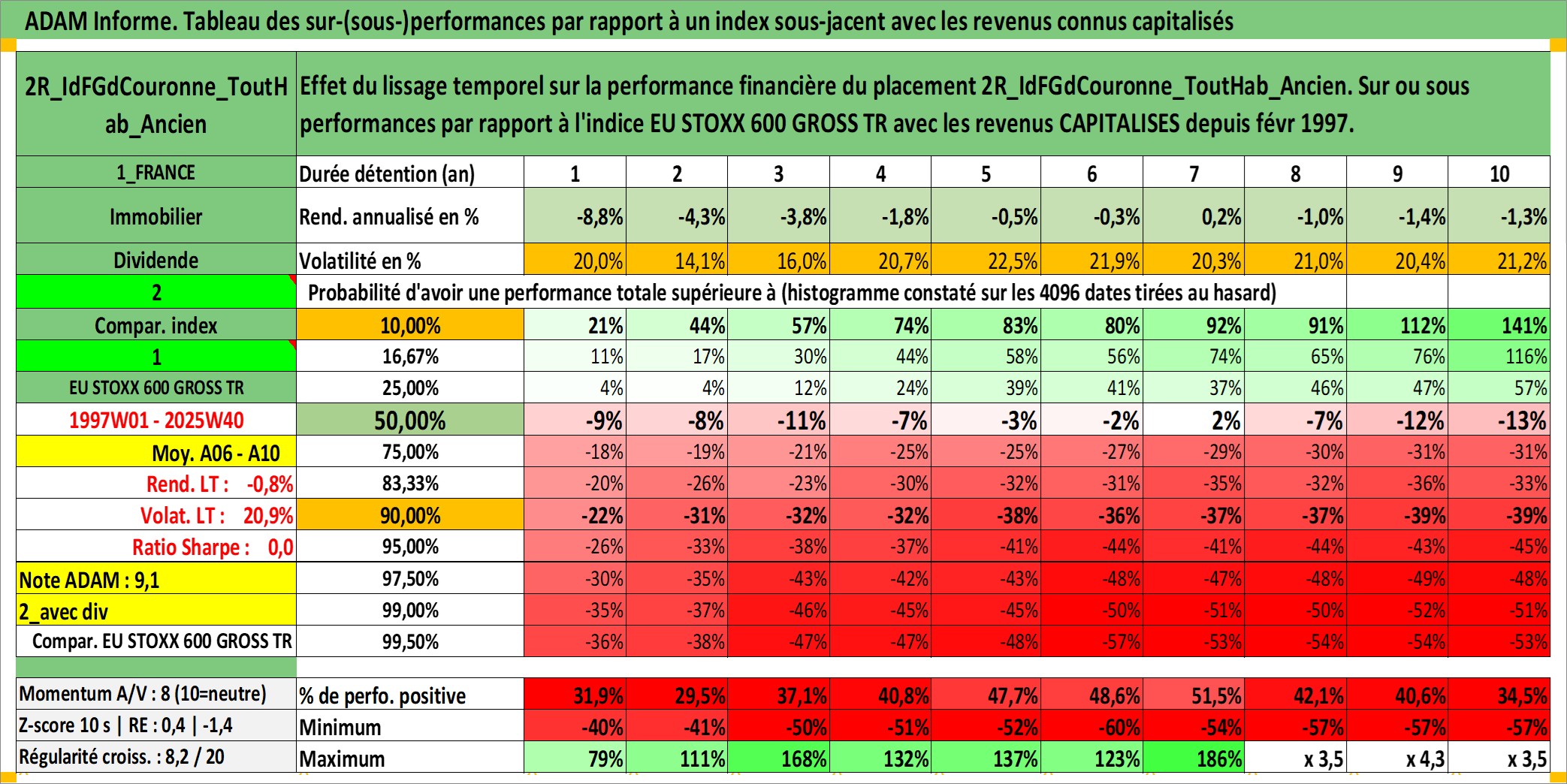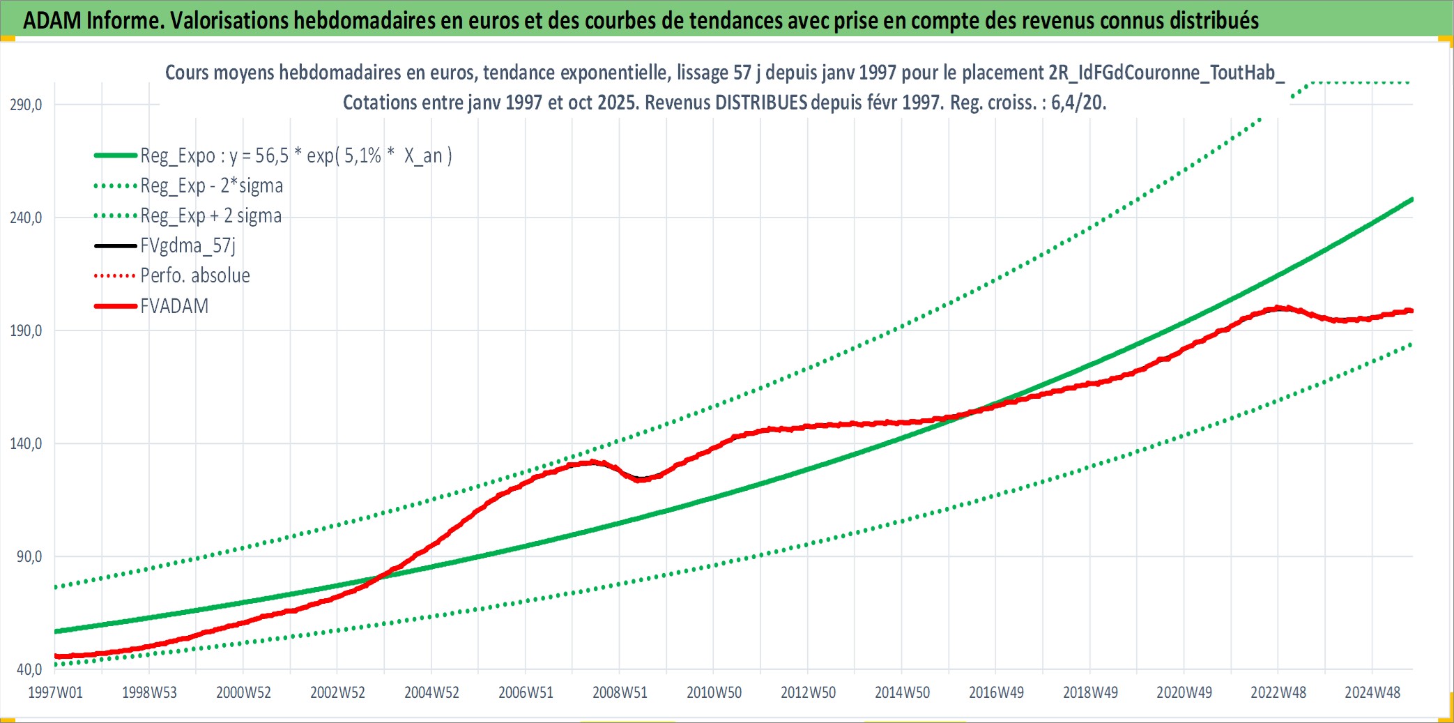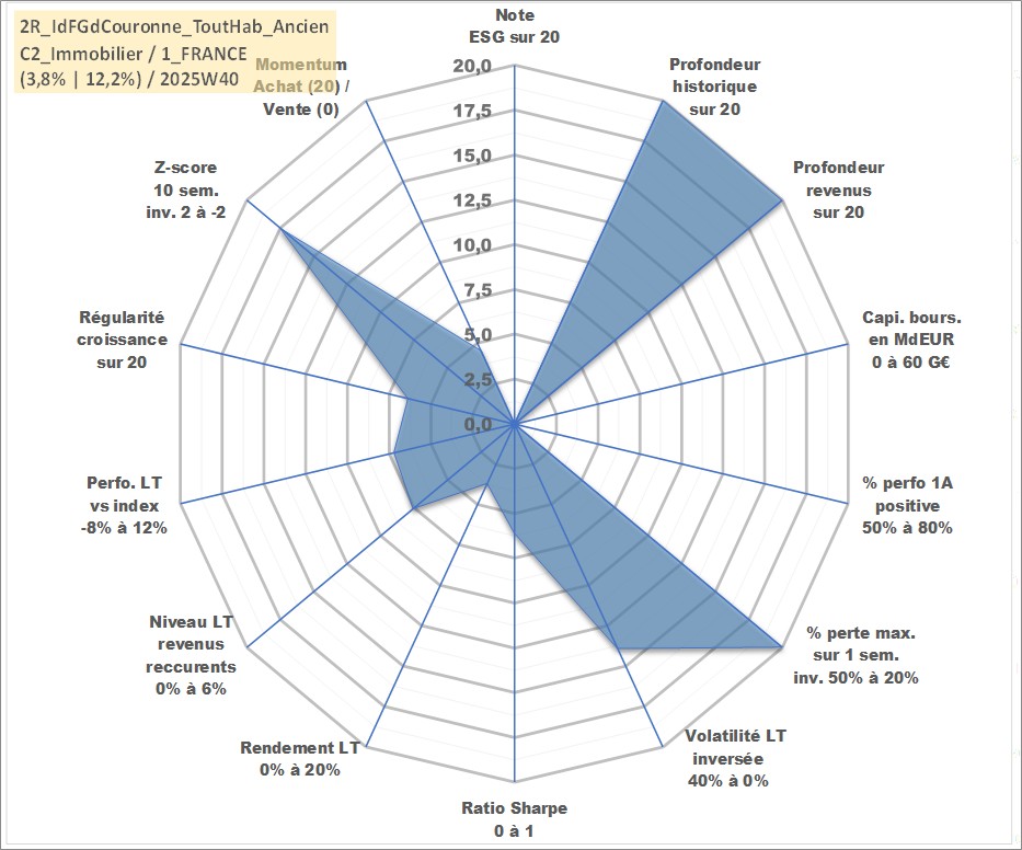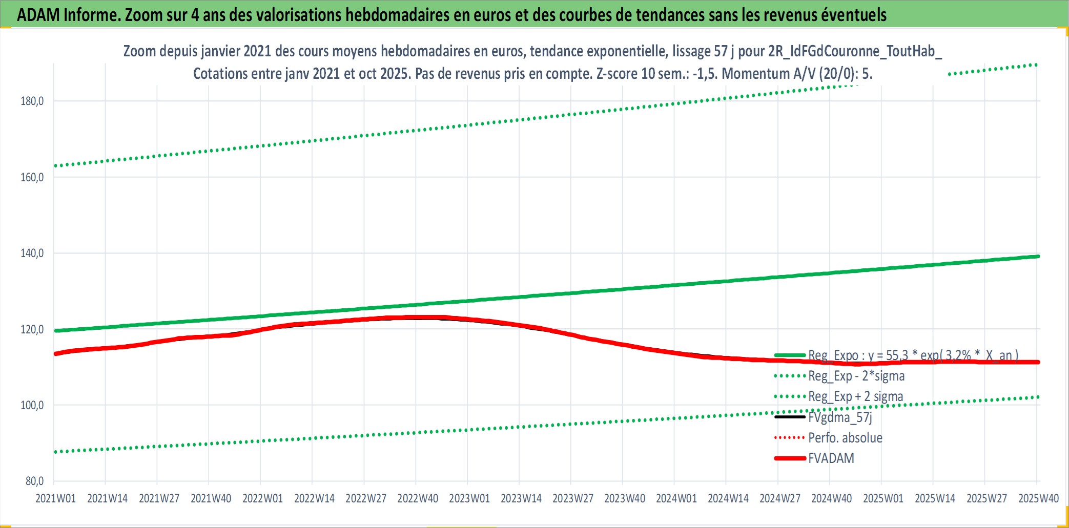 Site dédié aux investisseursPage dédiée sur site financeAnalyse des valorisations hebdomadaires de l'actif 2R_IdFGdCouronne_ToutHab_Ancien. Cet actif est cote en EUR. Les valorisations couvrent les semaines 1997W01 a 2025W40. Les loyers de cet actif immobilier sont pris egaux a 3,33% annuels de la valeur venale du logement.