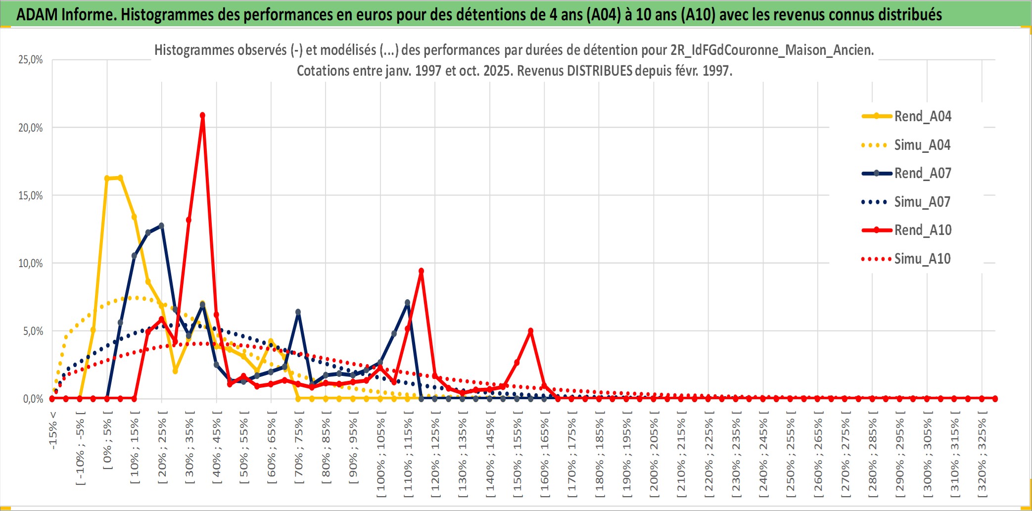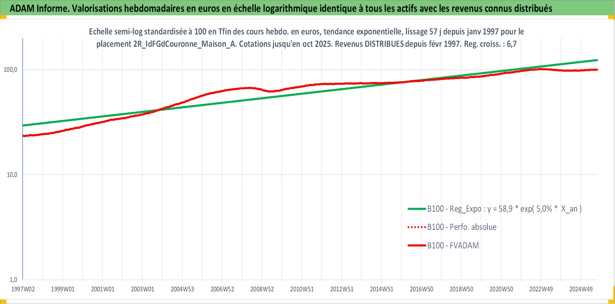 Site dédié aux investisseursPage dédiée sur site financeAnalyse des valorisations hebdomadaires de l'actif 2R_IdFGdCouronne_Maison_Ancien. Cet actif est cote en EUR. Les valorisations couvrent les semaines 1997W01 a 2025W40. Les loyers de cet actif immobilier sont pris egaux a 3,33% annuels de la valeur venale du logement.