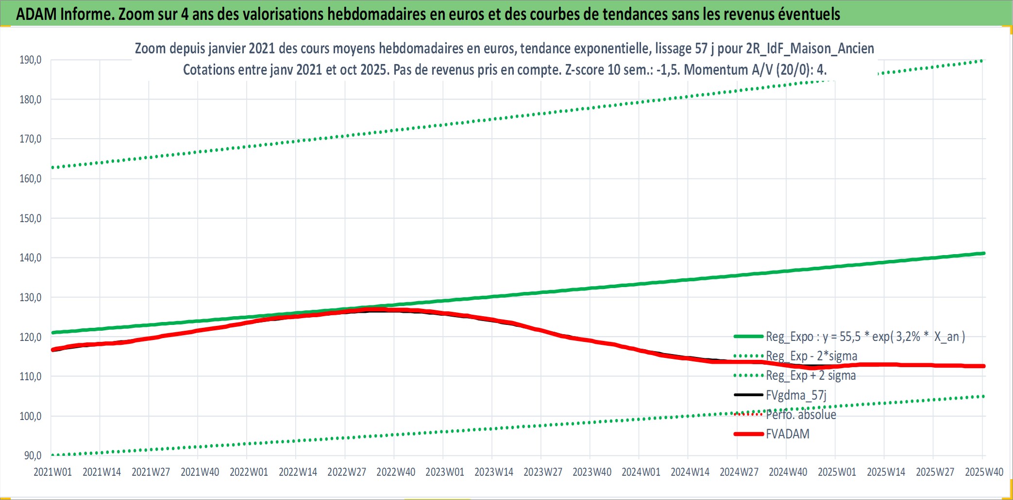 Site dédié aux investisseursPage dédiée sur site financeAnalyse des valorisations hebdomadaires de l'actif 2R_IdF_Maison_Ancien. Cet actif est cote en EUR. Les valorisations couvrent les semaines 1997W01 a 2025W40. Les loyers de cet actif immobilier sont pris egaux a 3,33% annuels de la valeur venale du logement.