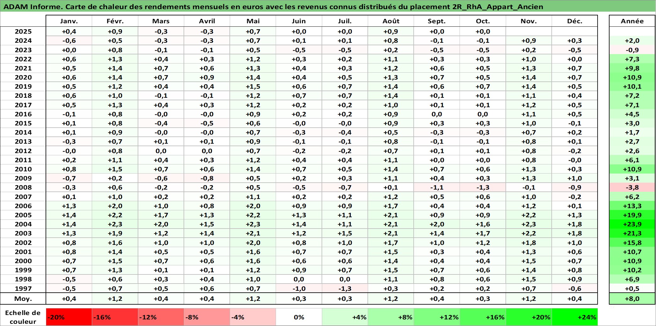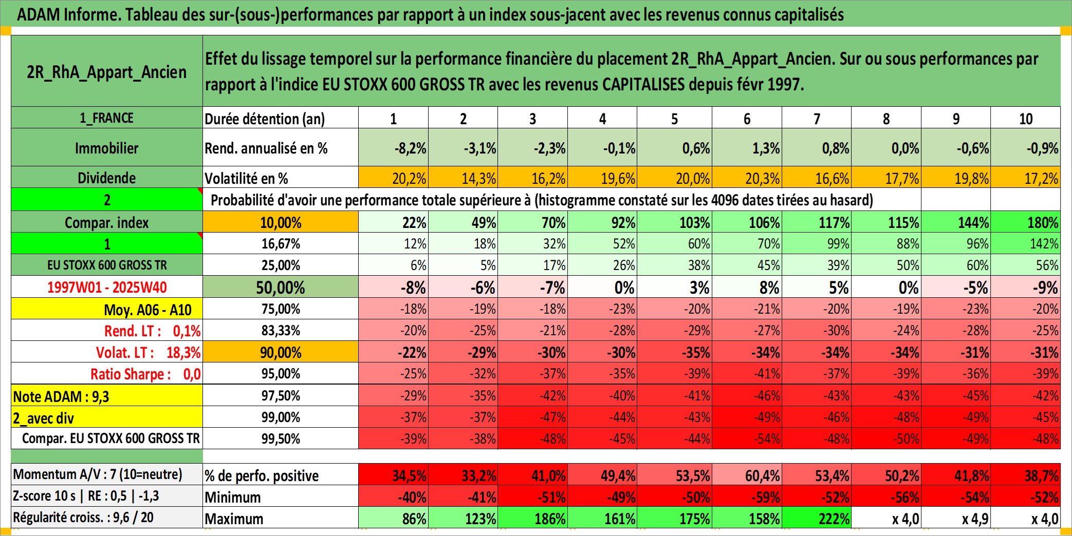 Site dédié aux investisseursPage dédiée sur site financeAnalyse des valorisations hebdomadaires de l'actif 2R_RhA_Appart_Ancien. Cet actif est cote en EUR. Les valorisations couvrent les semaines 1997W01 a 2025W40. Les loyers de cet actif immobilier sont pris egaux a 3,33% annuels de la valeur venale du logement.