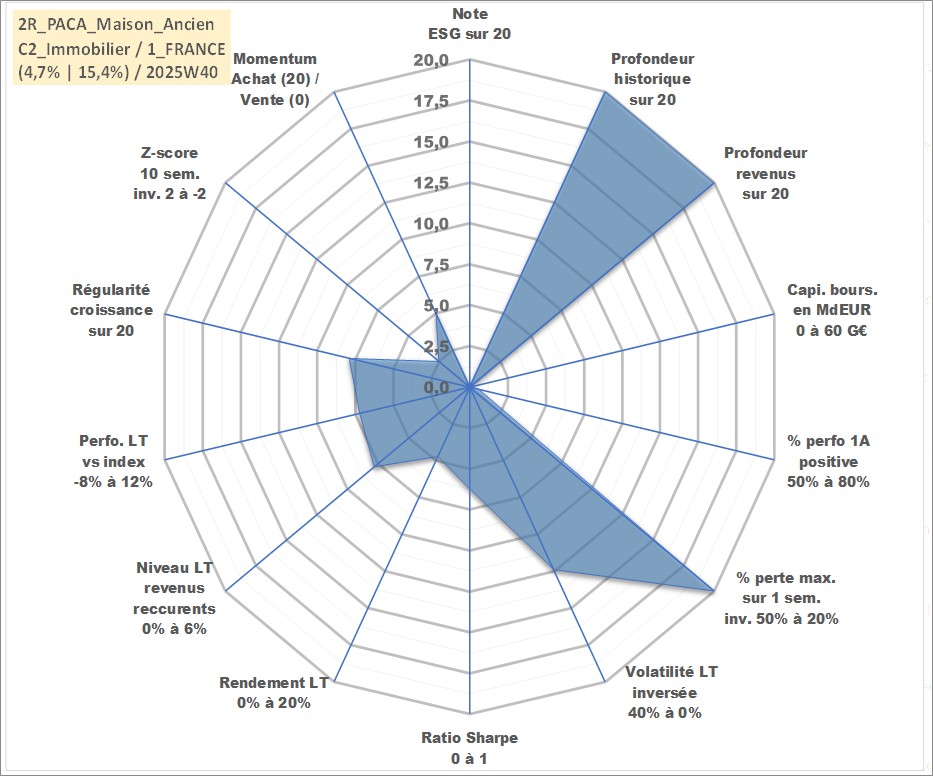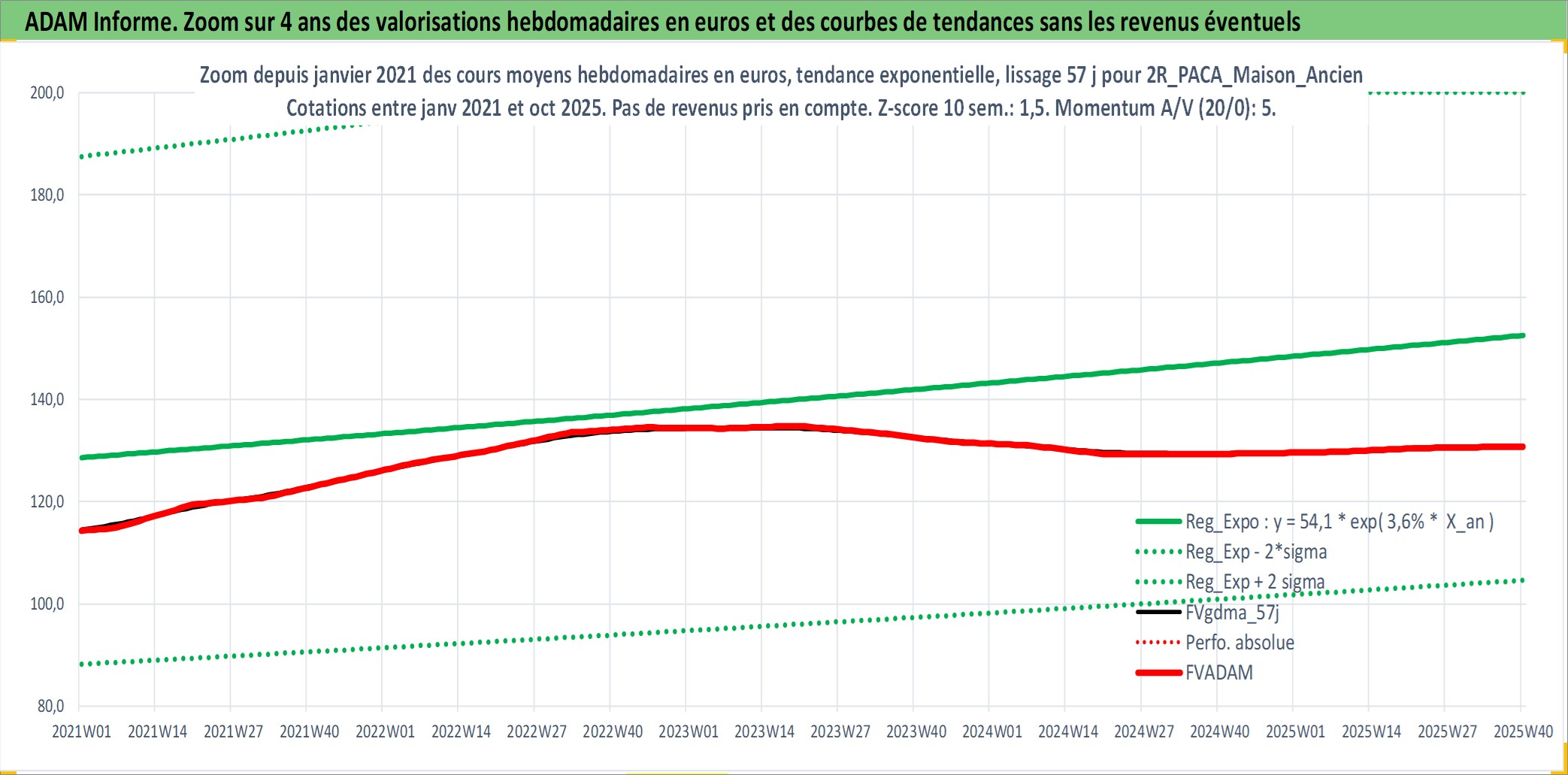 Site dédié aux investisseursPage dédiée sur site financeAnalyse des valorisations hebdomadaires de l'actif 2R_PACA_Maison_Ancien. Cet actif est cote en EUR. Les valorisations couvrent les semaines 1997W01 a 2025W40. Les loyers de cet actif immobilier sont pris egaux a 3,33% annuels de la valeur venale du logement.