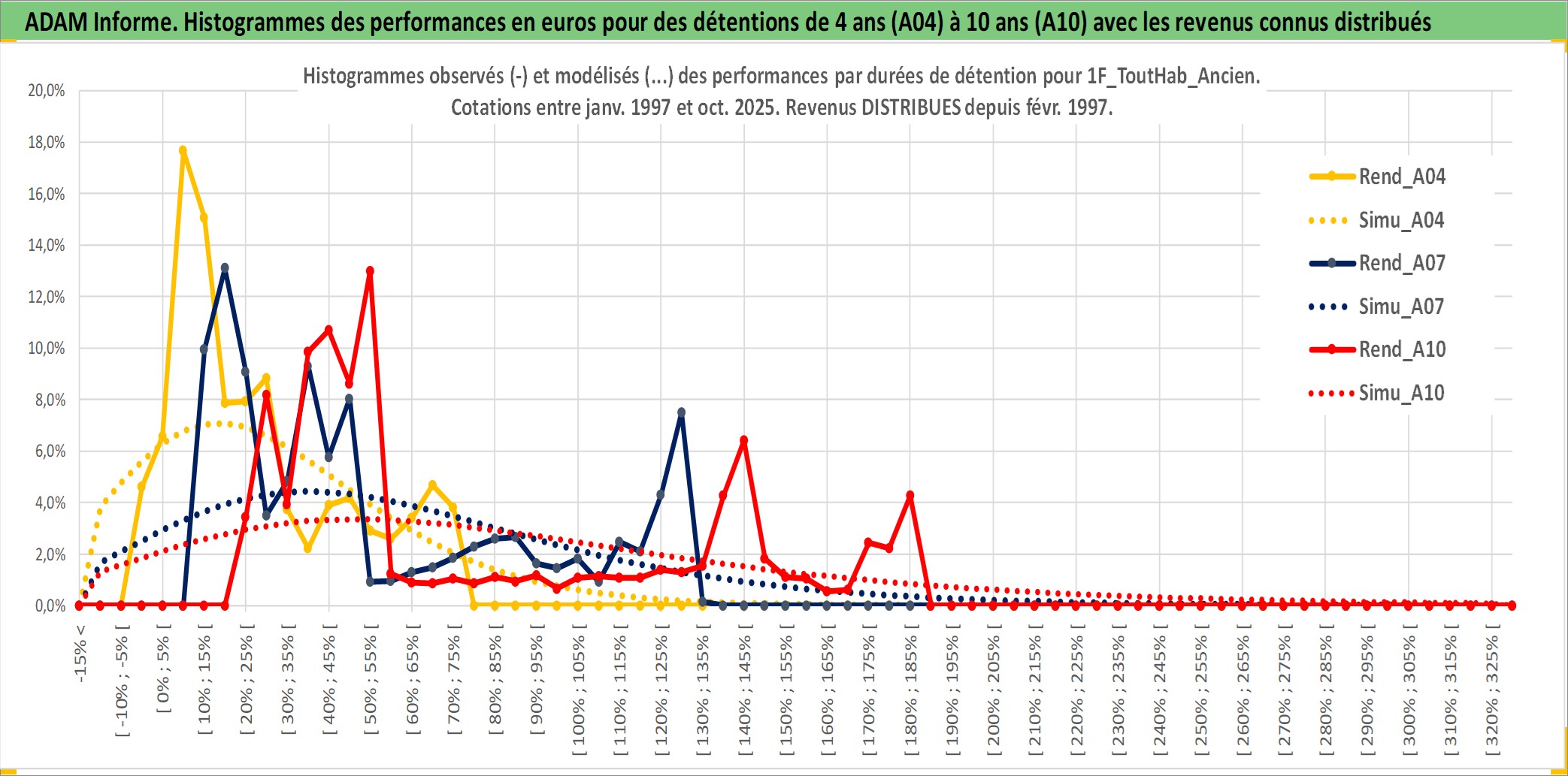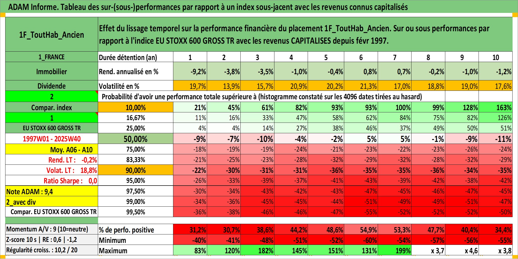 Site dédié aux investisseursPage dédiée sur site financeAnalyse des valorisations hebdomadaires de l'actif 1F_ToutHab_Ancien. Cet actif est cote en EUR. Les valorisations couvrent les semaines 1997W01 a 2025W40. Les loyers de cet actif immobilier sont pris egaux a 3,33% annuels de la valeur venale du logement.