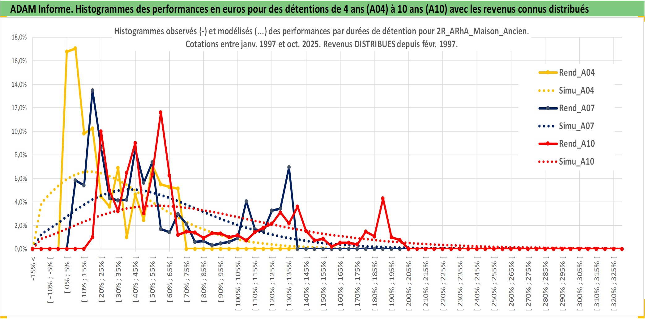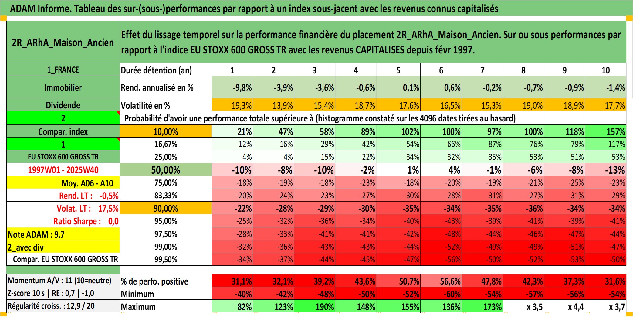 Site dédié aux investisseursPage dédiée sur site financeAnalyse des valorisations hebdomadaires de l'actif 2R_ARhA_Maison_Ancien. Cet actif est cote en EUR. Les valorisations couvrent les semaines 1997W01 a 2025W40. Les loyers de cet actif immobilier sont pris egaux a 3,33% annuels de la valeur venale du logement.
