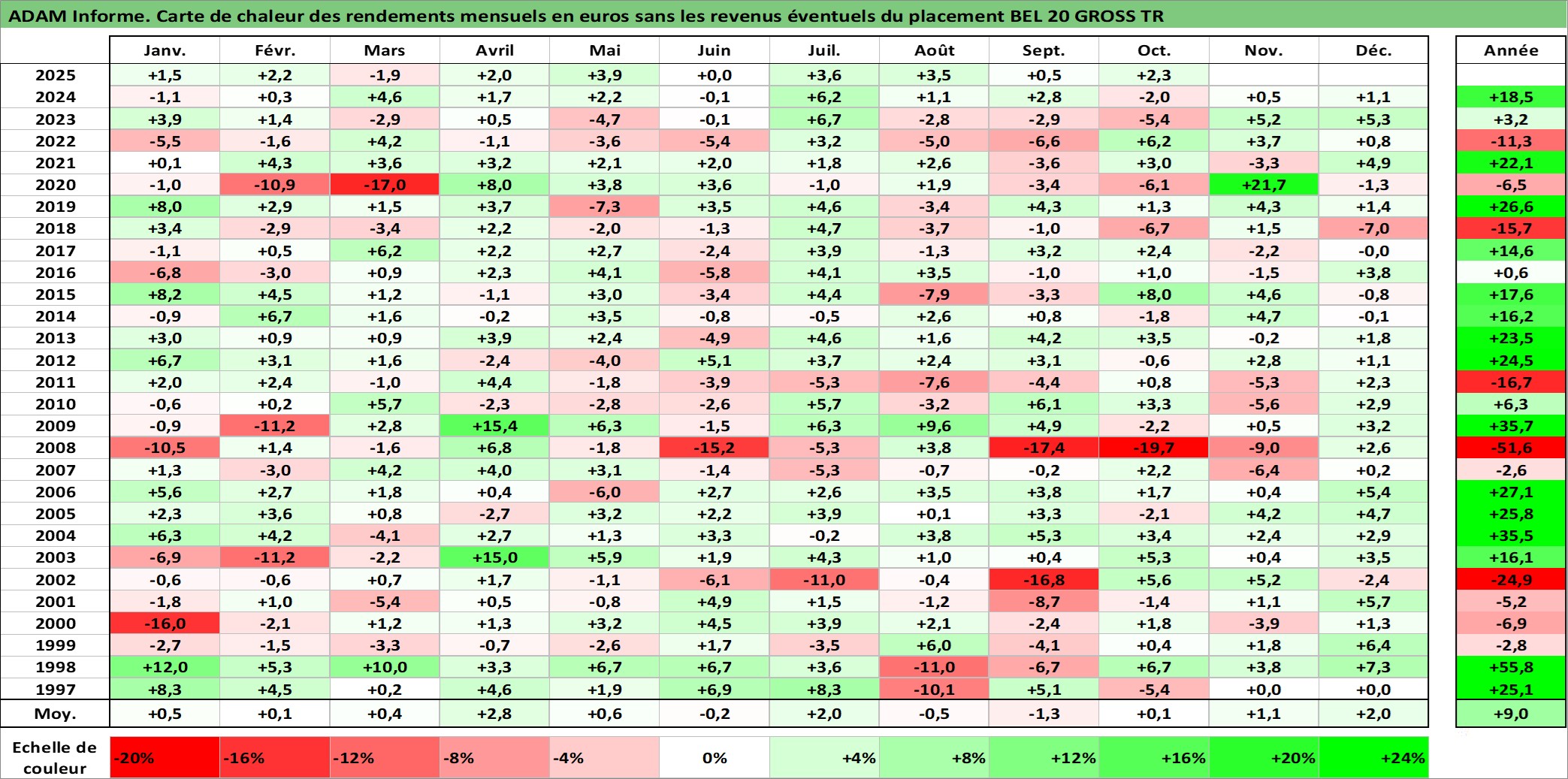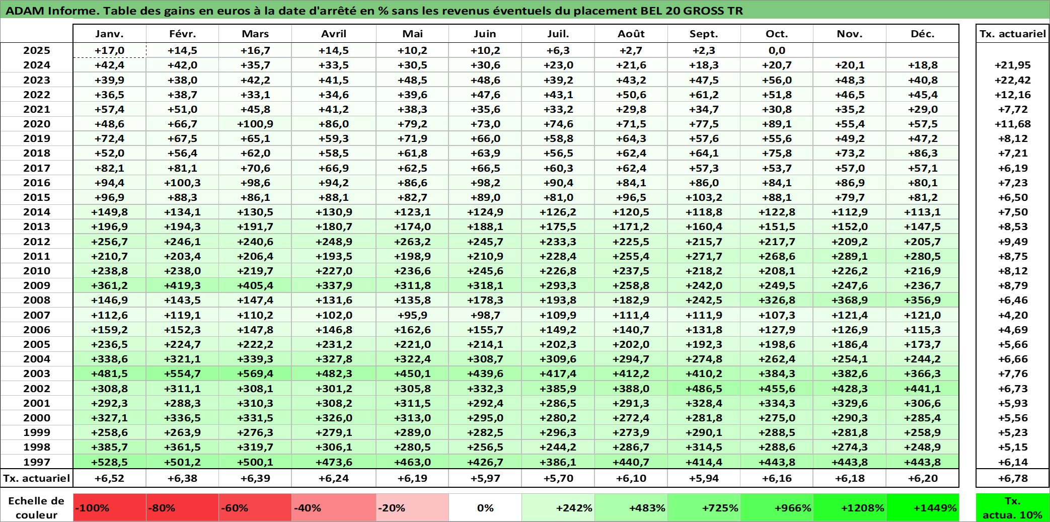 Site dédié aux investisseursPage dédiée sur site financeAnalyse des valorisations hebdomadaires de l'actif BEL 20 GROSS TR. Cet actif est cote en EUR. Les valorisations couvrent les semaines 1997W01 a 2025W40. Les revenus de cet actif financier ne sont pas connus car non existants ou non disponibles sur le site Yahoo Finance. La note ESG de cet actif n'est pas connue.