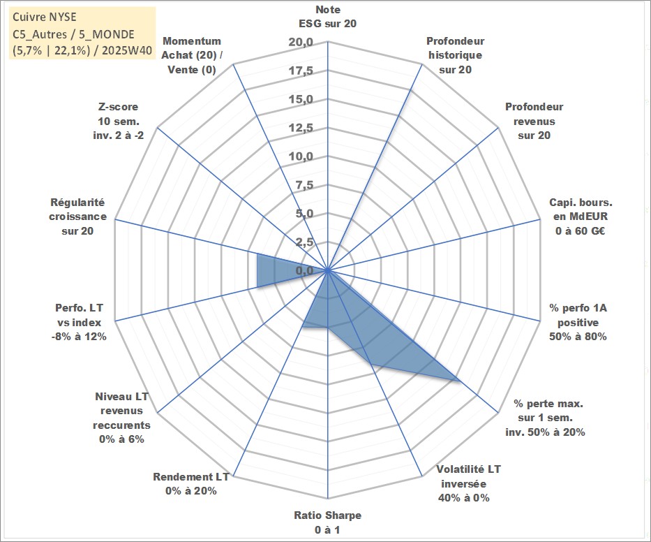 Site dédié aux investisseursPage dédiée sur site financeAnalyse des valorisations hebdomadaires de l'actif Cuivre NYSE. Cet actif est cote en USD. Les valorisations sont en contrevaleur EURO et couvrent les semaines 2000W35 a 2025W40. Les revenus de cet actif financier ne sont pas connus car non existants ou non disponibles sur le site Yahoo Finance. La note ESG de cet actif n'est pas connue.