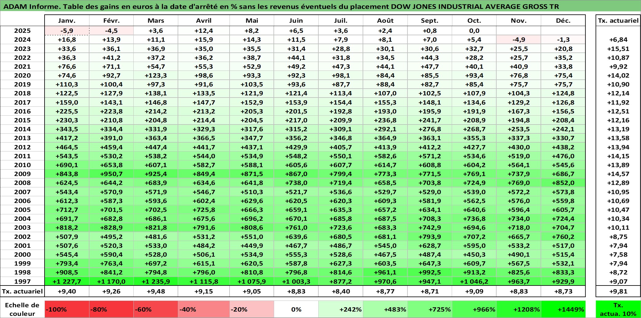 Site dédié aux investisseursPage dédiée sur site financeAnalyse des valorisations hebdomadaires de l'actif DOW JONES INDUSTRIAL AVERAGE GROSS TR. Cet actif est cote en USD. Les valorisations sont en contrevaleur EURO et couvrent les semaines 1997W01 a 2025W14. Les revenus de cet actif financier ne sont pas connus car non existants ou non disponibles sur le site Yahoo Finance. La note ESG de cet actif n'est pas connue.