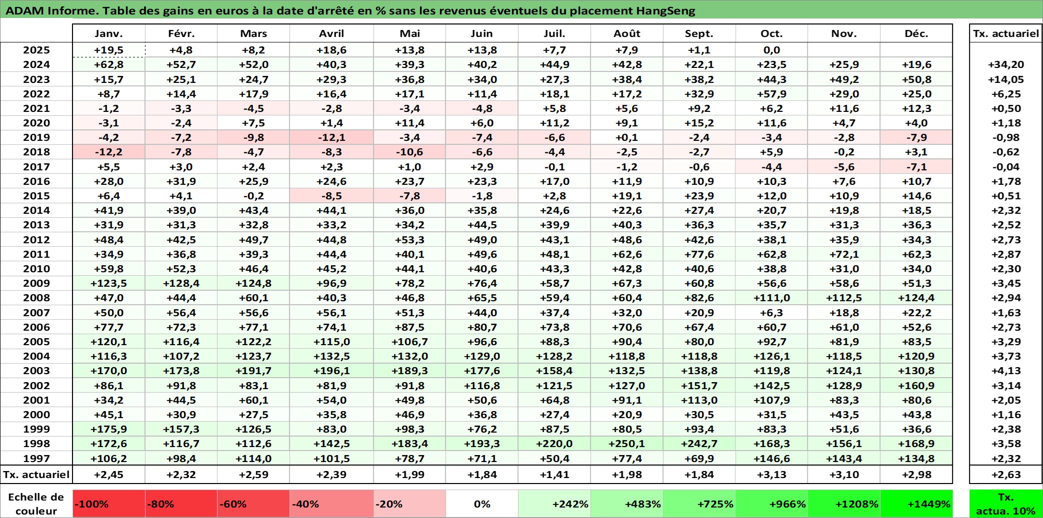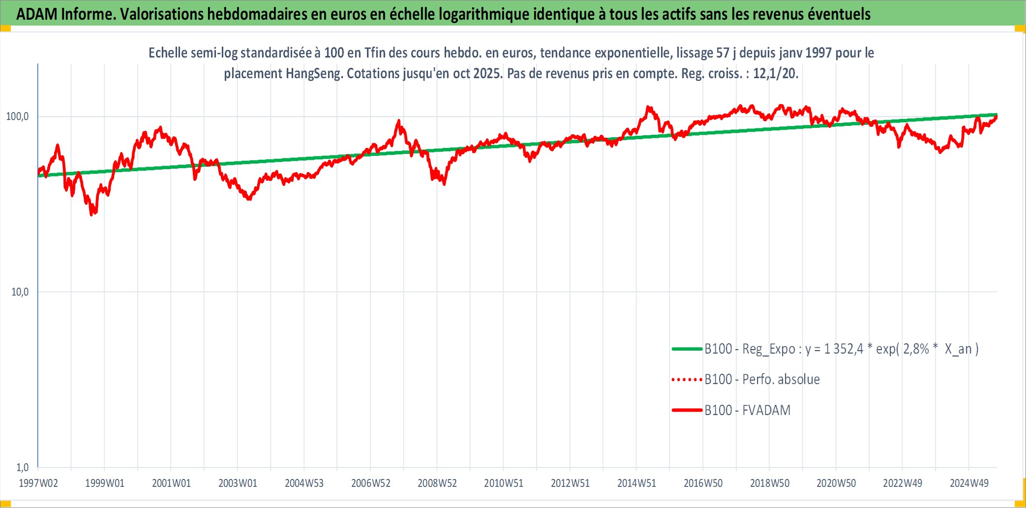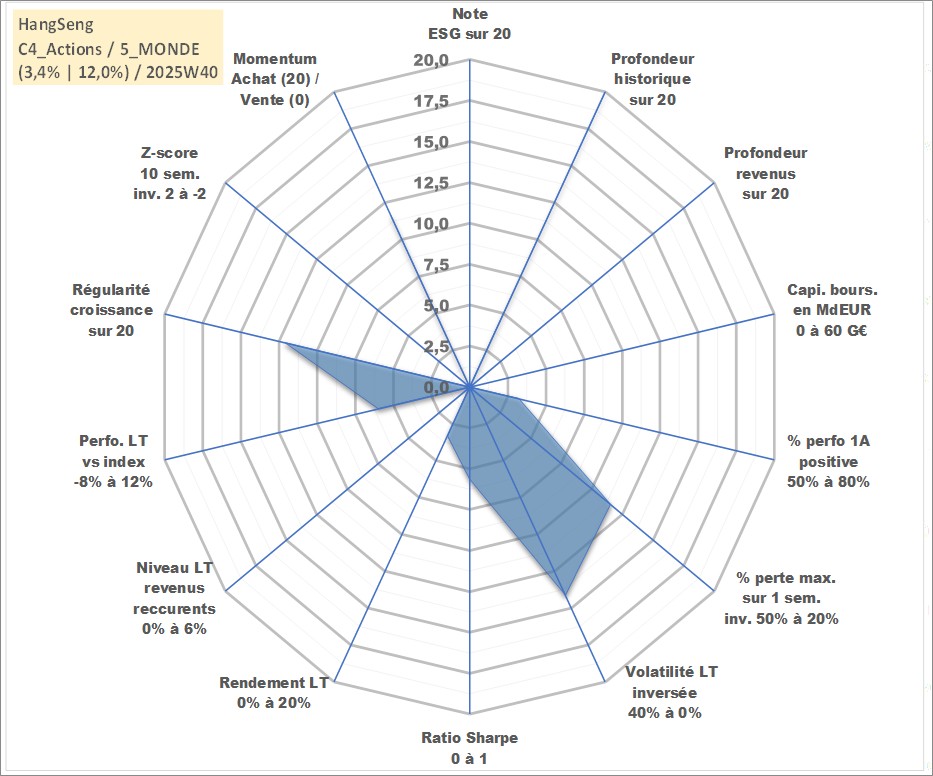 Site dédié aux investisseursPage dédiée sur site financeAnalyse des valorisations hebdomadaires de l'actif HangSeng. Cet actif est cote en HKD. Les valorisations sont en contrevaleur EURO et couvrent les semaines 1997W01 a 2025W40. Les revenus de cet actif financier ne sont pas connus car non existants ou non disponibles sur le site Yahoo Finance. La note ESG de cet actif n'est pas connue.