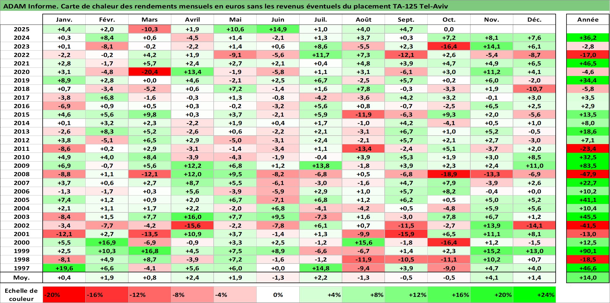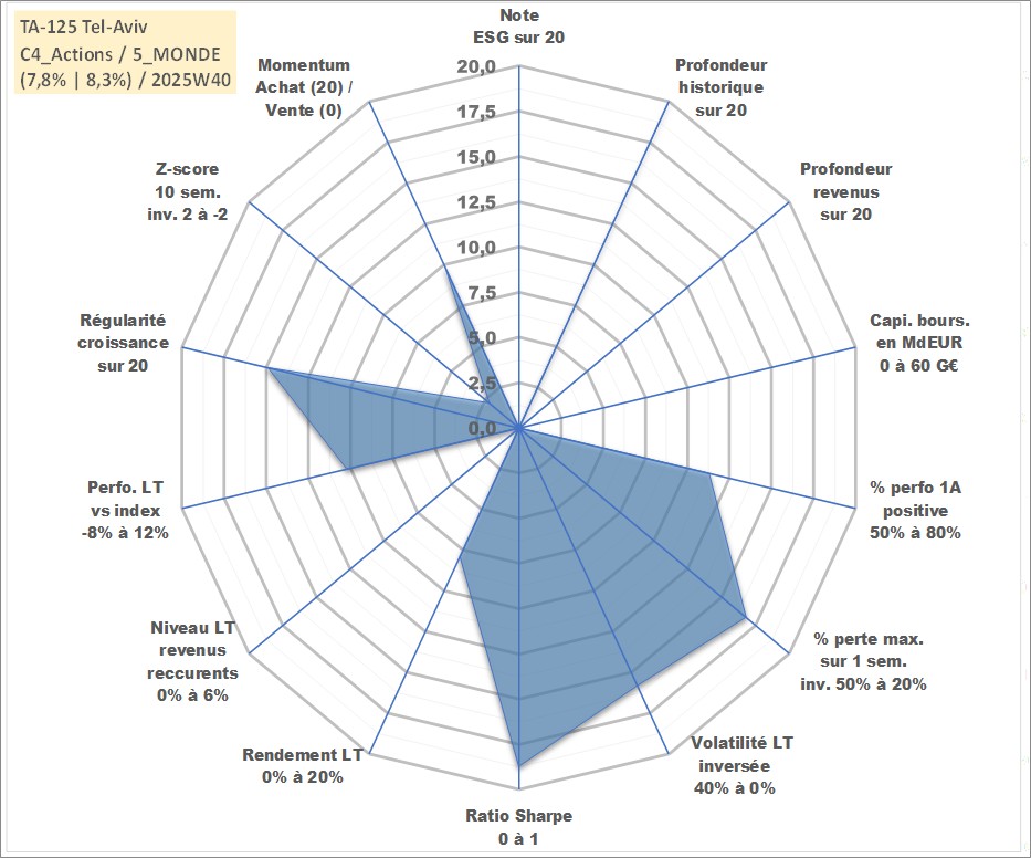 Site dédié aux investisseursPage dédiée sur site financeAnalyse des valorisations hebdomadaires de l'actif TA-125 Tel-Aviv. Cet actif est cote en ILS. Les valorisations sont en contrevaleur EURO et couvrent les semaines 1997W01 a 2025W40. Les revenus de cet actif financier ne sont pas connus car non existants ou non disponibles sur le site Yahoo Finance. La note ESG de cet actif n'est pas connue.