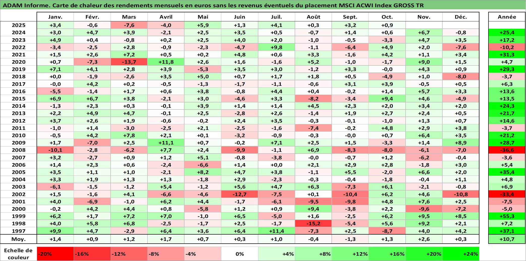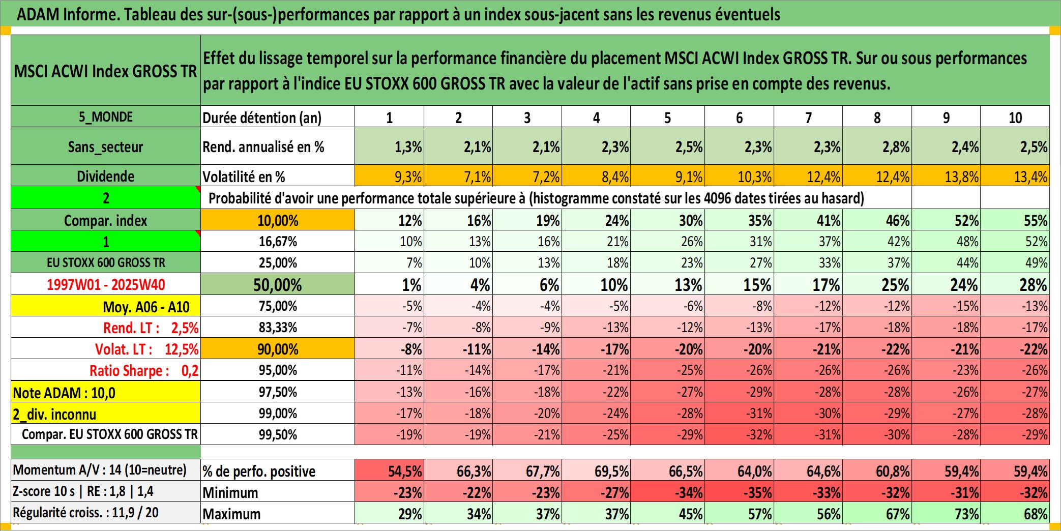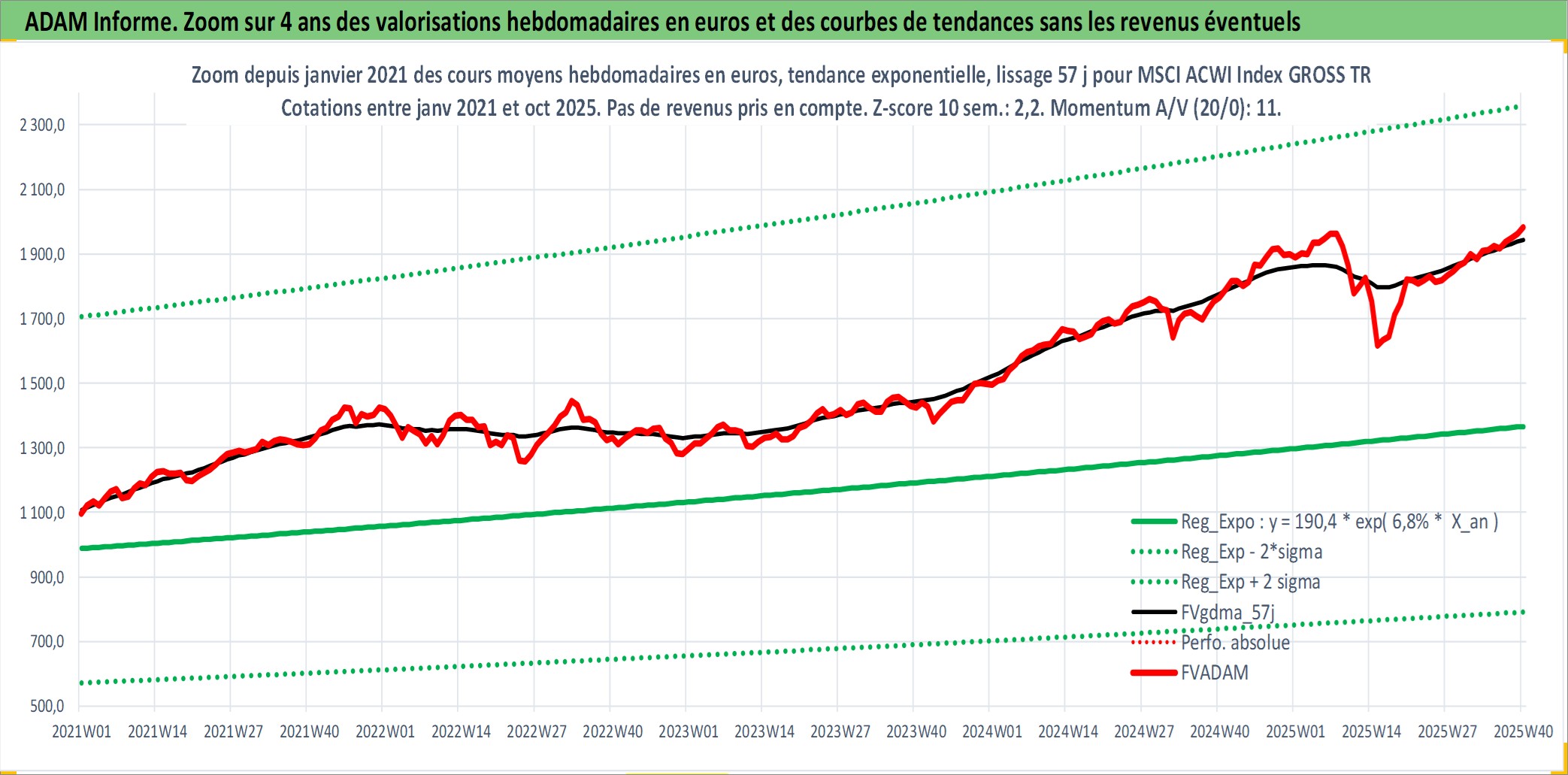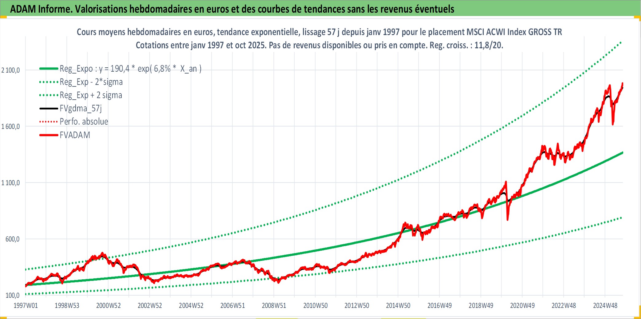 Site dédié aux investisseursPage dédiée sur site financeAnalyse des valorisations hebdomadaires de l'actif MSCI ACWI Index GROSS TR. Cet actif est cote en USD. Les valorisations sont en contrevaleur EURO et couvrent les semaines 1997W01 a 2025W40. Les revenus de cet actif financier ne sont pas connus car non existants ou non disponibles sur le site Yahoo Finance. La note ESG de cet actif n'est pas connue.