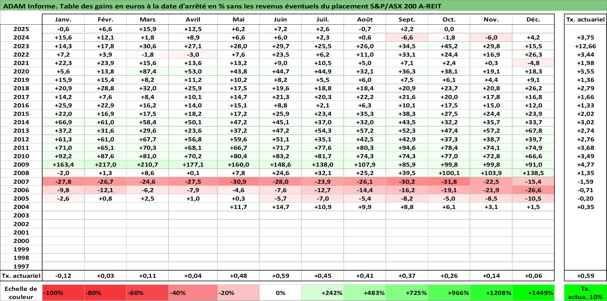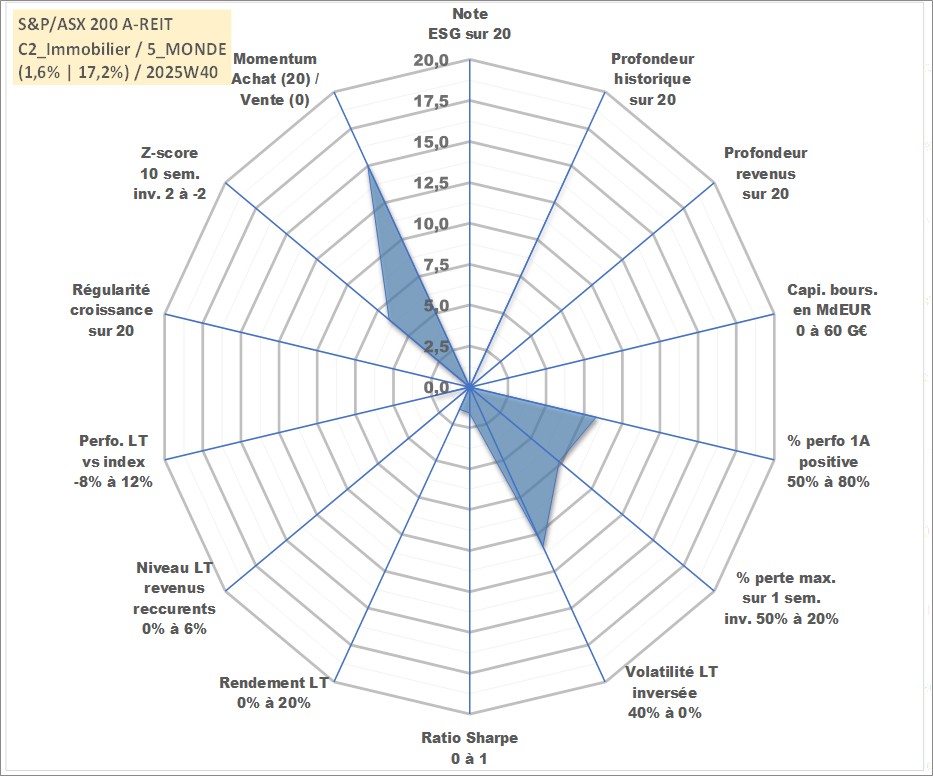 Site dédié aux investisseursPage dédiée sur site financeAnalyse des valorisations hebdomadaires de l'actif S&P/ASX 200 A-REIT. Cet actif est cote en AUD. Les valorisations sont en contrevaleur EURO et couvrent les semaines 2004W19 a 2025W40. Les revenus de cet actif financier ne sont pas connus car non existants ou non disponibles sur le site Yahoo Finance. La note ESG de cet actif n'est pas connue.
