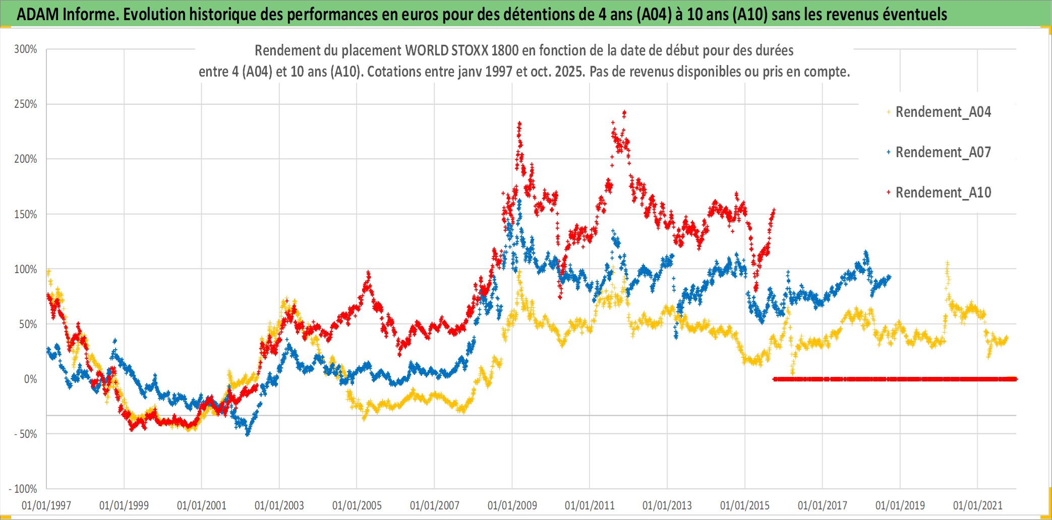 Site dédié aux investisseursPage dédiée sur site financeAnalyse des valorisations hebdomadaires de l'actif WORLD STOXX 1800. Cet actif est cote en USD. Les valorisations sont en contrevaleur EURO et couvrent les semaines 1997W01 a 2025W40. Les revenus de cet actif financier ne sont pas connus car non existants ou non disponibles sur le site Yahoo Finance. La note ESG de cet actif n'est pas connue.