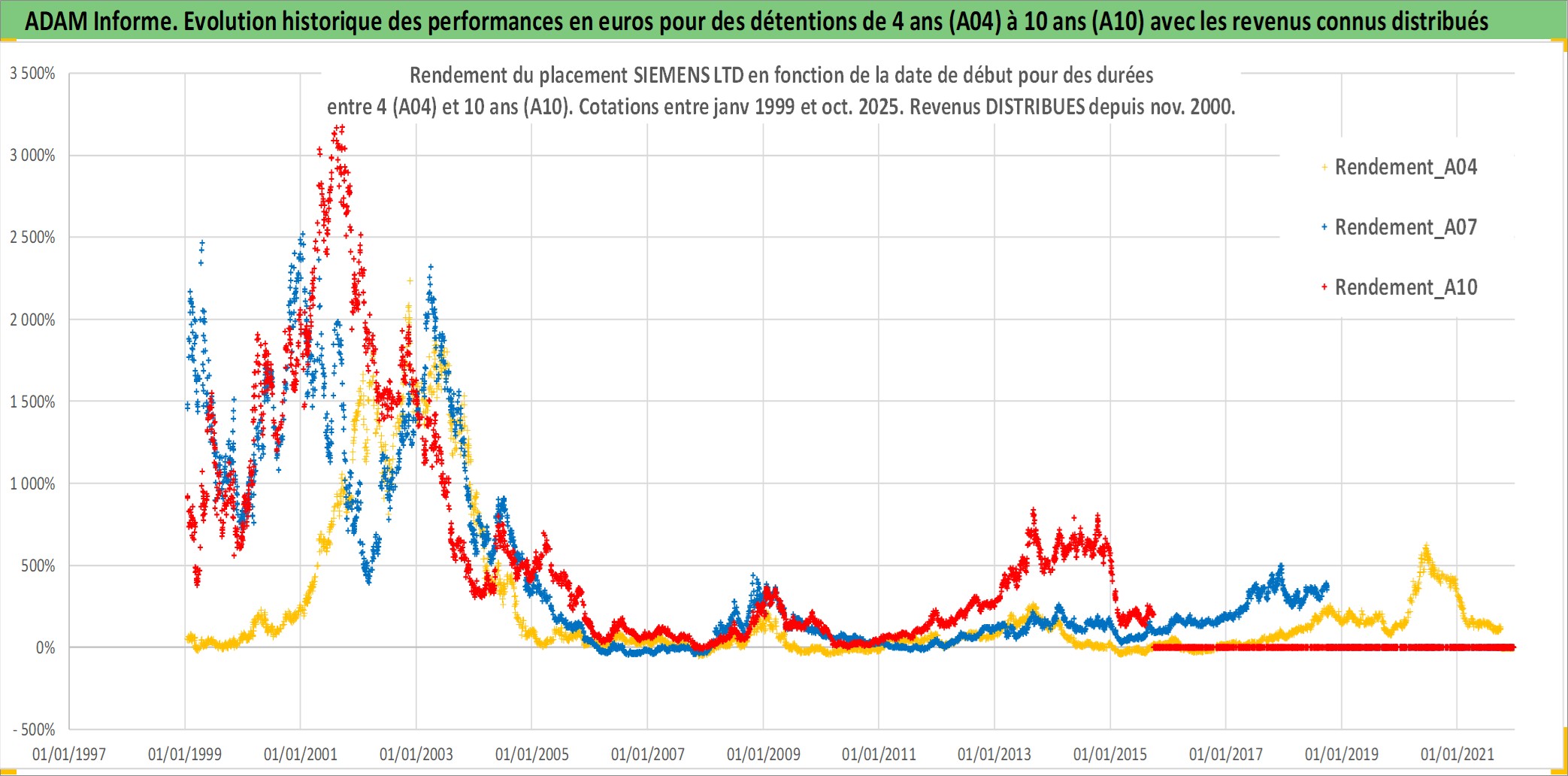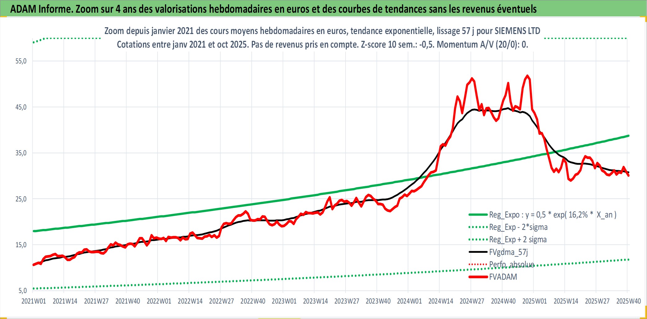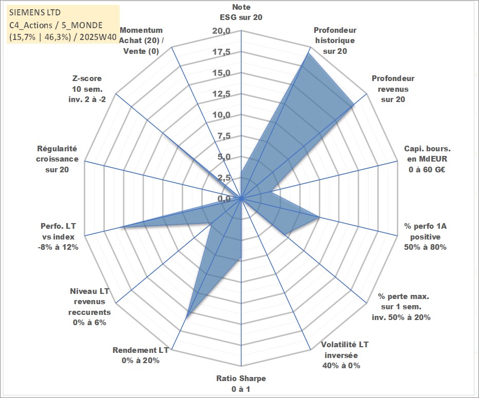 Site dédié aux investisseursPage dédiée sur site financeAnalyse des valorisations hebdomadaires de l'action SIEMENS LTD. Cet actif est cote en INR. Les valorisations sont en contrevaleur EURO et couvrent les semaines 1999W01 a 2025W40. Les revenus de cet actif financier sont pris en compte depuis la semaine 2000W46. La note globale ESG de cet actif est estimee a 3.0 (apres rebasage entre 0 et 20).