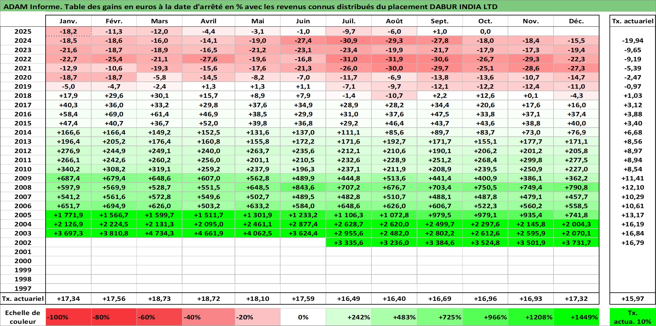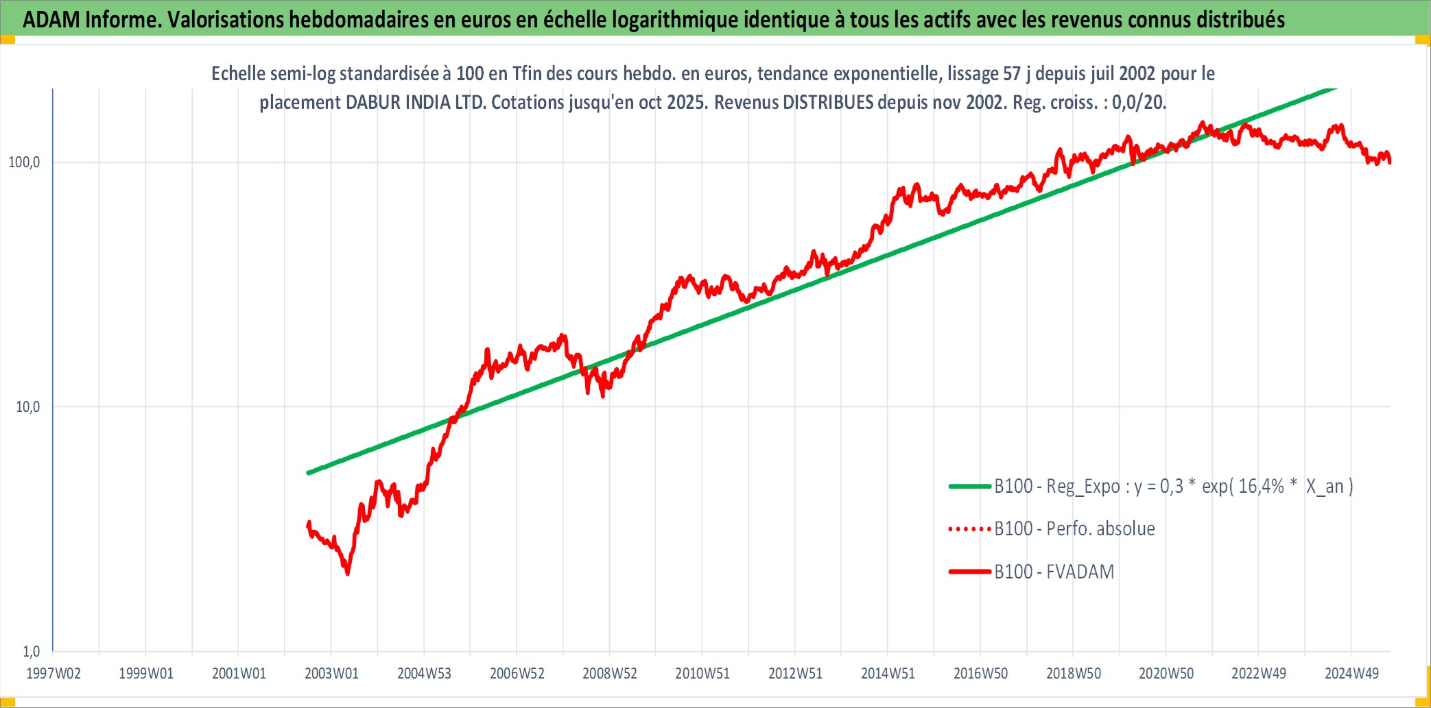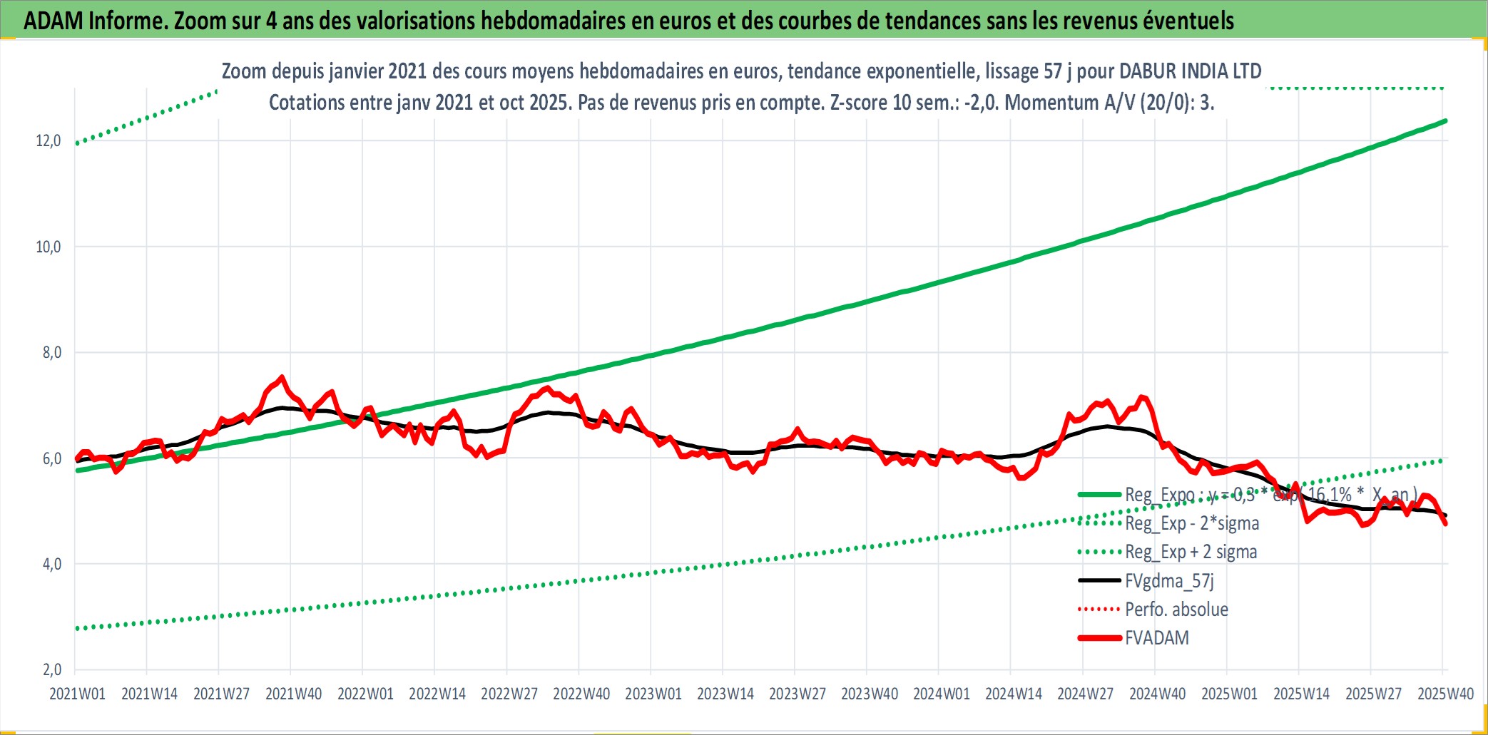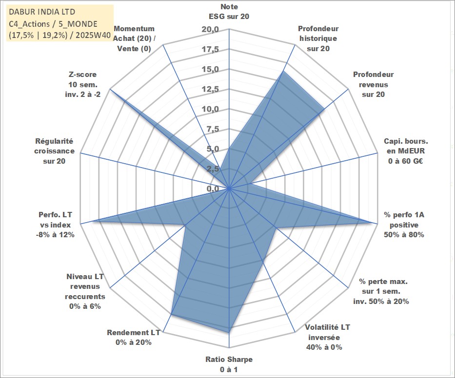 Site dédié aux investisseursPage dédiée sur site financeAnalyse des valorisations hebdomadaires de l'action DABUR INDIA LTD. Cet actif est cote en INR. Les valorisations sont en contrevaleur EURO et couvrent les semaines 2002W27 a 2025W40. Les revenus de cet actif financier sont pris en compte depuis la semaine 2002W46. La note globale ESG de cet actif est estimee a 5.0 (apres rebasage entre 0 et 20).