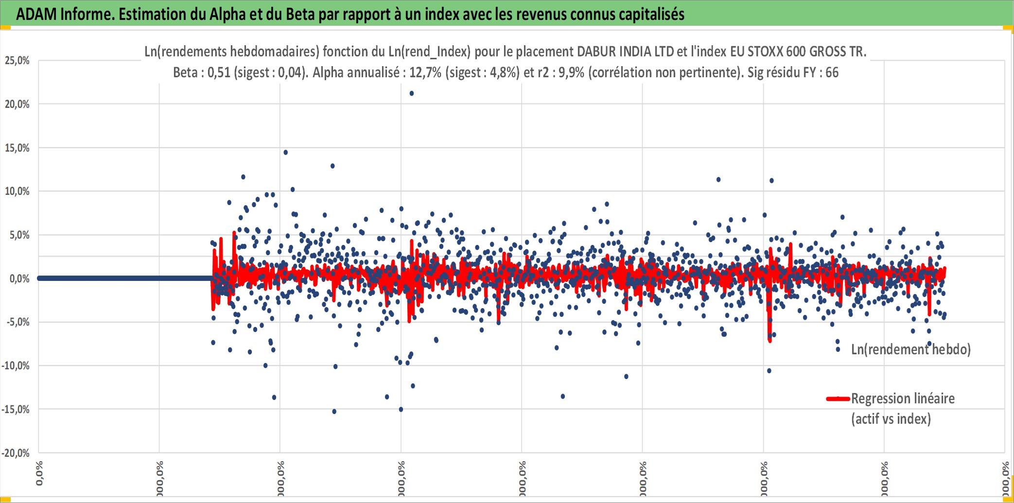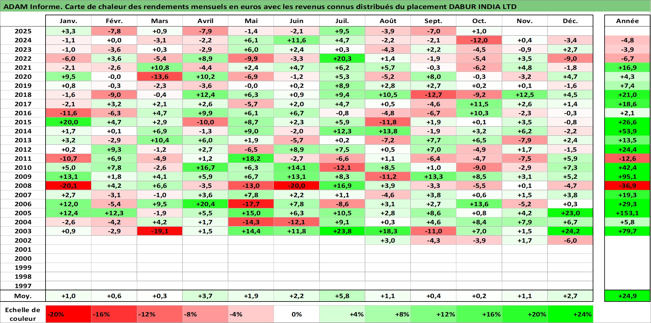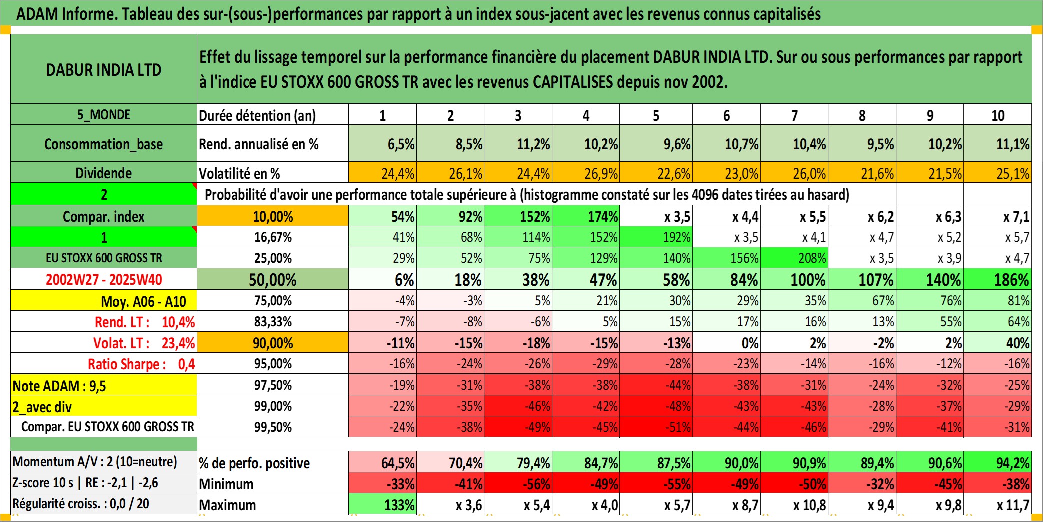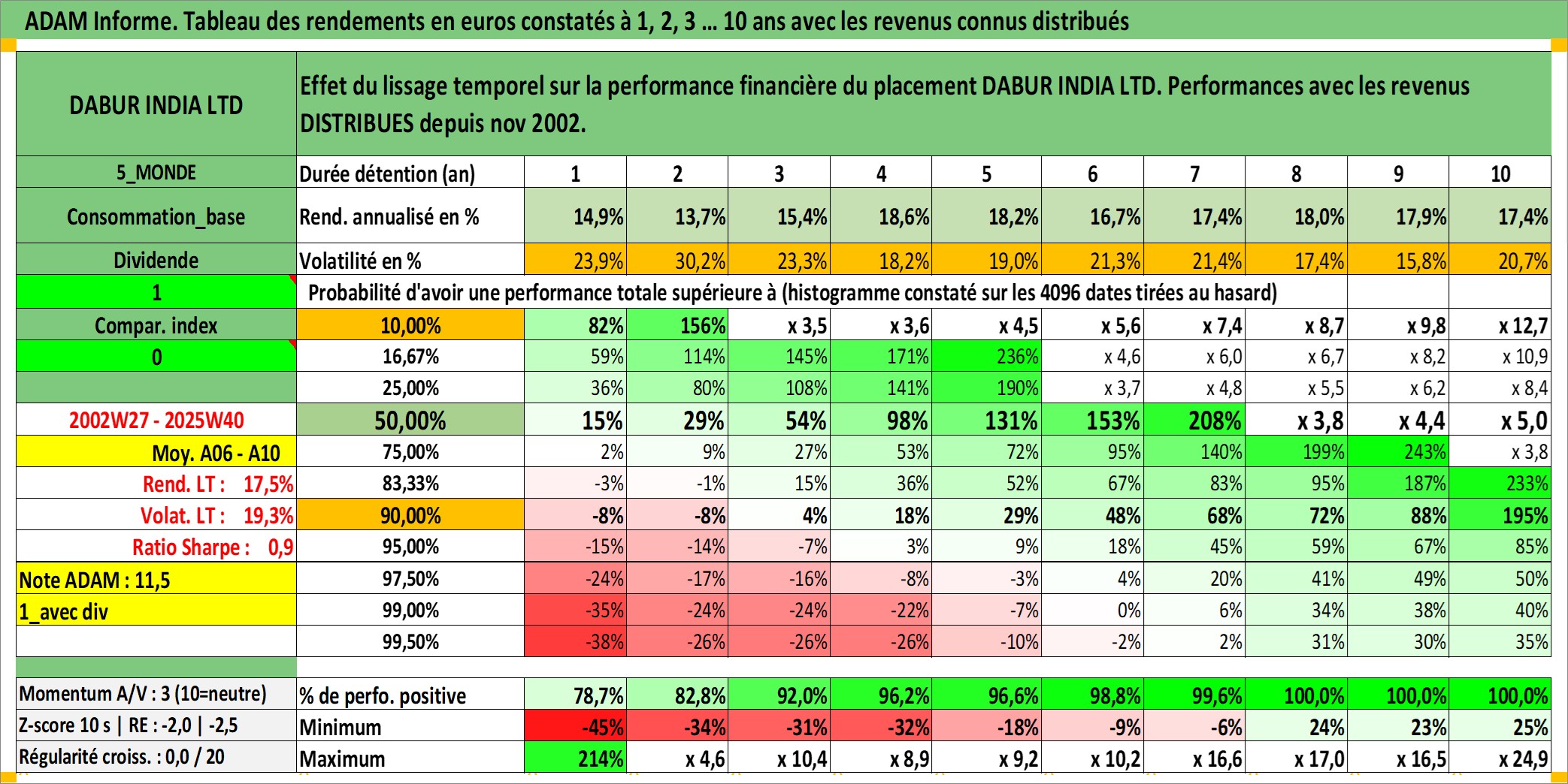 Site dédié aux investisseursPage dédiée sur site financeAnalyse des valorisations hebdomadaires de l'action DABUR INDIA LTD. Cet actif est cote en INR. Les valorisations sont en contrevaleur EURO et couvrent les semaines 2002W27 a 2025W40. Les revenus de cet actif financier sont pris en compte depuis la semaine 2002W46. La note globale ESG de cet actif est estimee a 5.0 (apres rebasage entre 0 et 20).