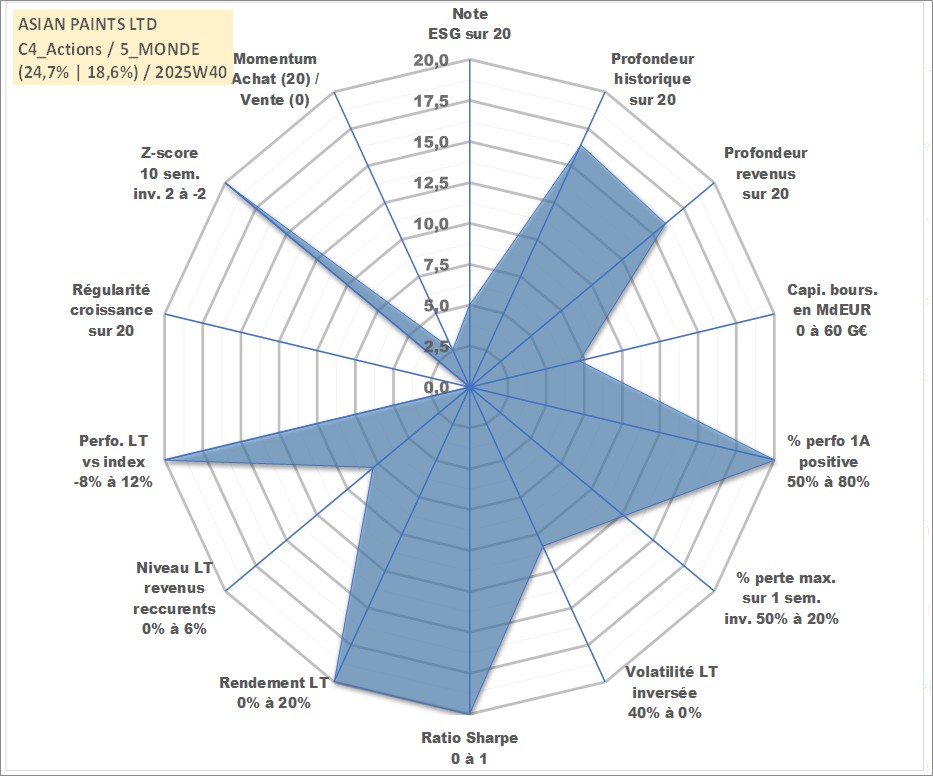 Site dédié aux investisseursPage dédiée sur site financeAnalyse des valorisations hebdomadaires de l'action ASIAN PAINTS LTD. Cet actif est cote en INR. Les valorisations sont en contrevaleur EURO et couvrent les semaines 2002W27 a 2025W40. Les revenus de cet actif financier sont pris en compte depuis la semaine 2002W28. La note globale ESG de cet actif est estimee a 5.0 (apres rebasage entre 0 et 20).