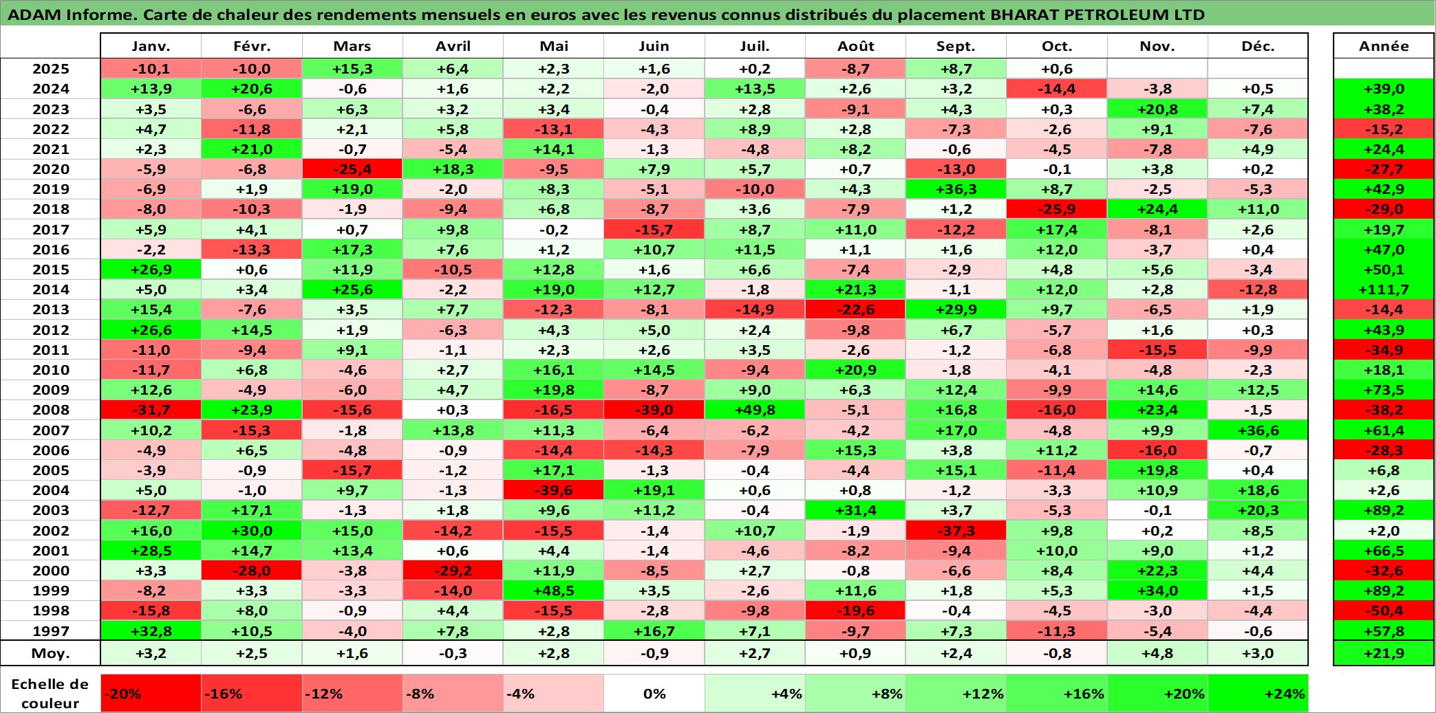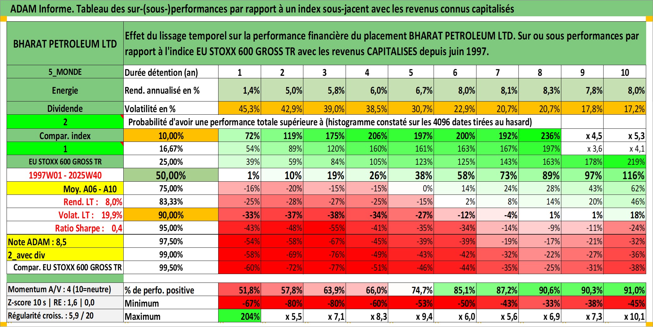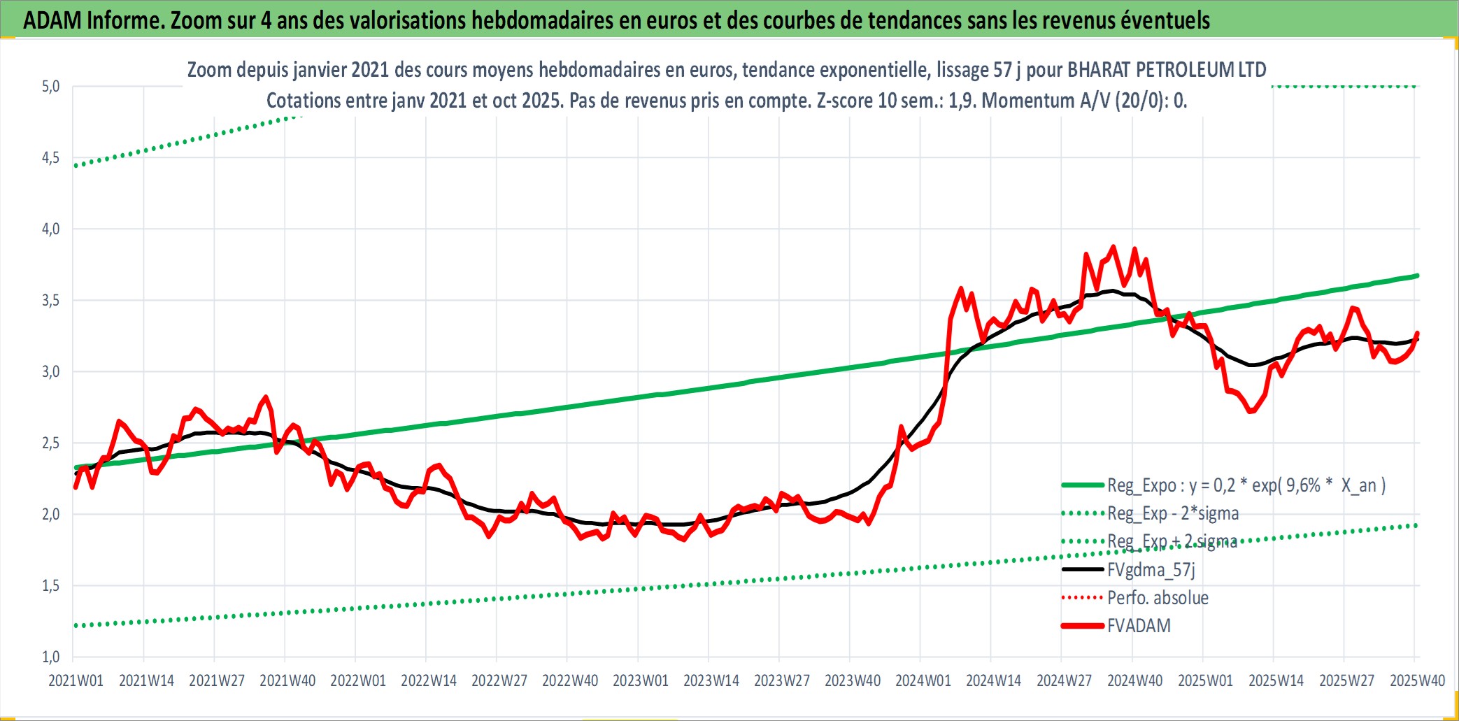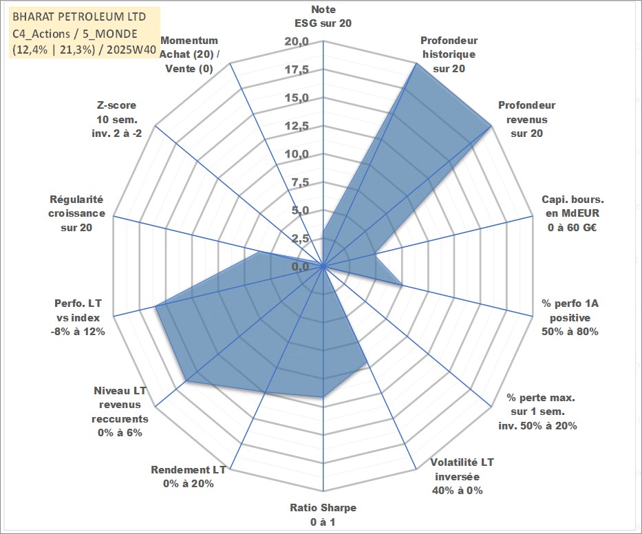 Site dédié aux investisseursPage dédiée sur site financeAnalyse des valorisations hebdomadaires de l'action BHARAT PETROLEUM LTD. Cet actif est cote en INR. Les valorisations sont en contrevaleur EURO et couvrent les semaines 1997W01 a 2025W40. Les revenus de cet actif financier sont pris en compte depuis la semaine 1997W26. La note globale ESG de cet actif est estimee a 3.0 (apres rebasage entre 0 et 20).