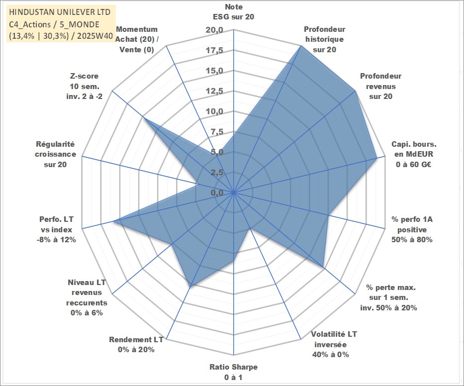 Site dédié aux investisseursPage dédiée sur site financeAnalyse des valorisations hebdomadaires de l'action HINDUSTAN UNILEVER LTD. Cet actif est cote en INR. Les valorisations sont en contrevaleur EURO et couvrent les semaines 1997W01 a 2025W40. Les revenus de cet actif financier sont pris en compte depuis la semaine 1998W12. La note globale ESG de cet actif est estimee a 7.0 (apres rebasage entre 0 et 20).