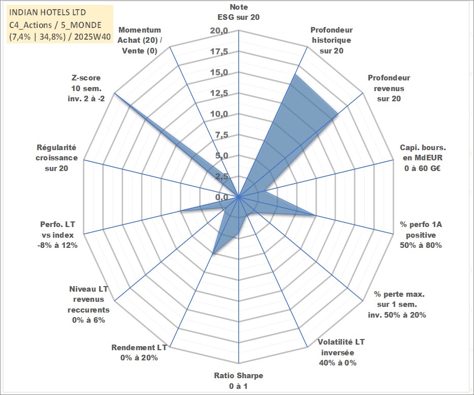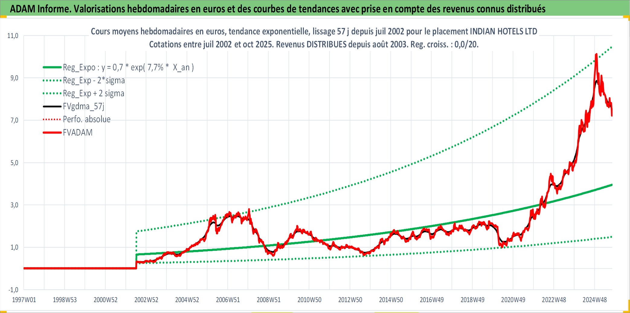 Site dédié aux investisseursPage dédiée sur site financeAnalyse des valorisations hebdomadaires de l'action INDIAN HOTELS LTD. Cet actif est cote en INR. Les valorisations sont en contrevaleur EURO et couvrent les semaines 2002W27 a 2025W40. Les revenus de cet actif financier sont pris en compte depuis la semaine 2003W33. La note ESG de cet actif n'est pas connue.