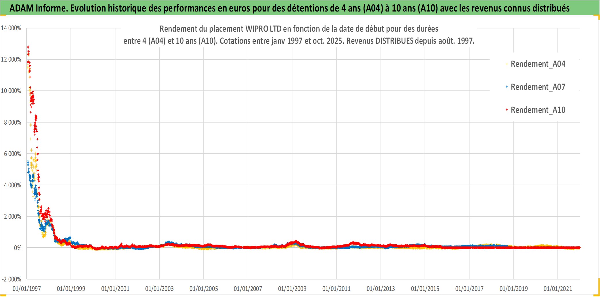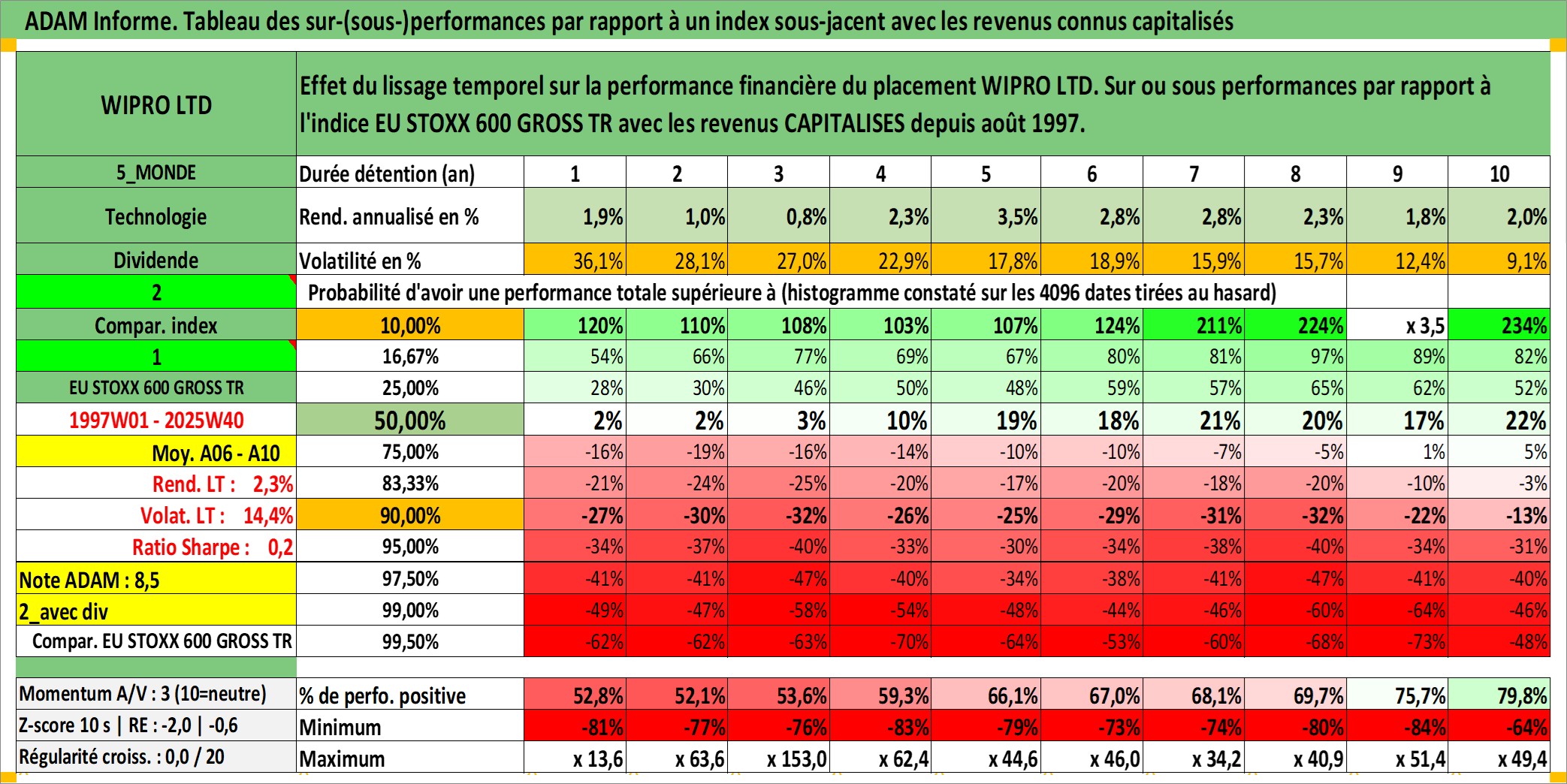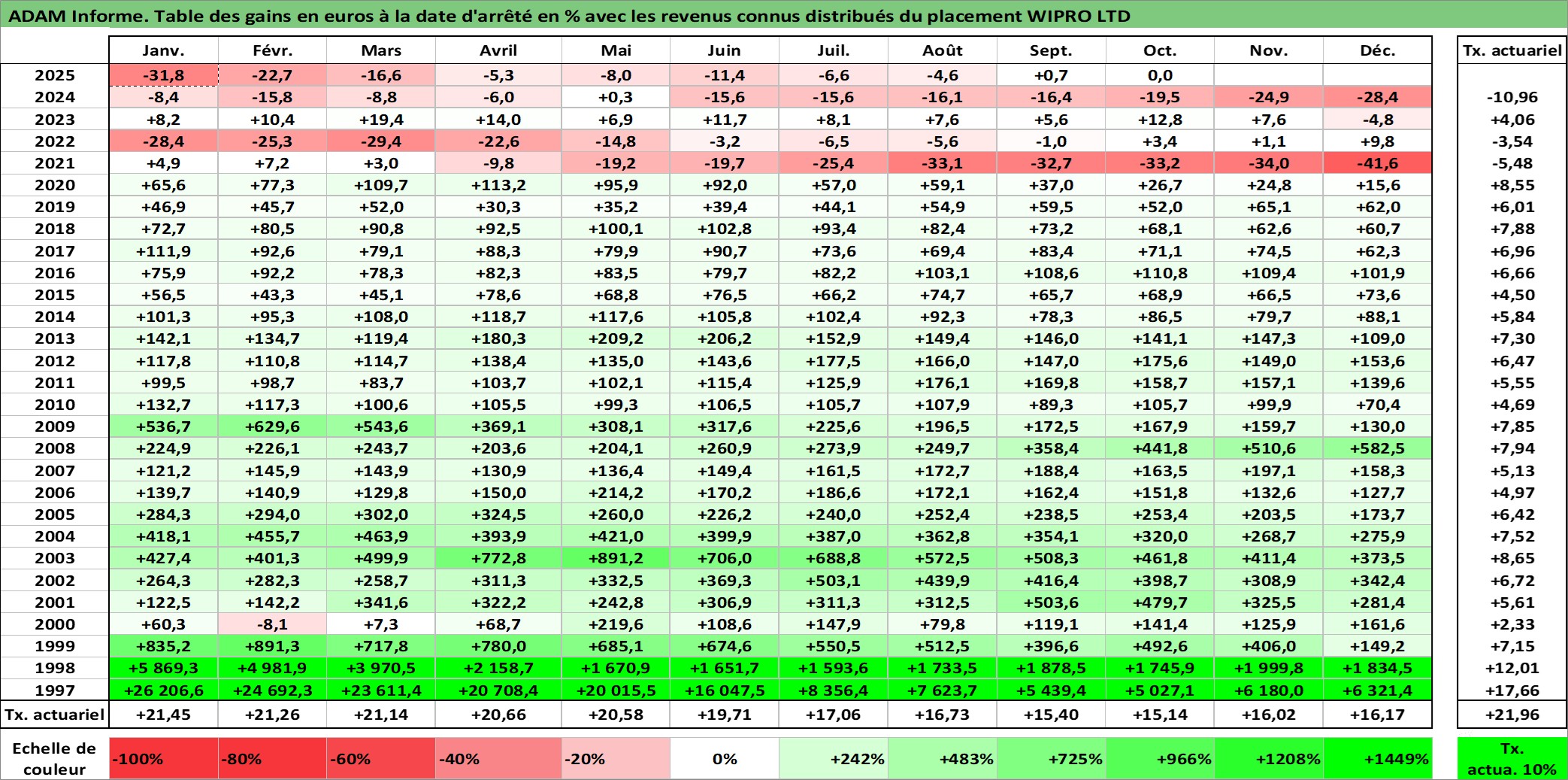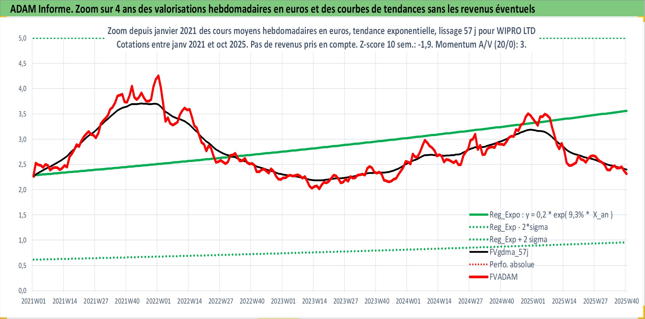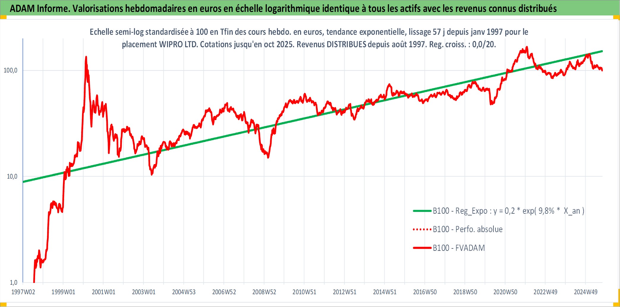 Site dédié aux investisseursPage dédiée sur site financeAnalyse des valorisations hebdomadaires de l'action WIPRO LTD. Cet actif est cote en INR. Les valorisations sont en contrevaleur EURO et couvrent les semaines 1997W01 a 2025W40. Les revenus de cet actif financier sont pris en compte depuis la semaine 1997W32. La note globale ESG de cet actif est estimee a 15.0 (apres rebasage entre 0 et 20).