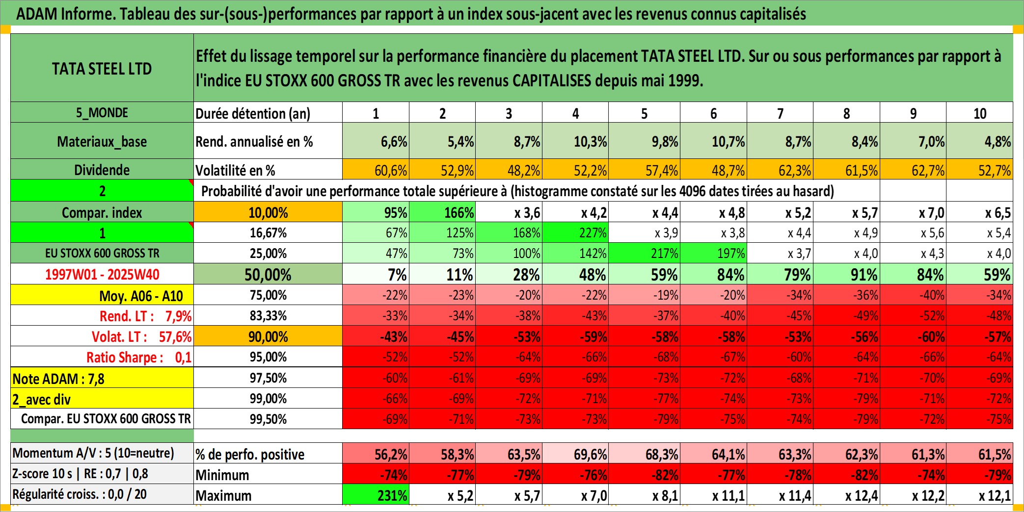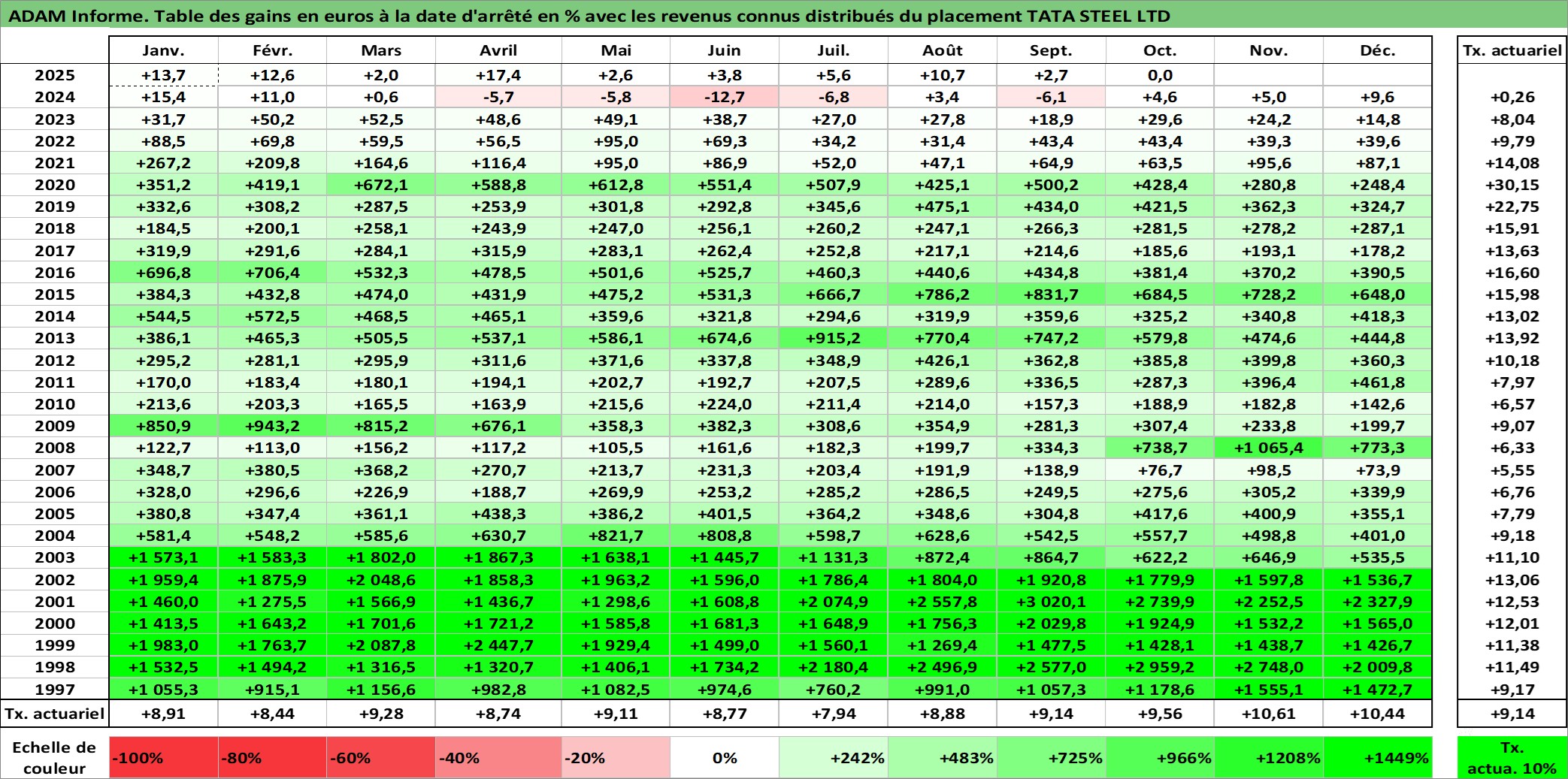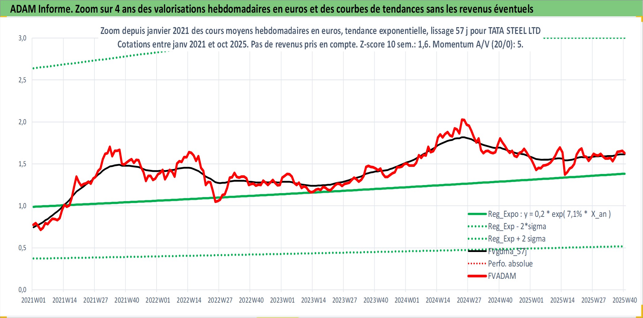 Site dédié aux investisseursPage dédiée sur site financeAnalyse des valorisations hebdomadaires de l'action TATA STEEL LTD. Cet actif est cote en INR. Les valorisations sont en contrevaleur EURO et couvrent les semaines 1997W01 a 2025W40. Les revenus de cet actif financier sont pris en compte depuis la semaine 1999W19. La note globale ESG de cet actif est estimee a 5.0 (apres rebasage entre 0 et 20).