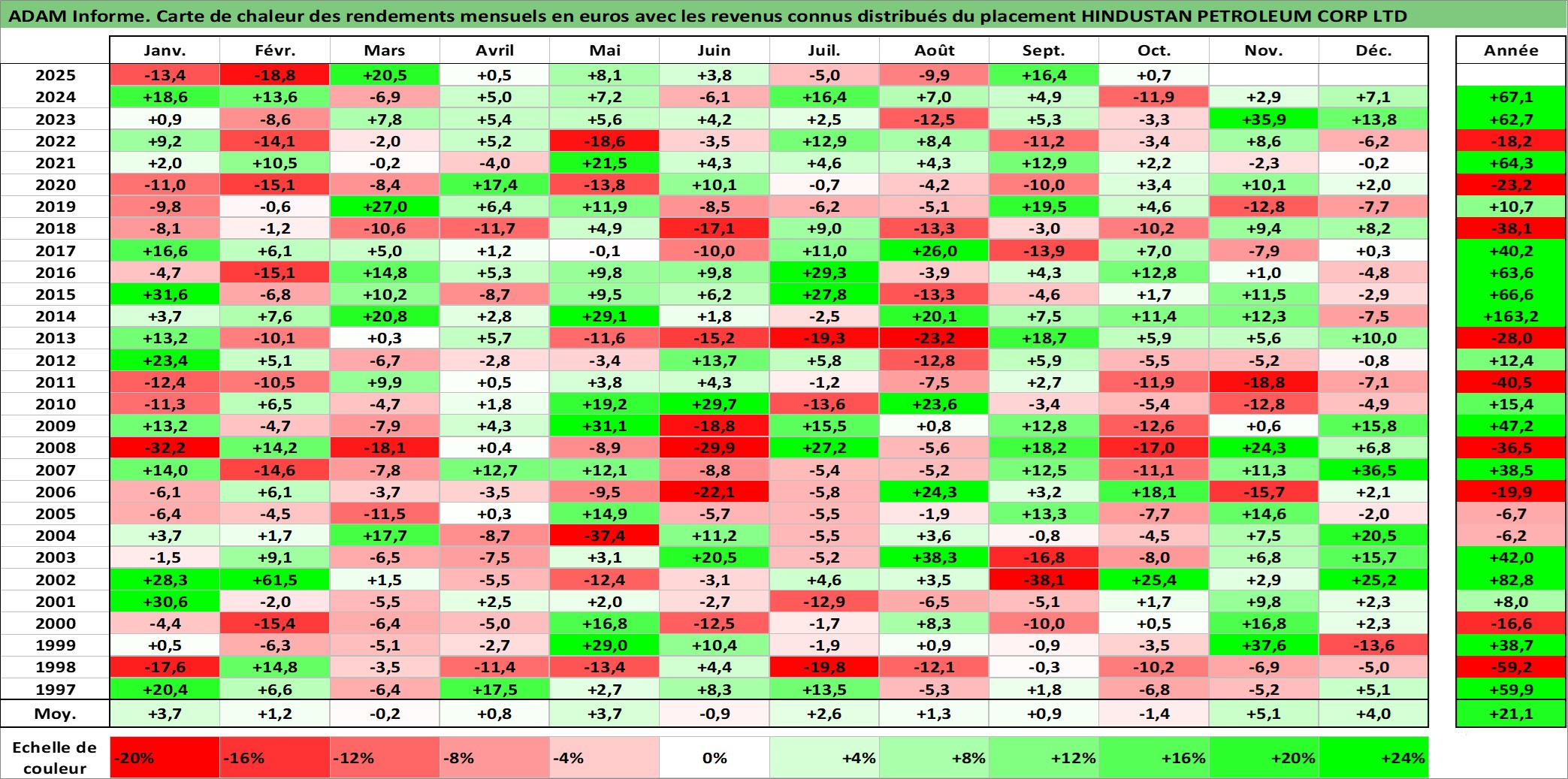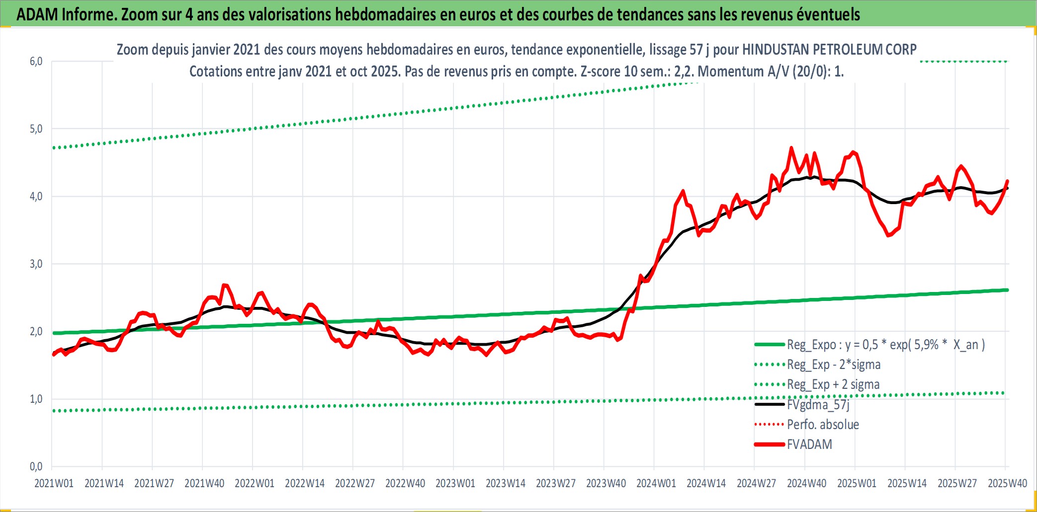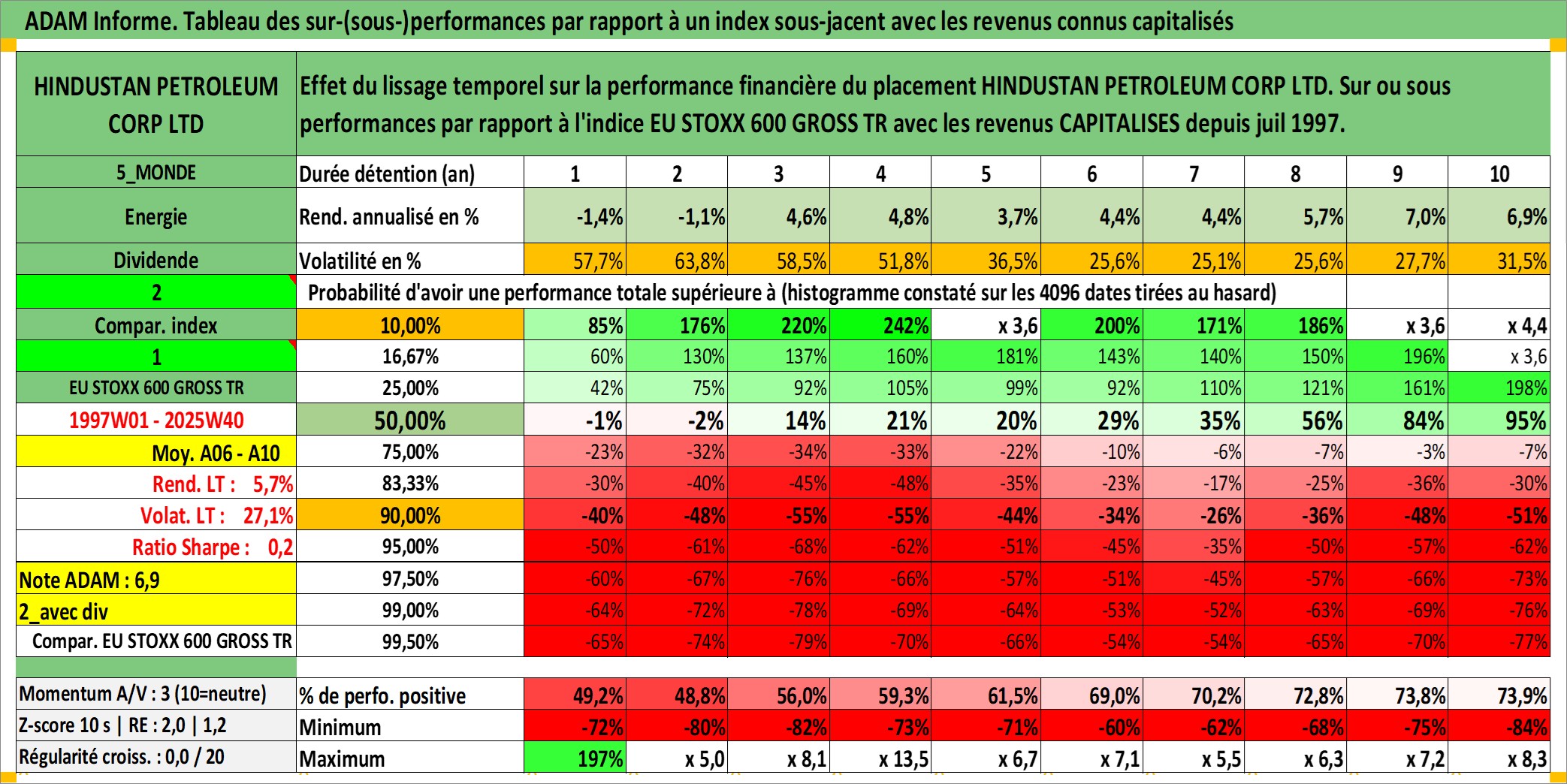 Site dédié aux investisseursPage dédiée sur site financeAnalyse des valorisations hebdomadaires de l'action HINDUSTAN PETROLEUM CORP LTD. Cet actif est cote en INR. Les valorisations sont en contrevaleur EURO et couvrent les semaines 1997W01 a 2025W40. Les revenus de cet actif financier sont pris en compte depuis la semaine 1997W29. La note globale ESG de cet actif est estimee a 2.0 (apres rebasage entre 0 et 20).