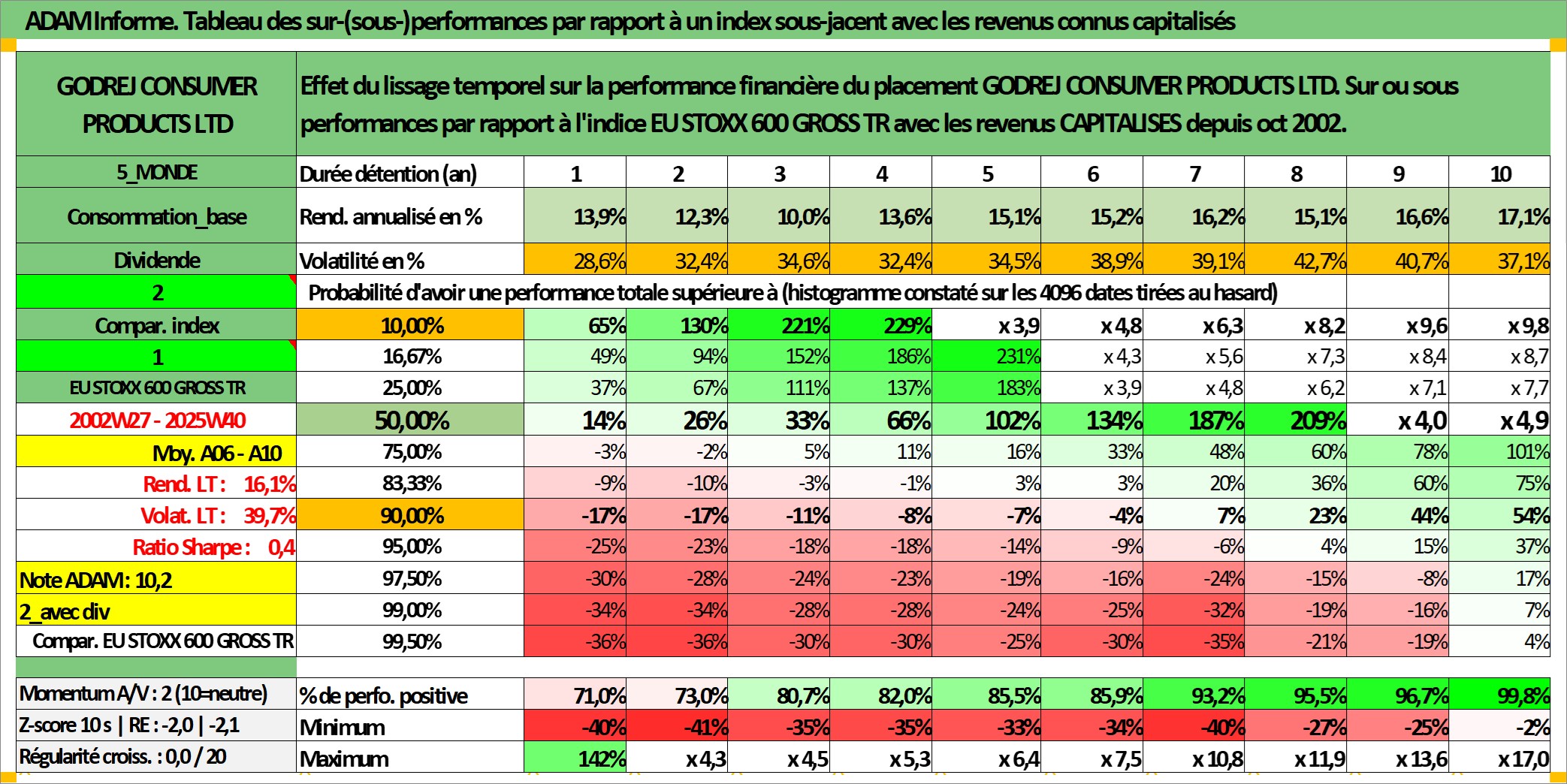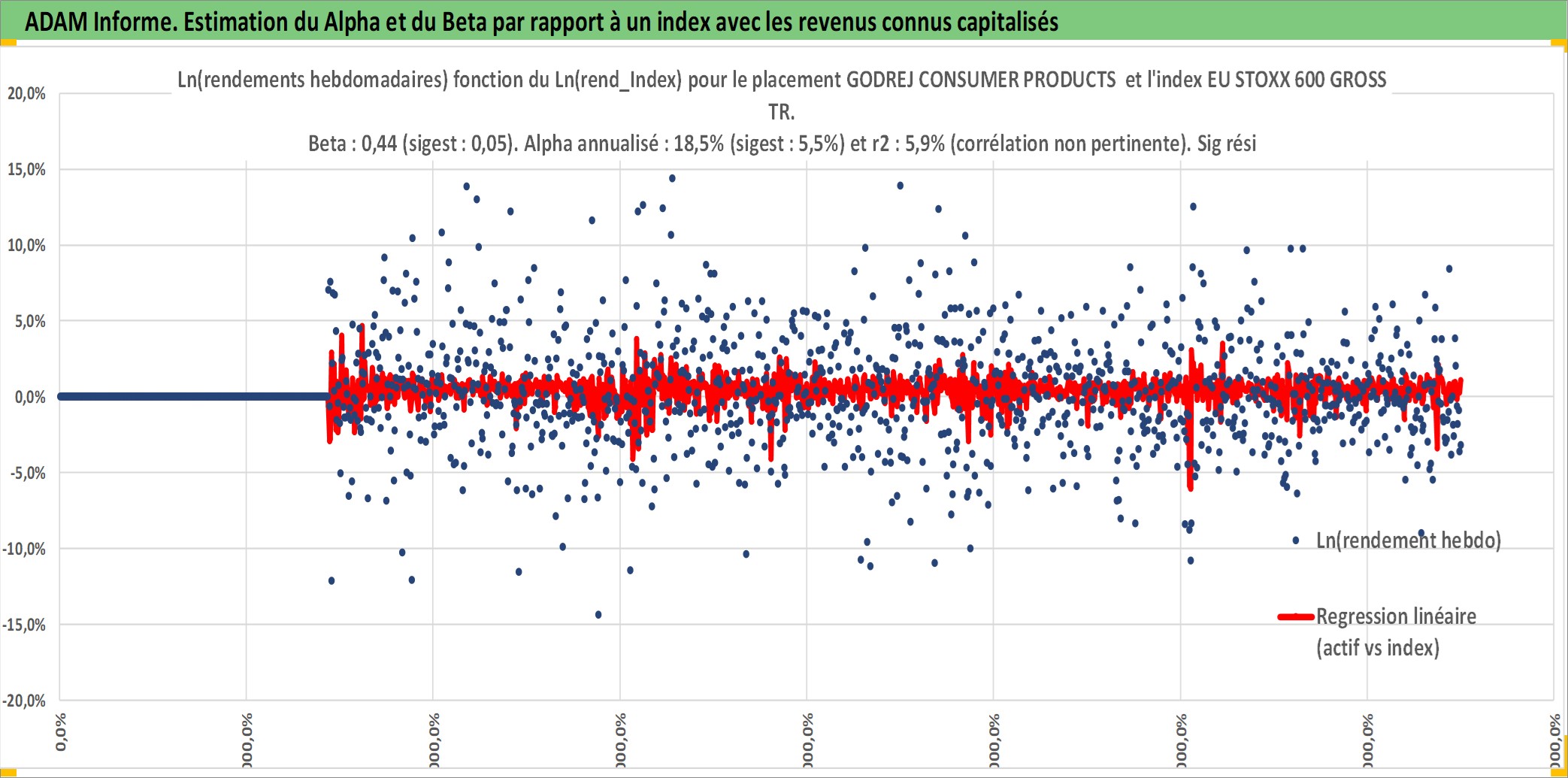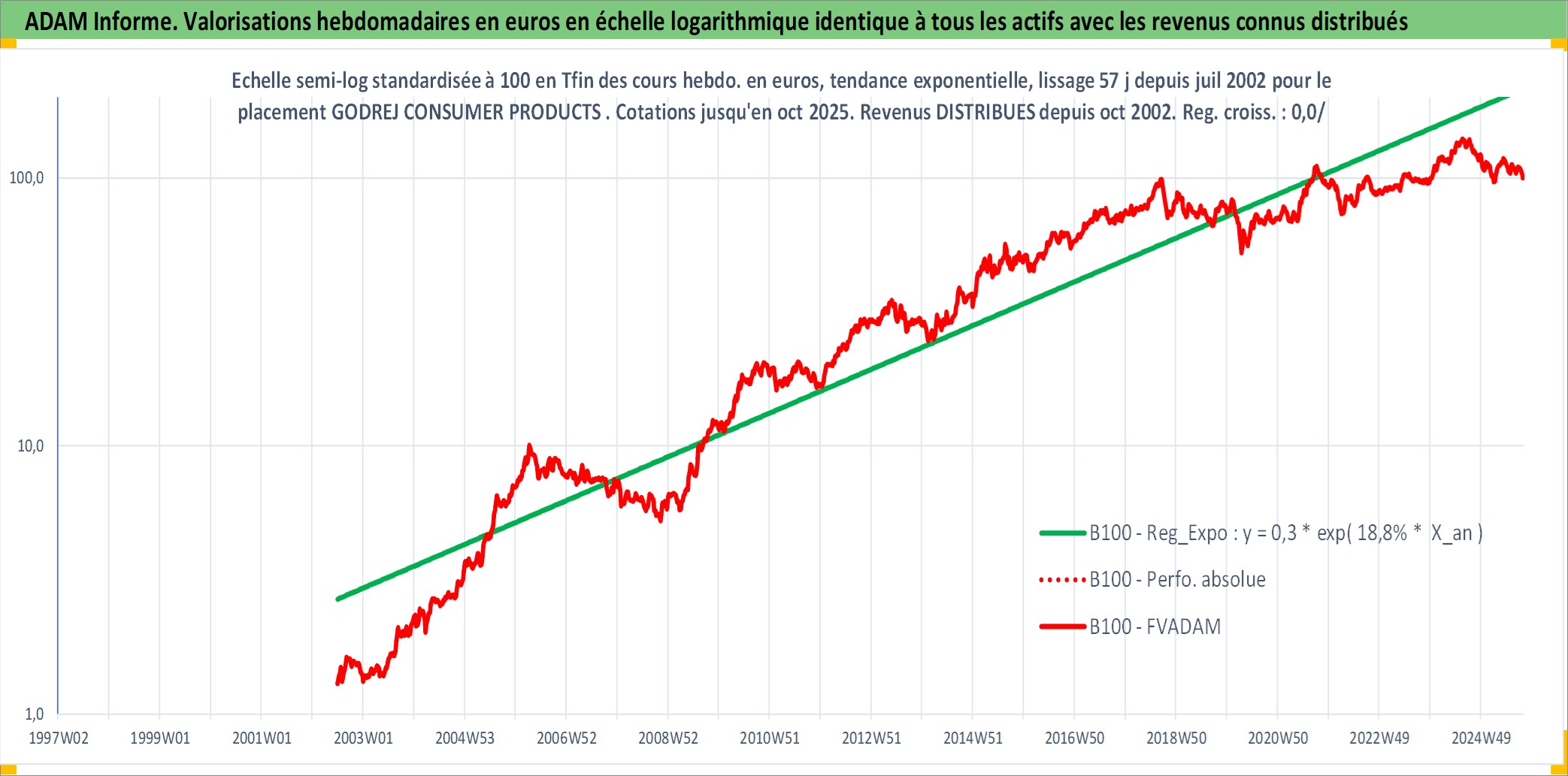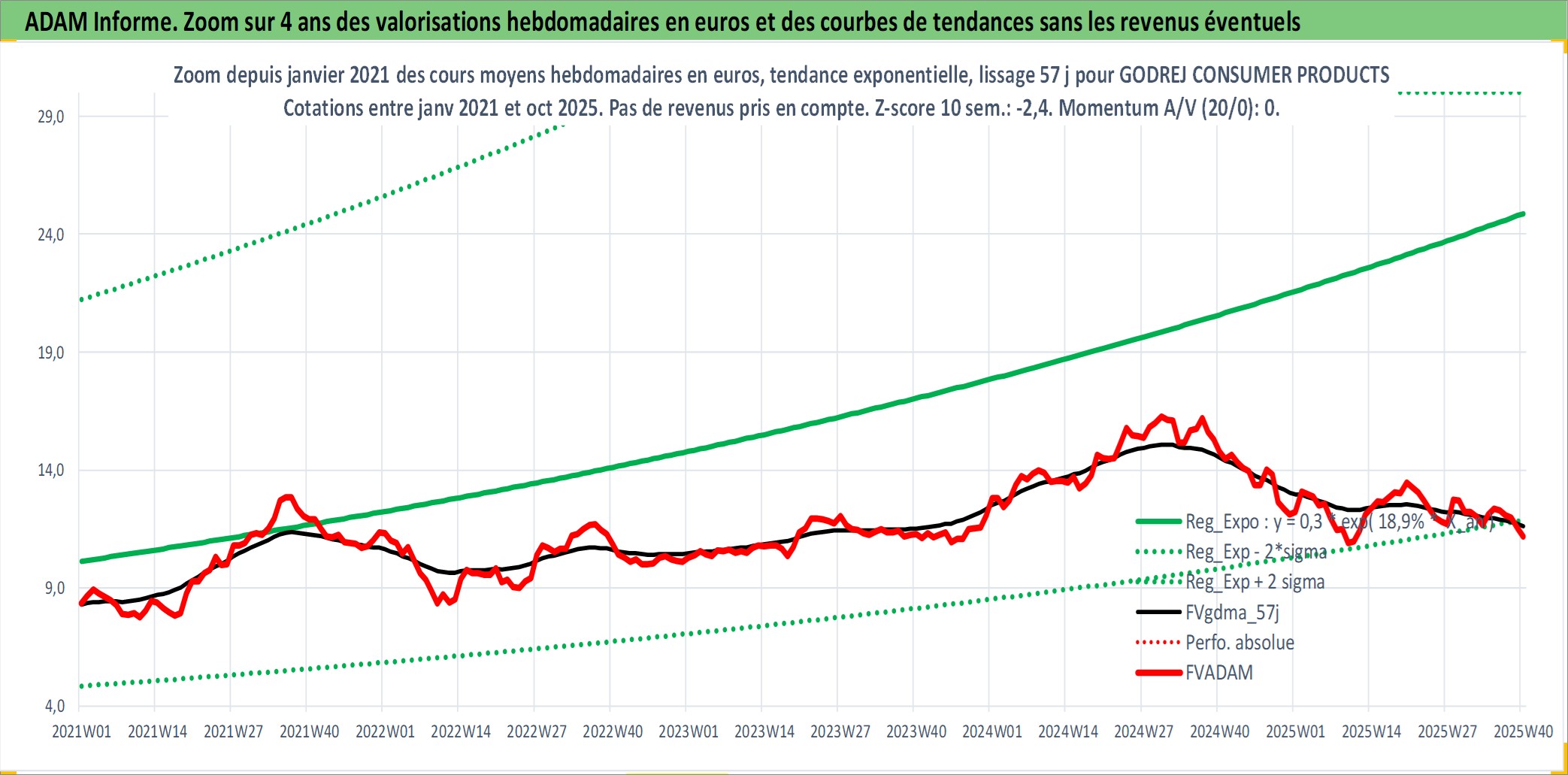 Site dédié aux investisseursPage dédiée sur site financeAnalyse des valorisations hebdomadaires de l'action GODREJ CONSUMER PRODUCTS LTD. Cet actif est cote en INR. Les valorisations sont en contrevaleur EURO et couvrent les semaines 2002W27 a 2025W40. Les revenus de cet actif financier sont pris en compte depuis la semaine 2002W44. La note globale ESG de cet actif est estimee a 7.0 (apres rebasage entre 0 et 20).