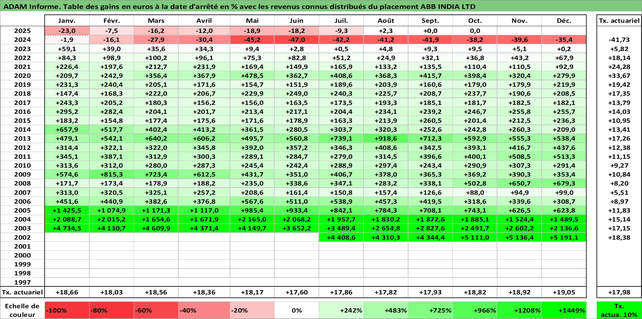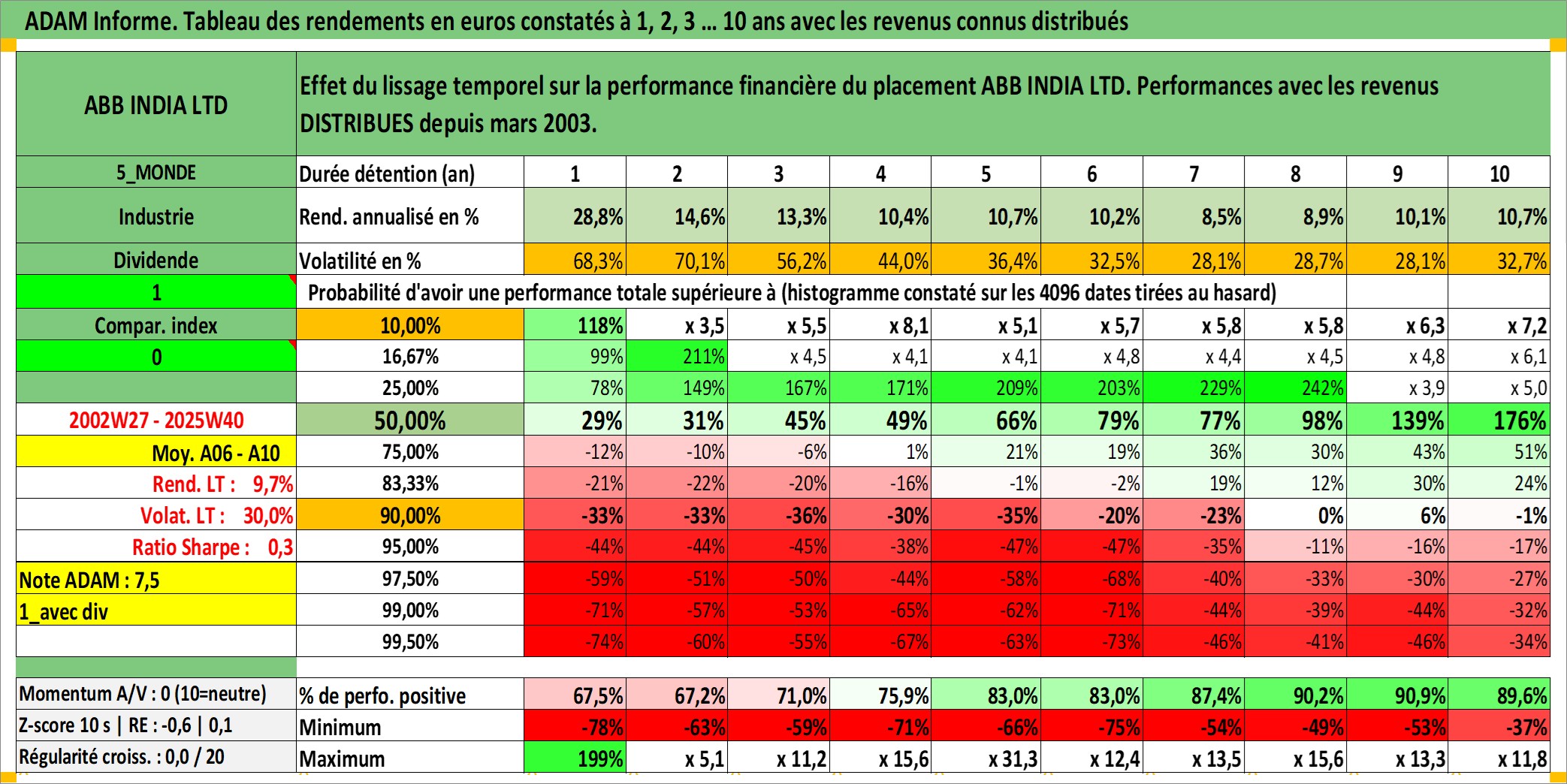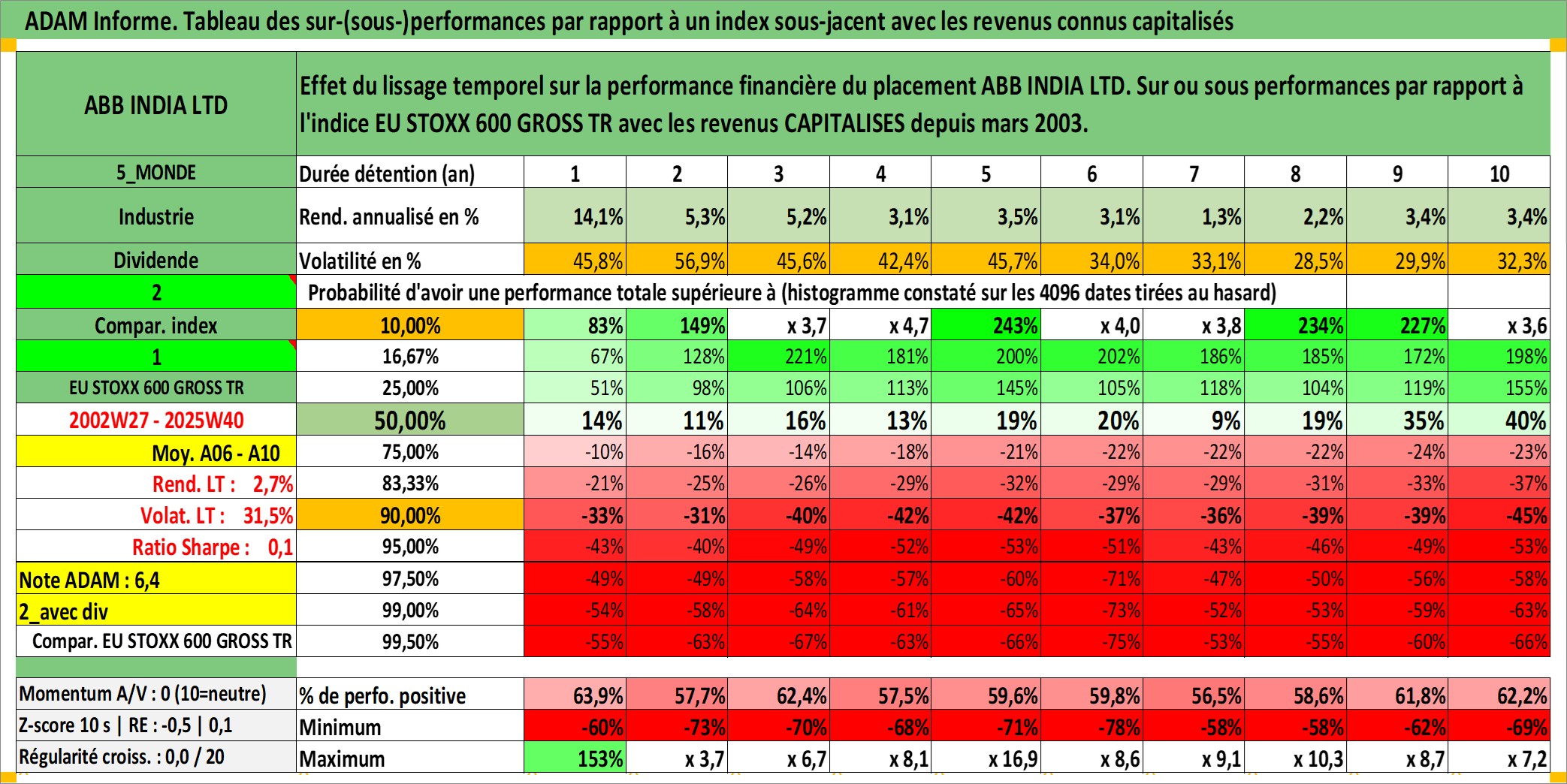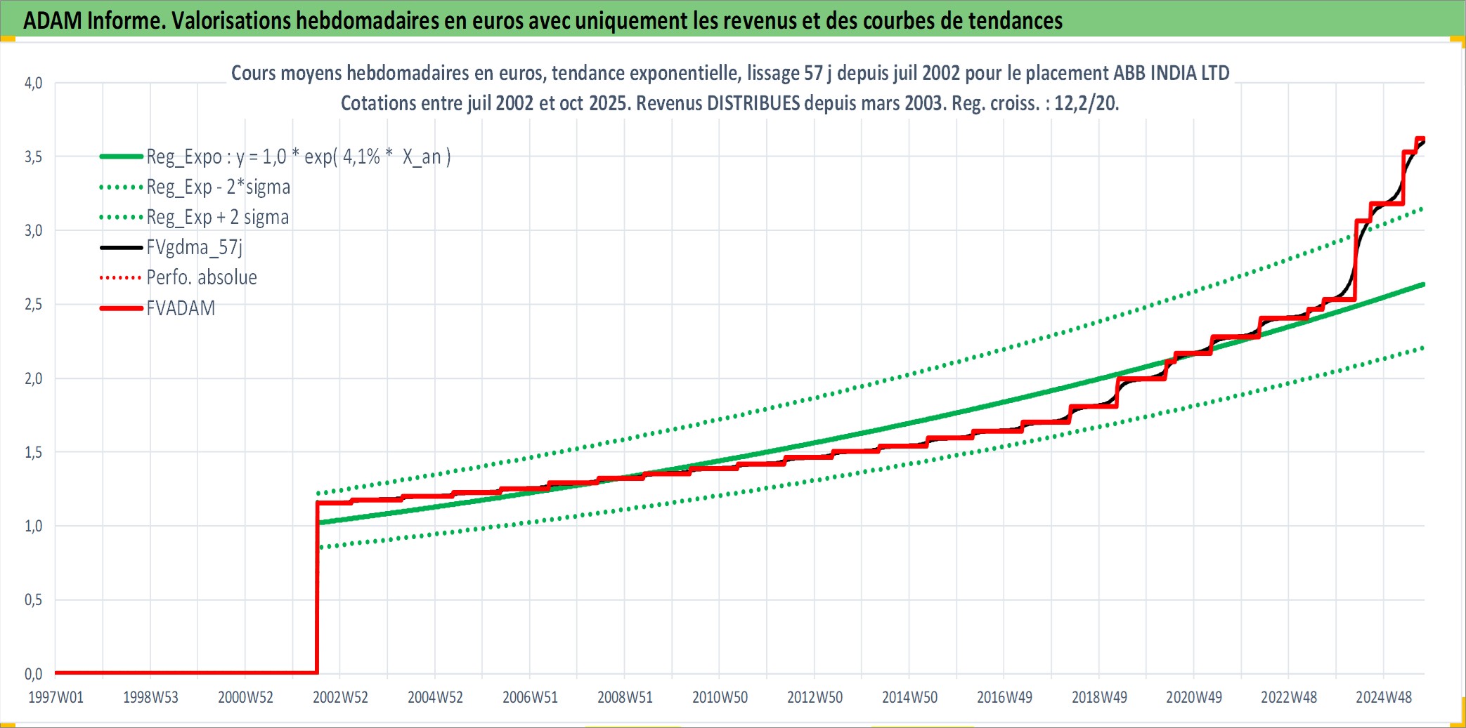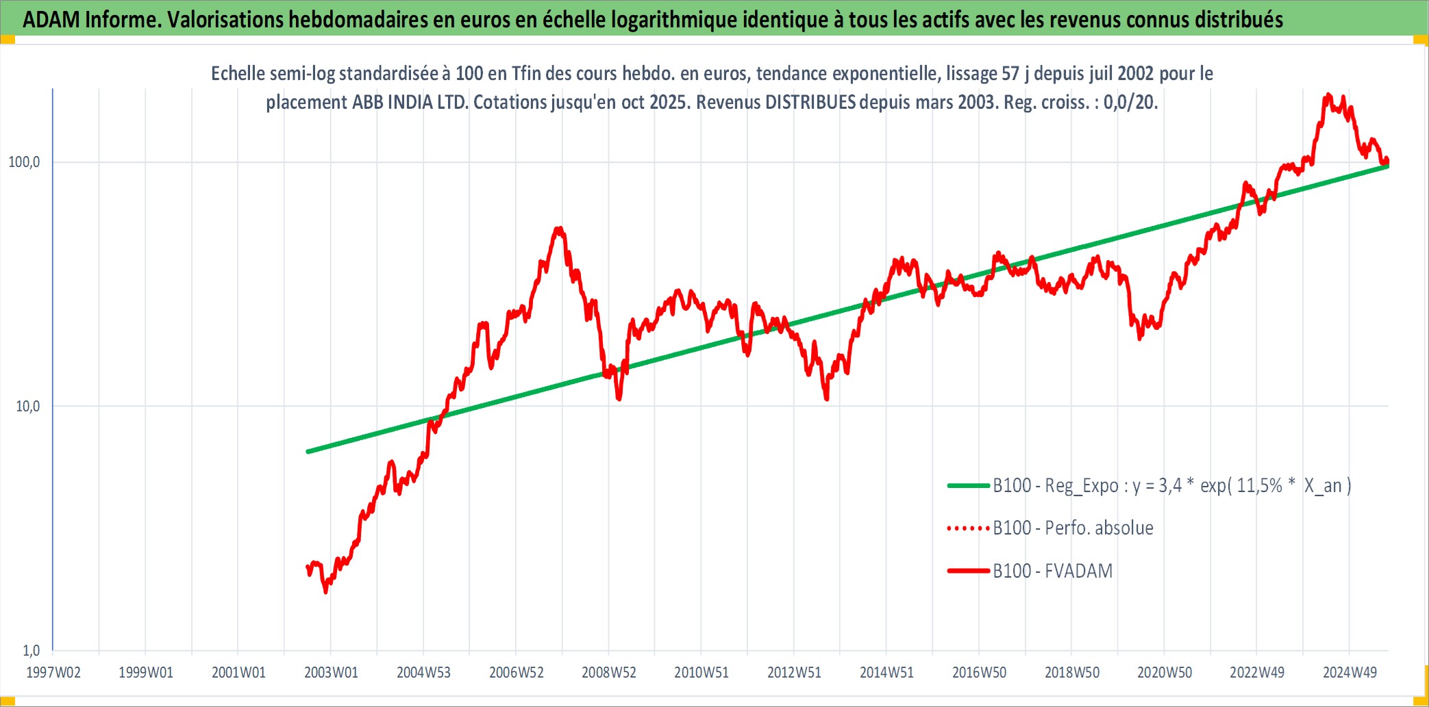 Site dédié aux investisseursPage dédiée sur site financeAnalyse des valorisations hebdomadaires de l'action ABB INDIA LTD. Cet actif est cote en INR. Les valorisations sont en contrevaleur EURO et couvrent les semaines 2002W27 a 2025W40. Les revenus de cet actif financier sont pris en compte depuis la semaine 2003W13. La note ESG de cet actif n'est pas connue.