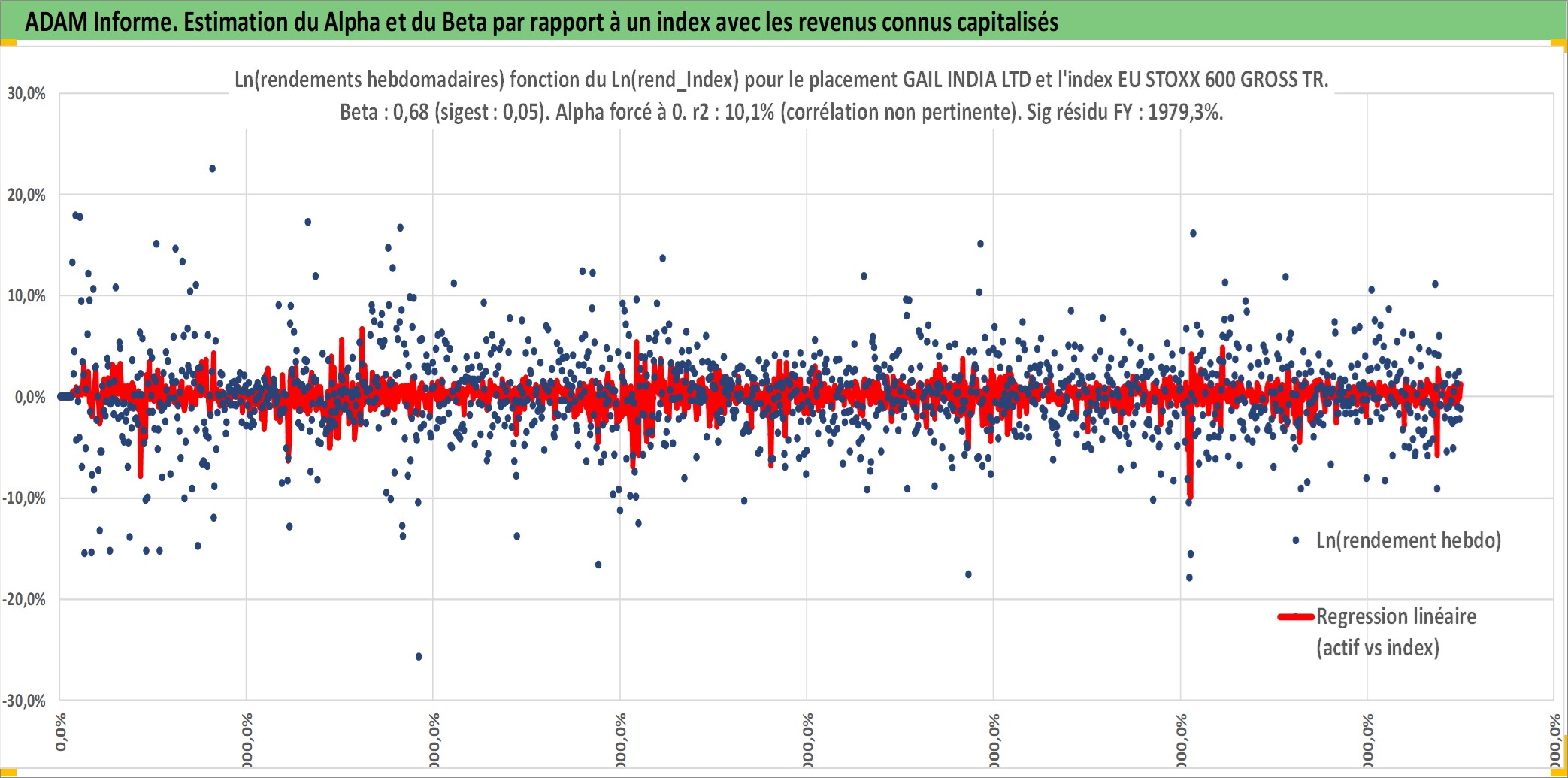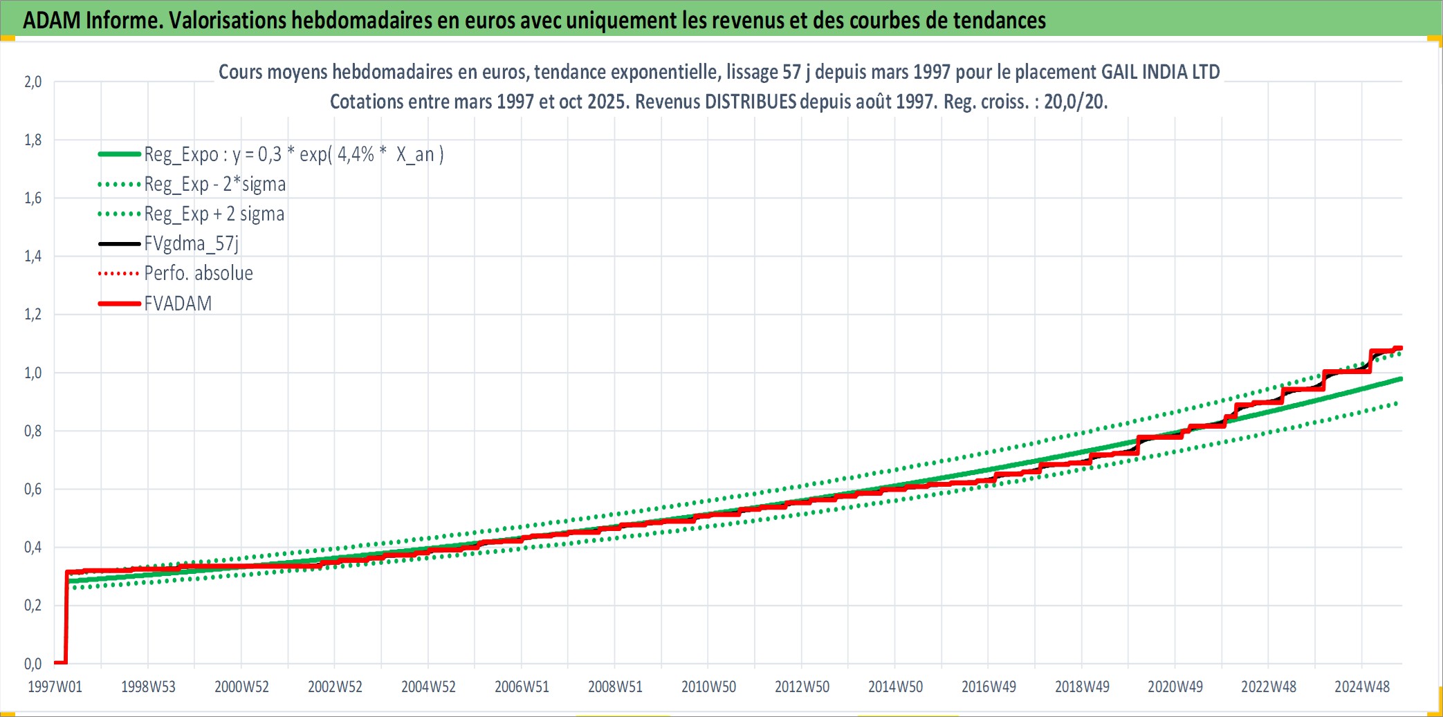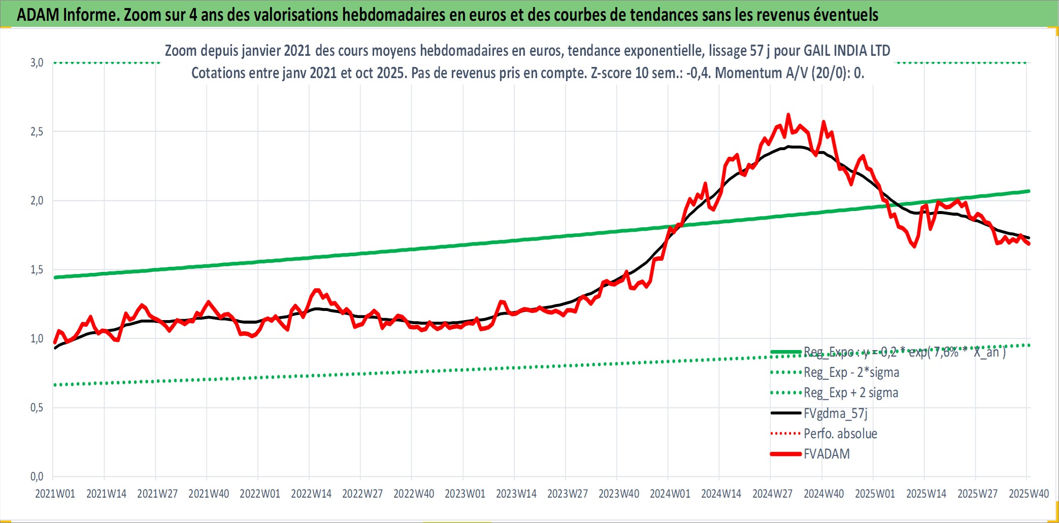 Site dédié aux investisseursPage dédiée sur site financeAnalyse des valorisations hebdomadaires de l'action GAIL INDIA LTD. Cet actif est cote en INR. Les valorisations sont en contrevaleur EURO et couvrent les semaines 1997W14 a 2025W40. Les revenus de cet actif financier sont pris en compte depuis la semaine 1997W33. La note globale ESG de cet actif est estimee a 6.0 (apres rebasage entre 0 et 20).