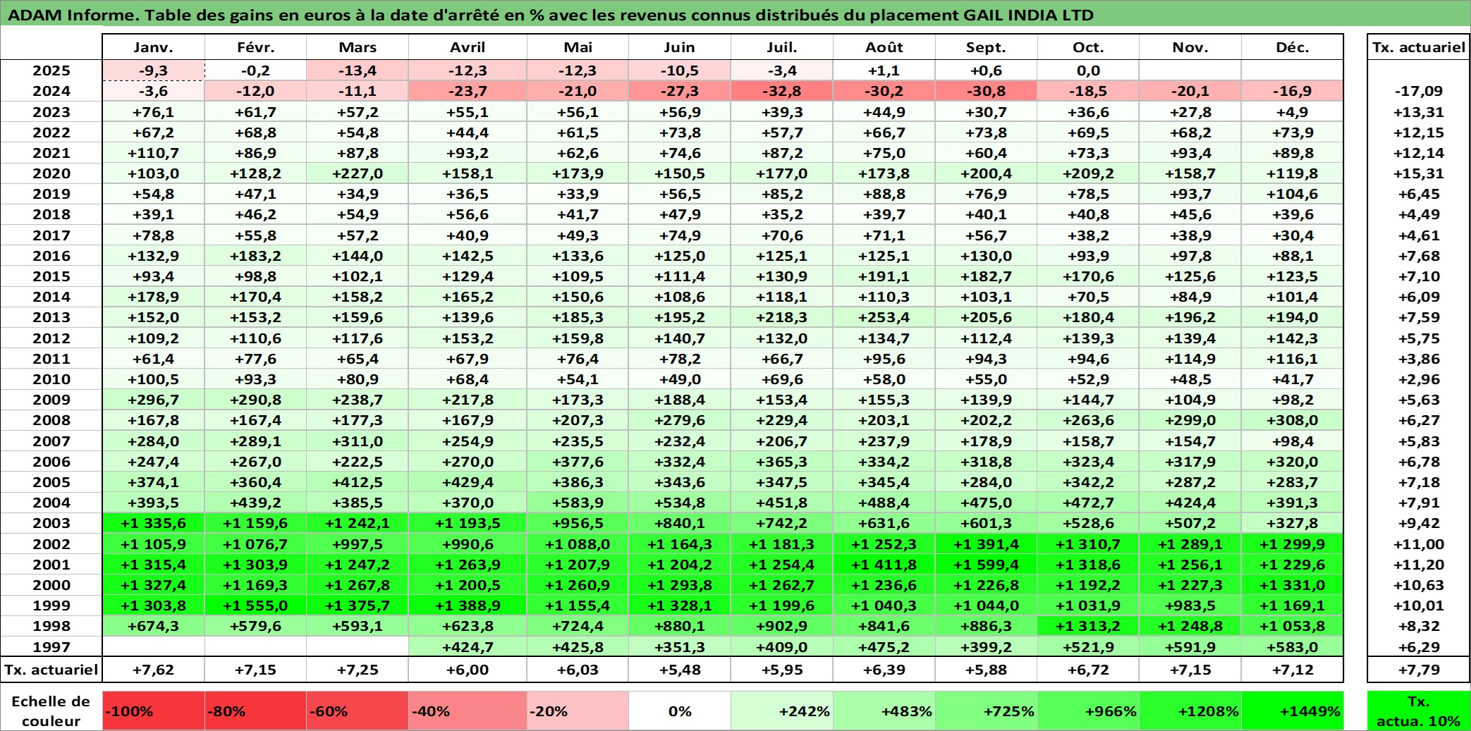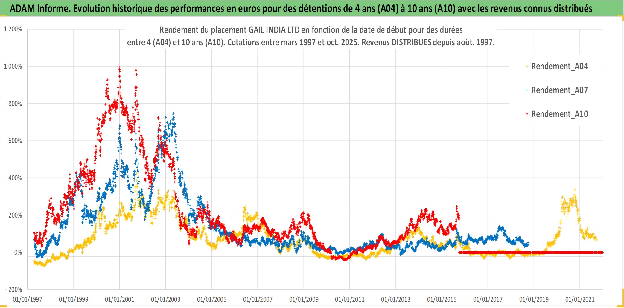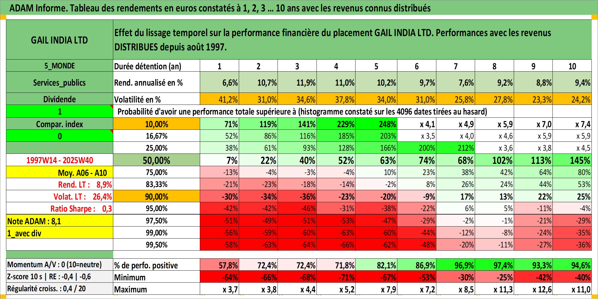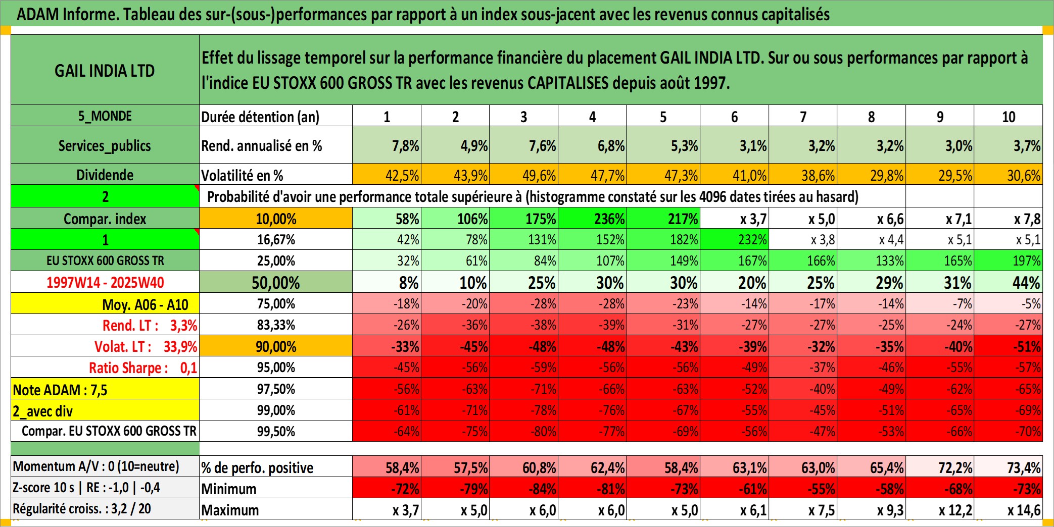 Site dédié aux investisseursPage dédiée sur site financeAnalyse des valorisations hebdomadaires de l'action GAIL INDIA LTD. Cet actif est cote en INR. Les valorisations sont en contrevaleur EURO et couvrent les semaines 1997W14 a 2025W40. Les revenus de cet actif financier sont pris en compte depuis la semaine 1997W33. La note globale ESG de cet actif est estimee a 6.0 (apres rebasage entre 0 et 20).