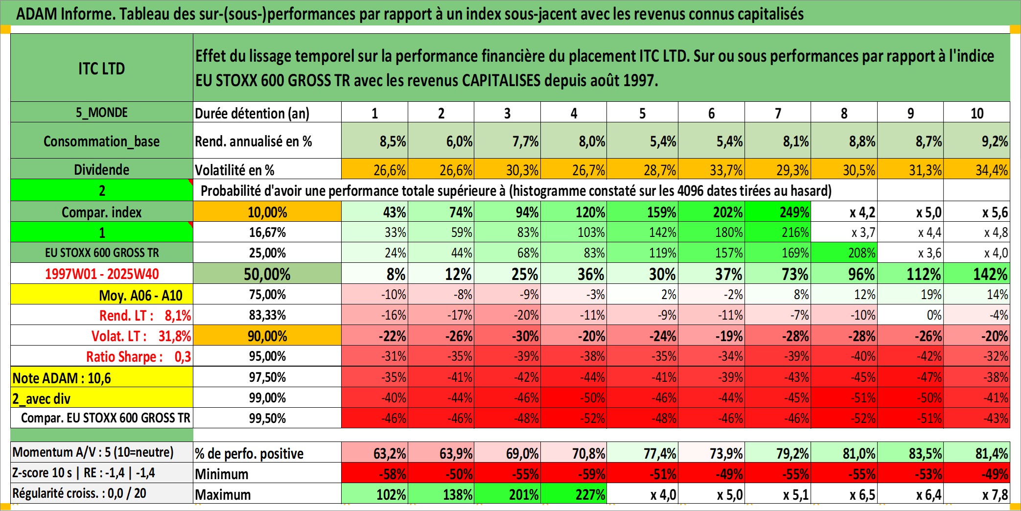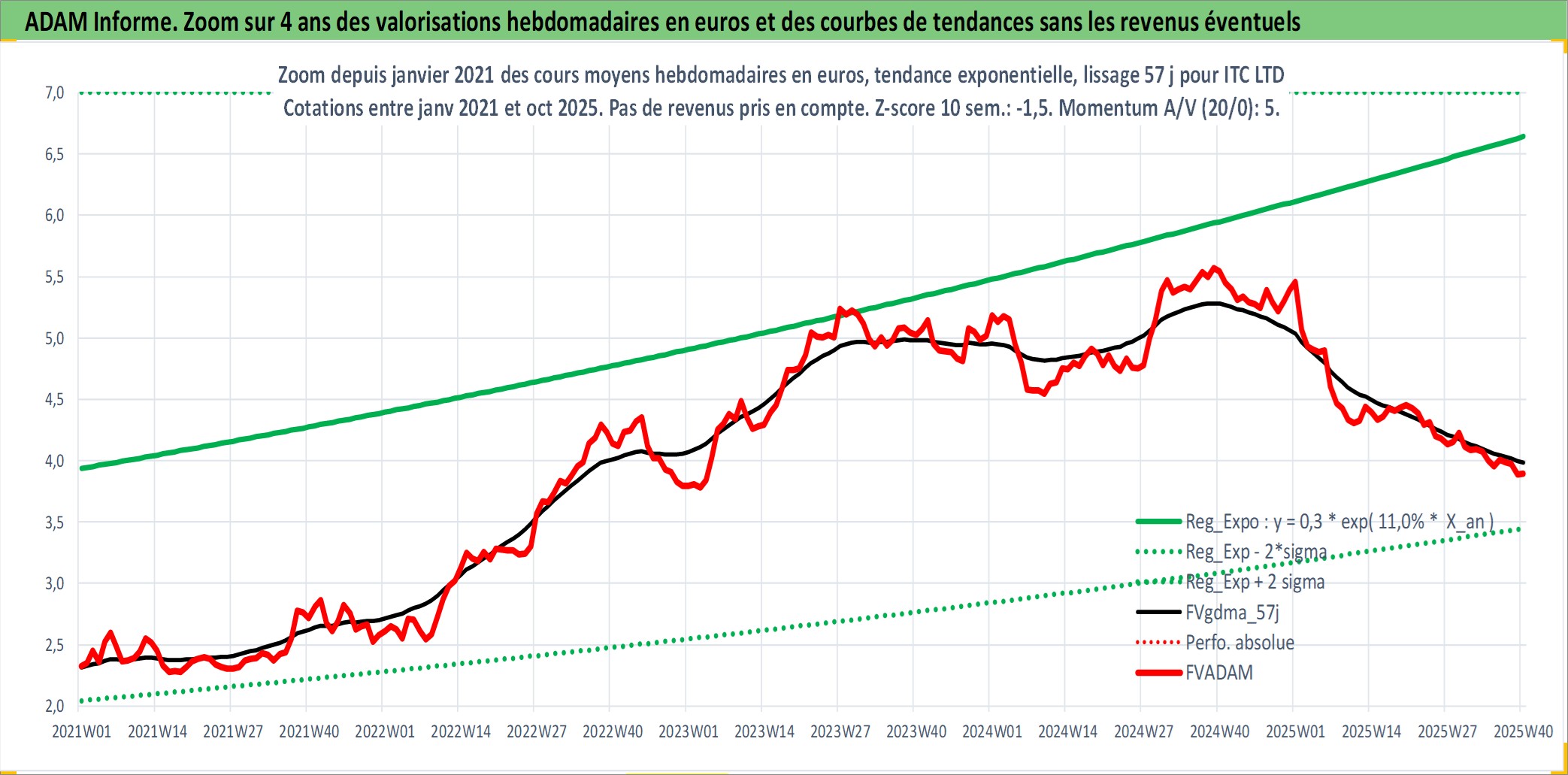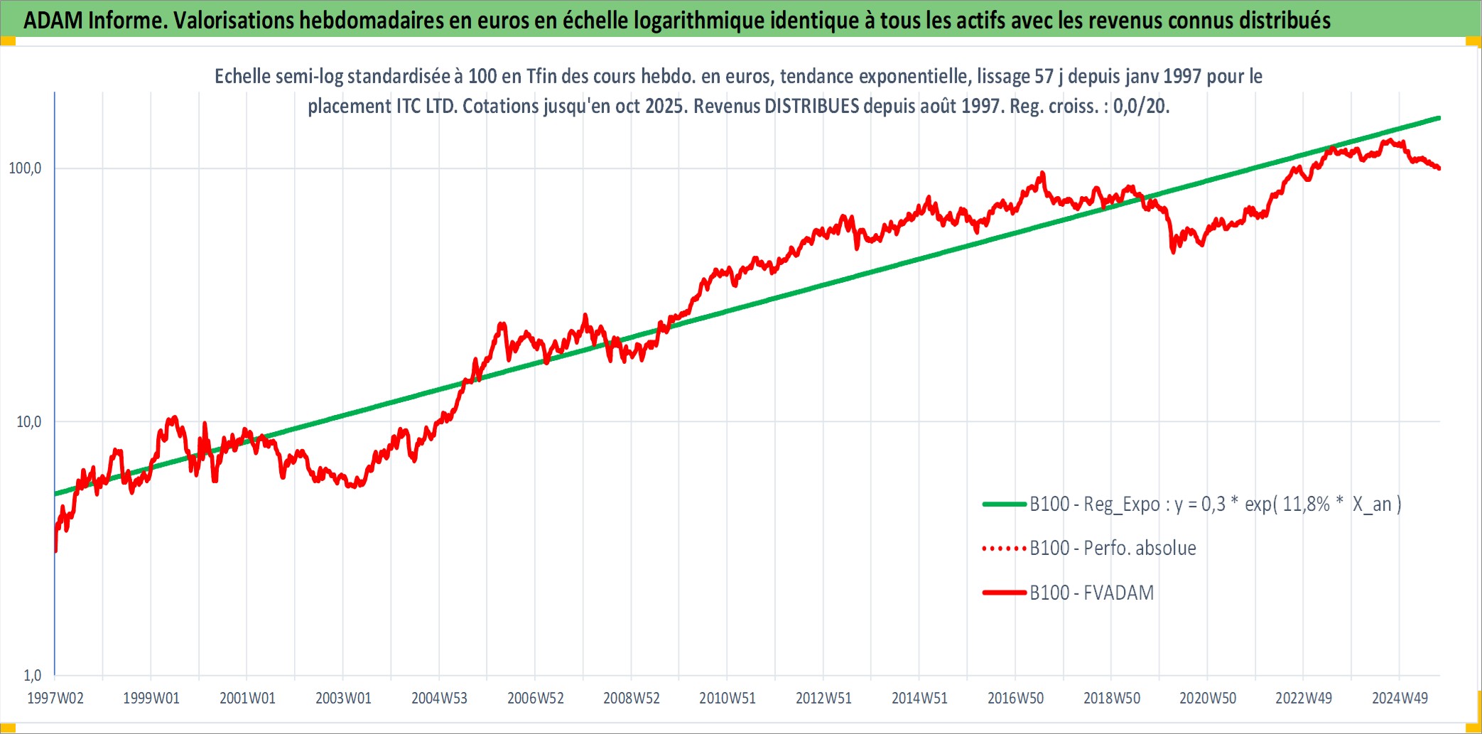 Site dédié aux investisseursPage dédiée sur site financeAnalyse des valorisations hebdomadaires de l'action ITC LTD. Cet actif est cote en INR. Les valorisations sont en contrevaleur EURO et couvrent les semaines 1997W01 a 2025W40. Les revenus de cet actif financier sont pris en compte depuis la semaine 1997W32. La note globale ESG de cet actif est estimee a 6.0 (apres rebasage entre 0 et 20).