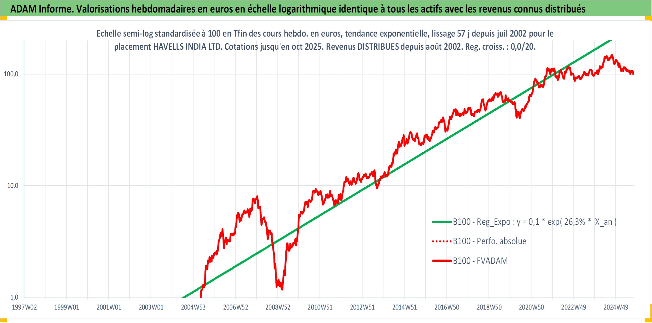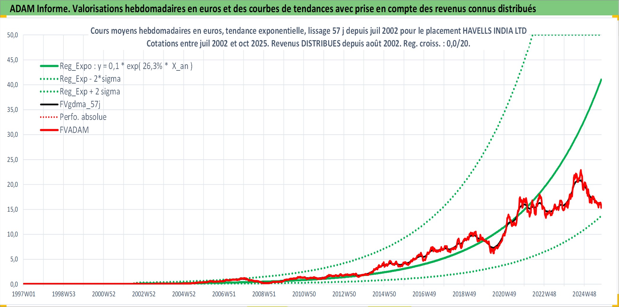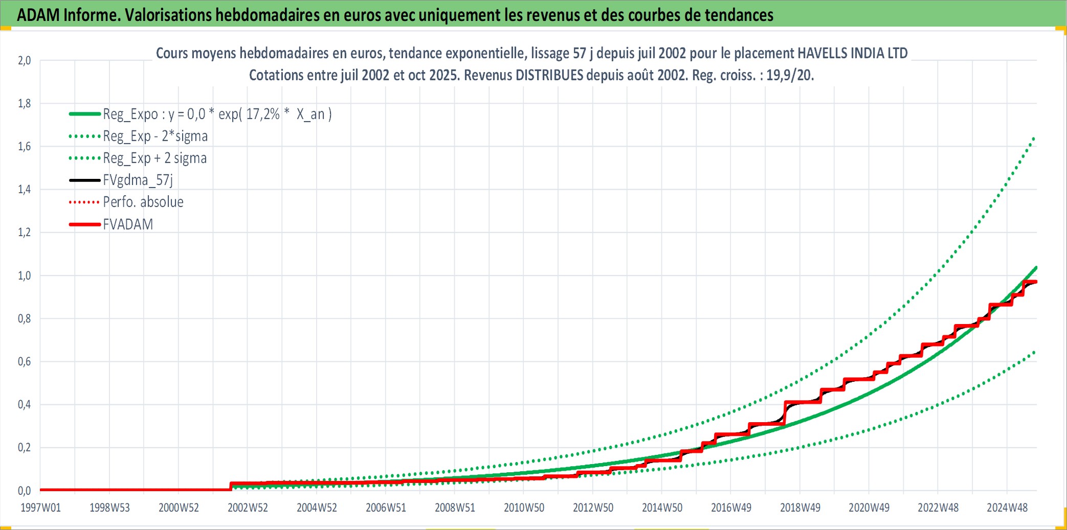 Site dédié aux investisseursPage dédiée sur site financeAnalyse des valorisations hebdomadaires de l'action HAVELLS INDIA LTD. Cet actif est cote en INR. Les valorisations sont en contrevaleur EURO et couvrent les semaines 2002W27 a 2025W40. Les revenus de cet actif financier sont pris en compte depuis la semaine 2002W32. La note ESG de cet actif n'est pas connue.
