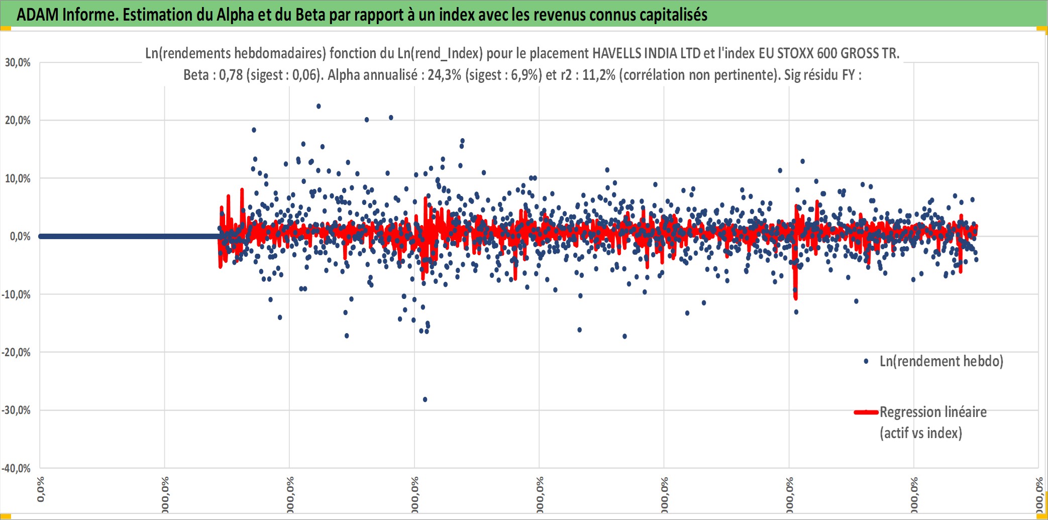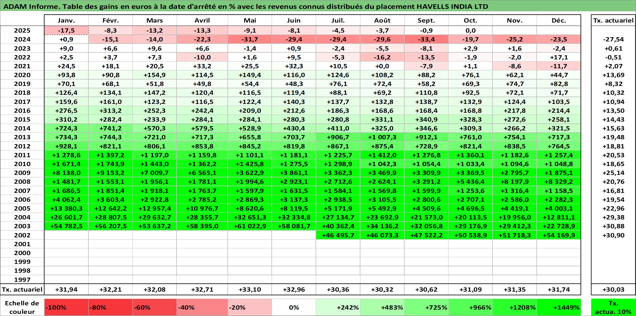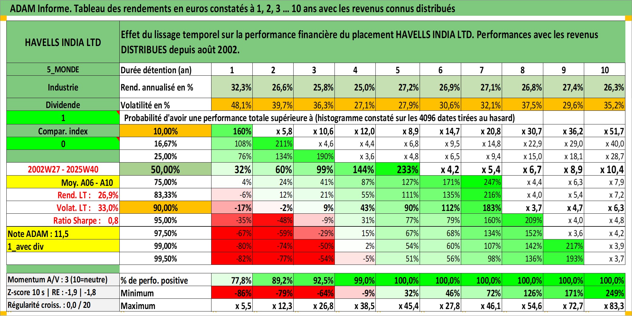 Site dédié aux investisseursPage dédiée sur site financeAnalyse des valorisations hebdomadaires de l'action HAVELLS INDIA LTD. Cet actif est cote en INR. Les valorisations sont en contrevaleur EURO et couvrent les semaines 2002W27 a 2025W40. Les revenus de cet actif financier sont pris en compte depuis la semaine 2002W32. La note ESG de cet actif n'est pas connue.
