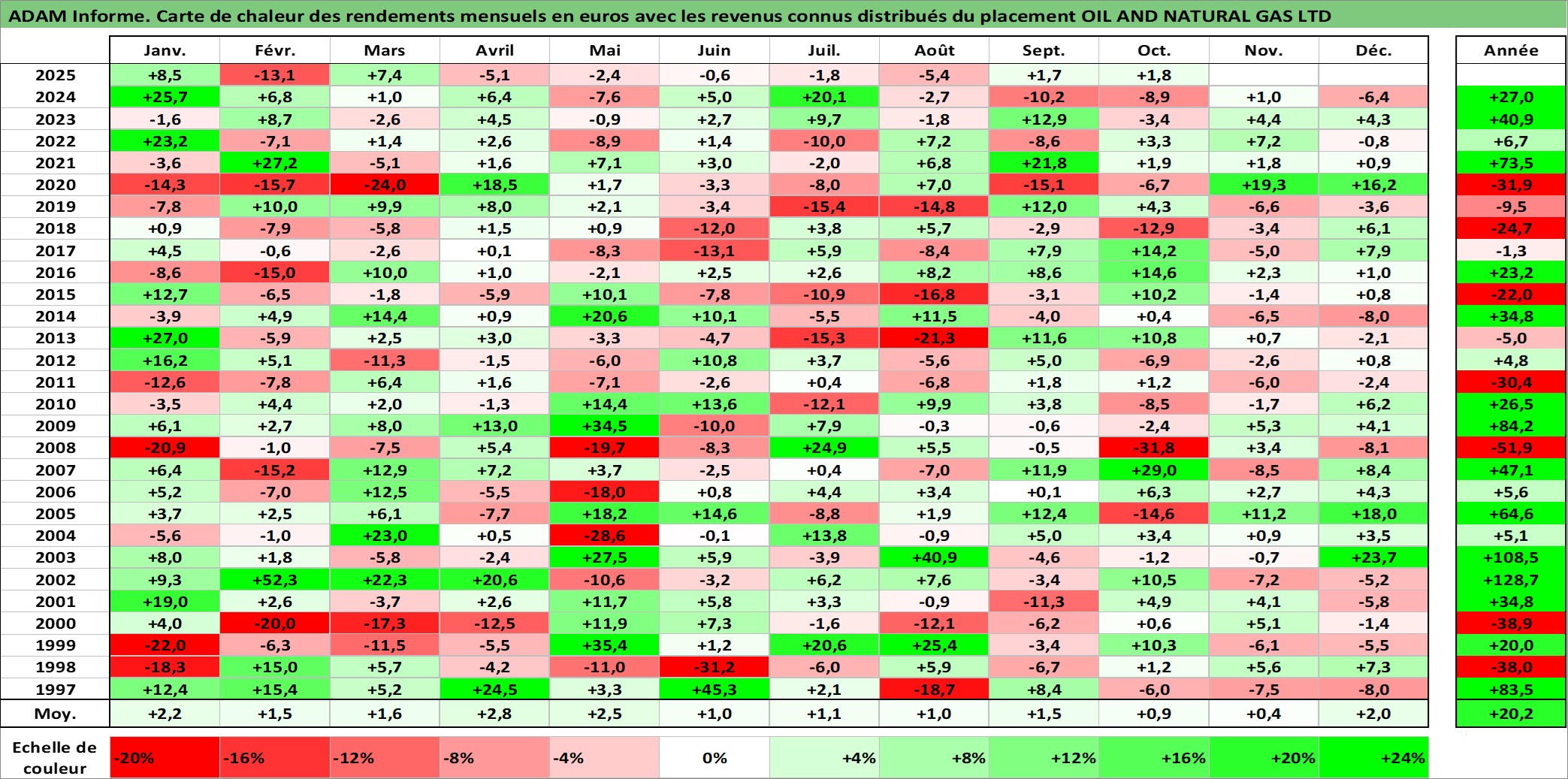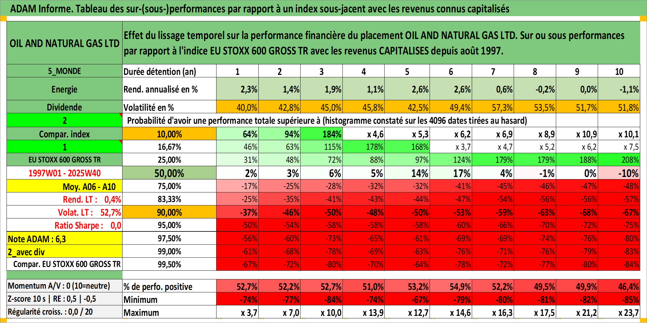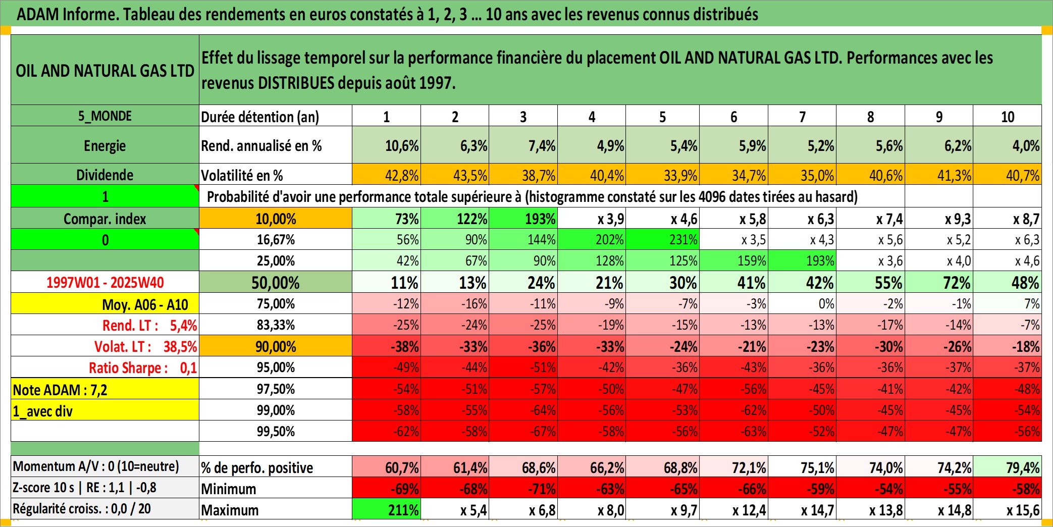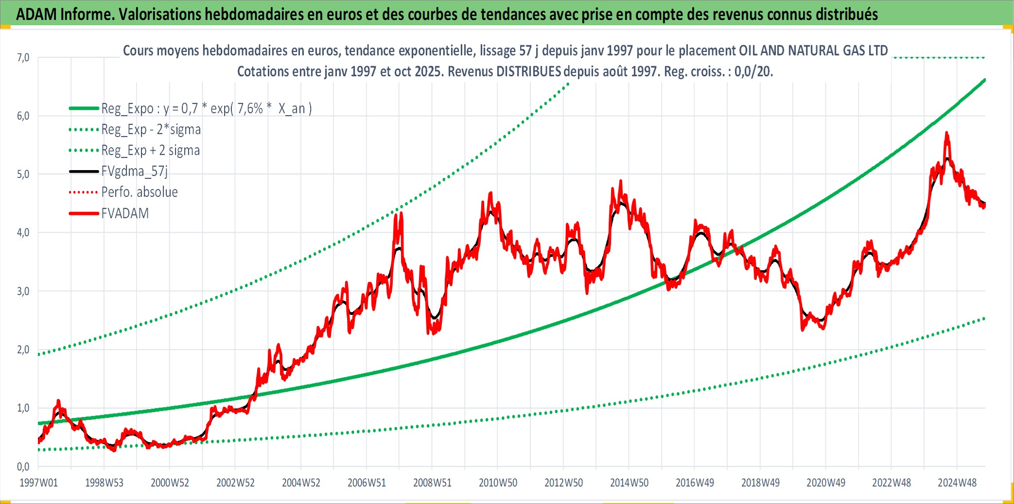 Site dédié aux investisseursPage dédiée sur site financeAnalyse des valorisations hebdomadaires de l'action OIL AND NATURAL GAS LTD. Cet actif est cote en INR. Les valorisations sont en contrevaleur EURO et couvrent les semaines 1997W01 a 2025W40. Les revenus de cet actif financier sont pris en compte depuis la semaine 1997W35. La note ESG de cet actif n'est pas connue.
