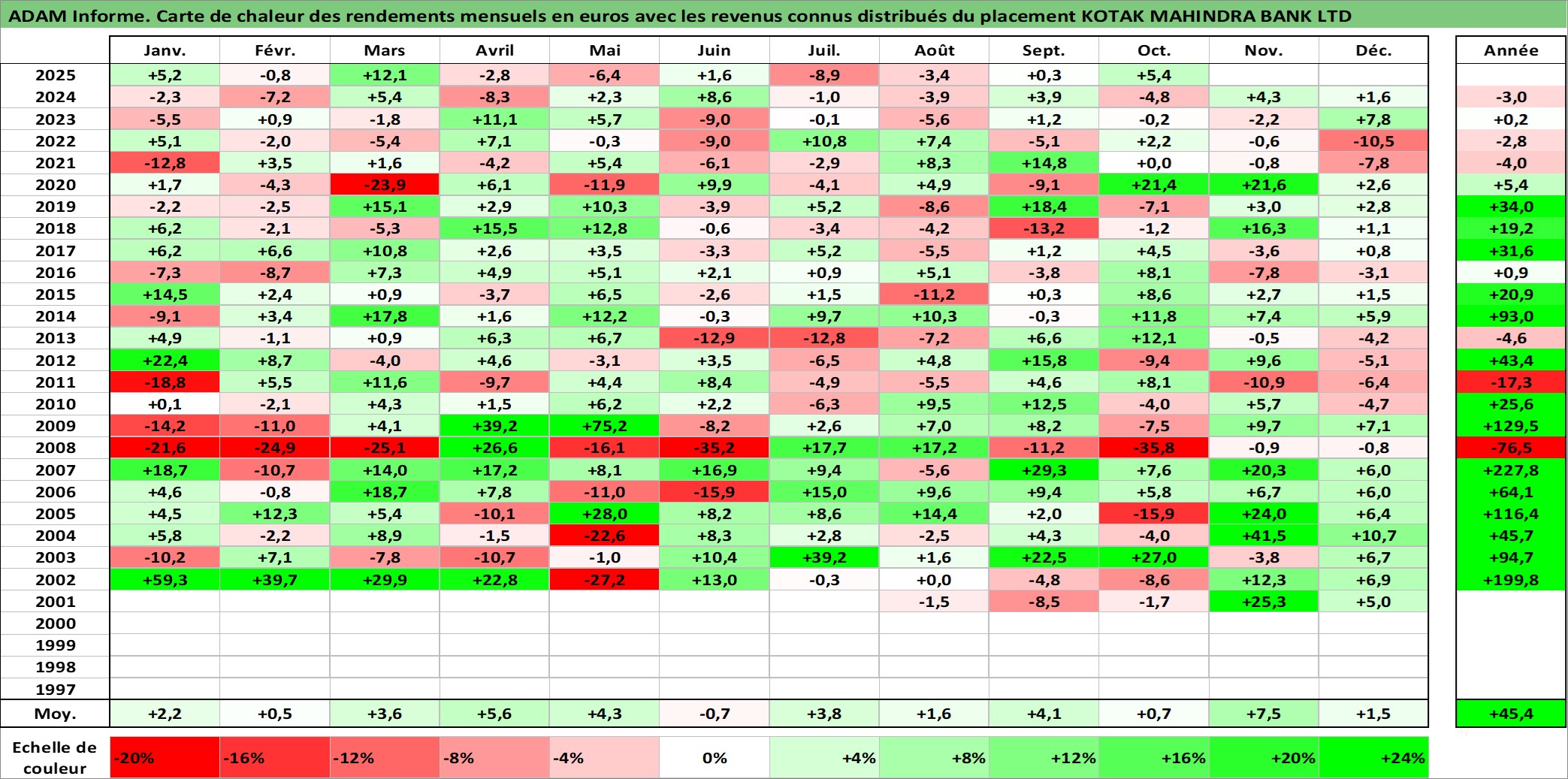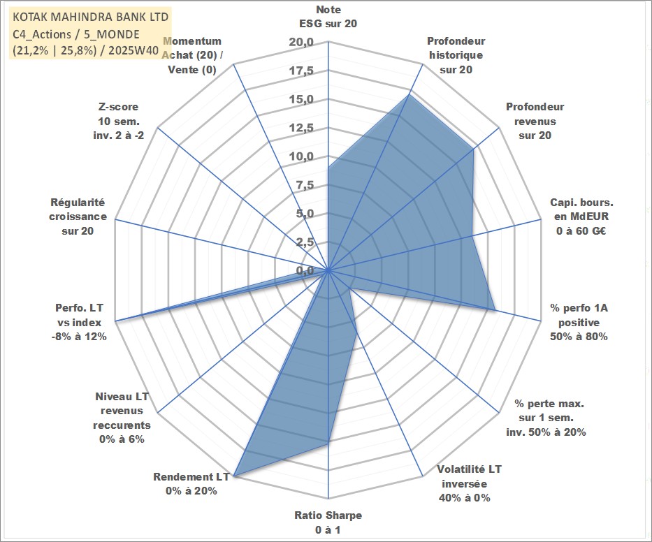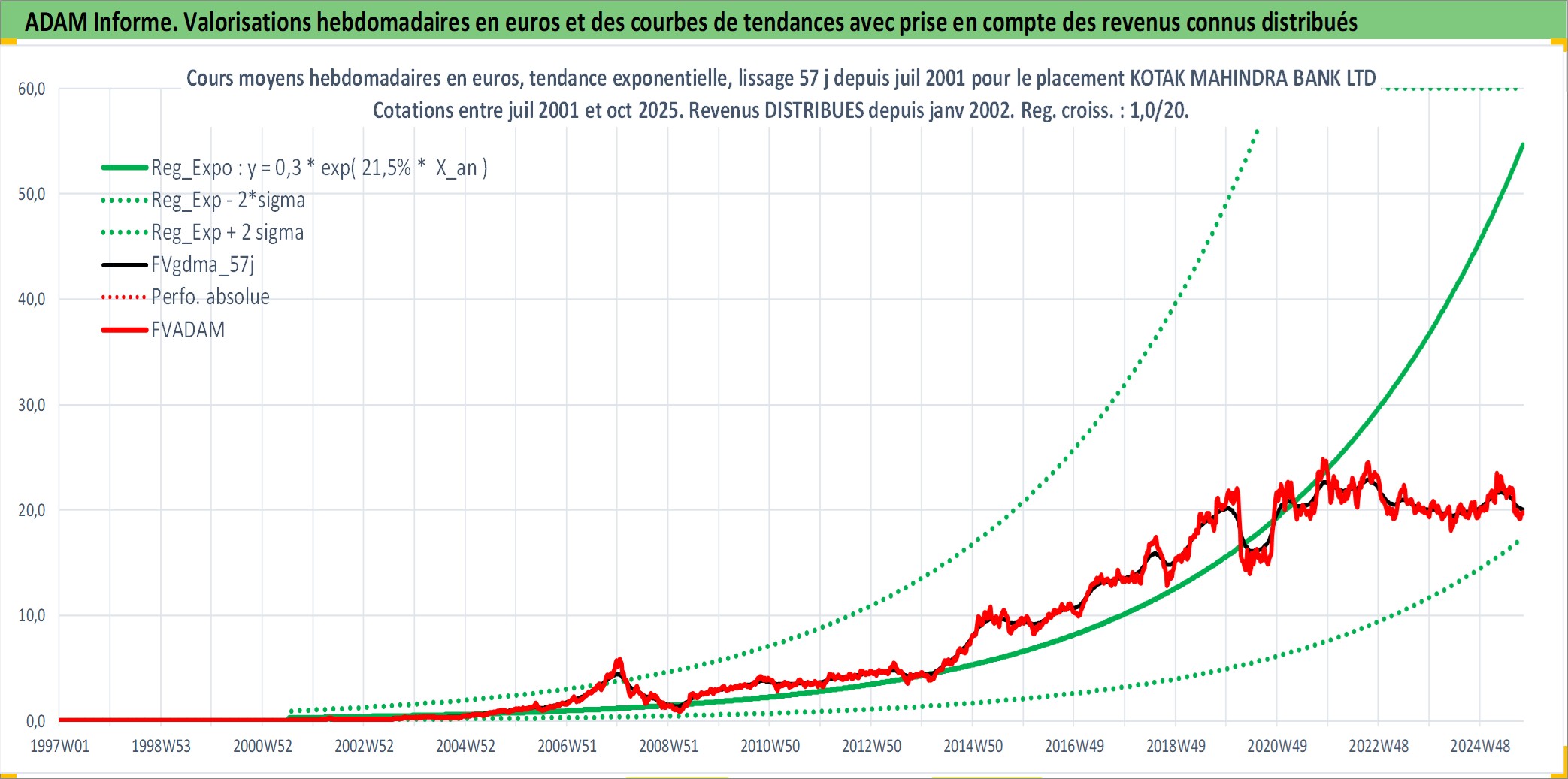 Site dédié aux investisseursPage dédiée sur site financeAnalyse des valorisations hebdomadaires de l'action KOTAK MAHINDRA BANK LTD. Cet actif est cote en INR. Les valorisations sont en contrevaleur EURO et couvrent les semaines 2001W27 a 2025W40. Les revenus de cet actif financier sont pris en compte depuis la semaine 2002W04. La note globale ESG de cet actif est estimee a 9.0 (apres rebasage entre 0 et 20).
