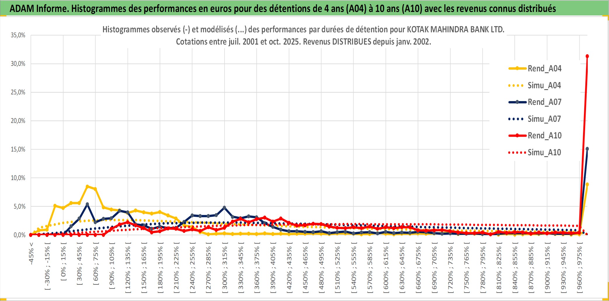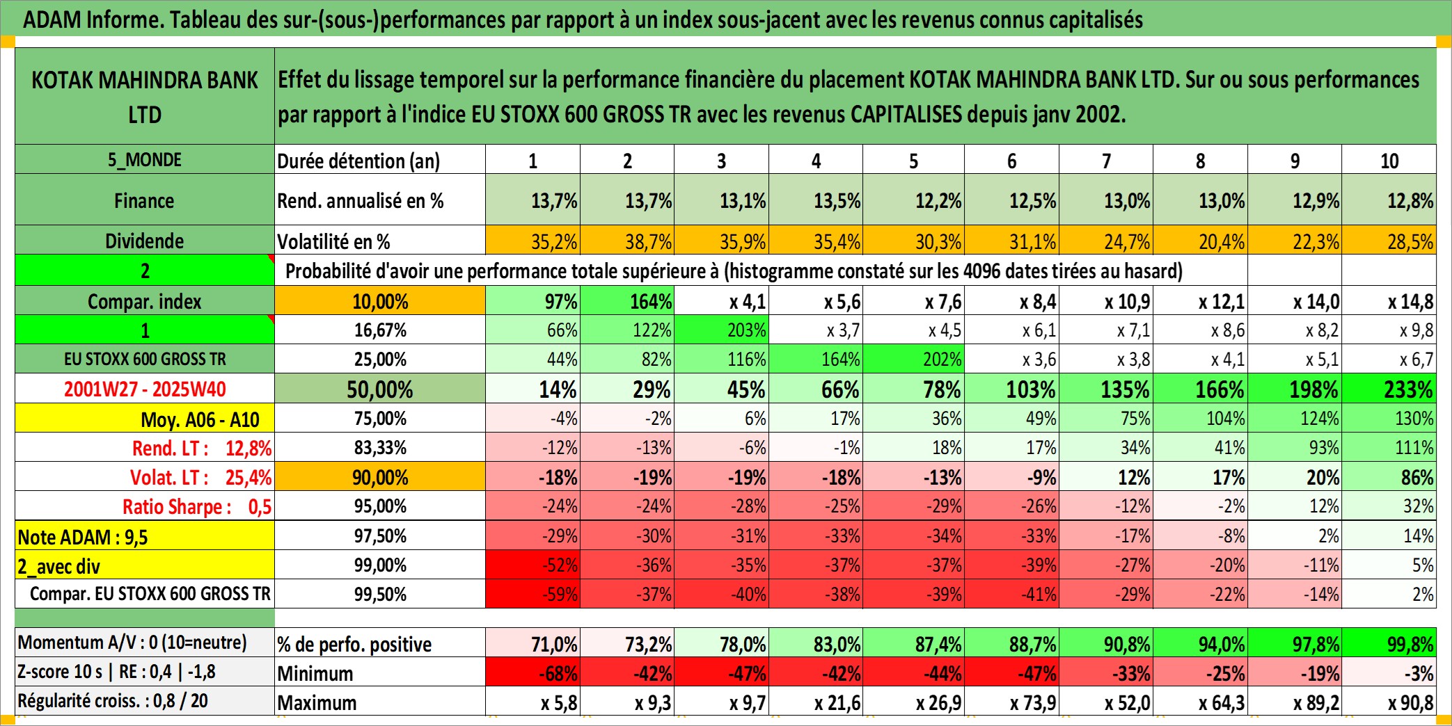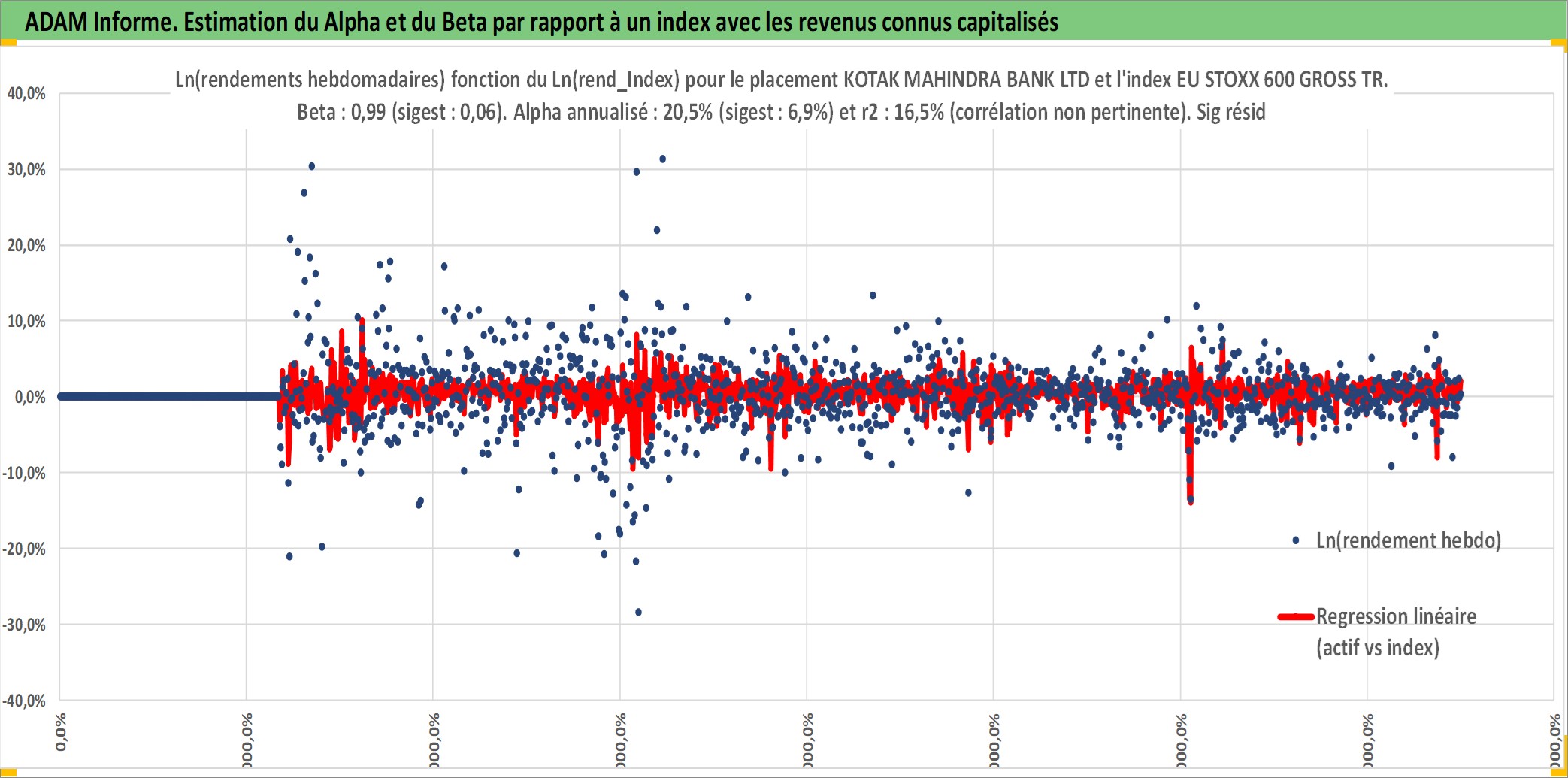 Site dédié aux investisseursPage dédiée sur site financeAnalyse des valorisations hebdomadaires de l'action KOTAK MAHINDRA BANK LTD. Cet actif est cote en INR. Les valorisations sont en contrevaleur EURO et couvrent les semaines 2001W27 a 2025W40. Les revenus de cet actif financier sont pris en compte depuis la semaine 2002W04. La note globale ESG de cet actif est estimee a 9.0 (apres rebasage entre 0 et 20).
