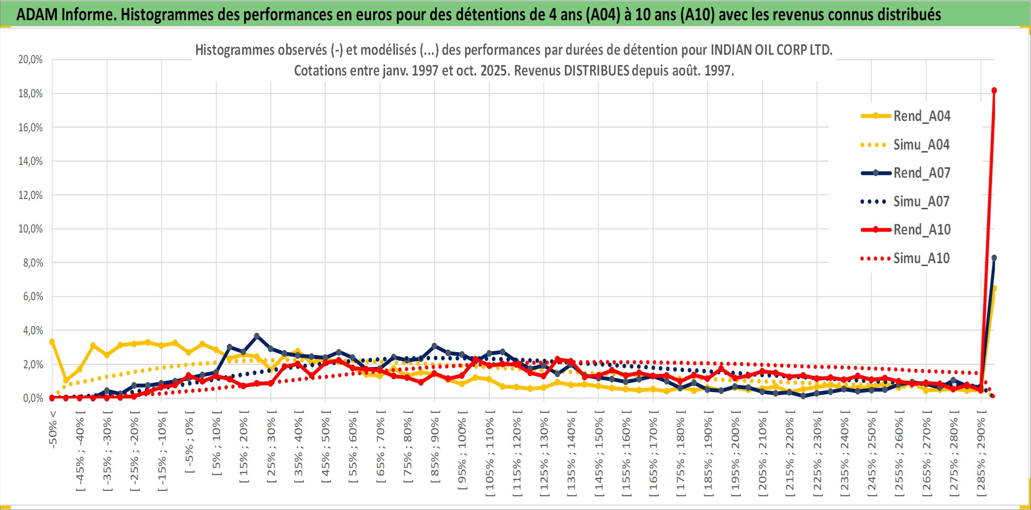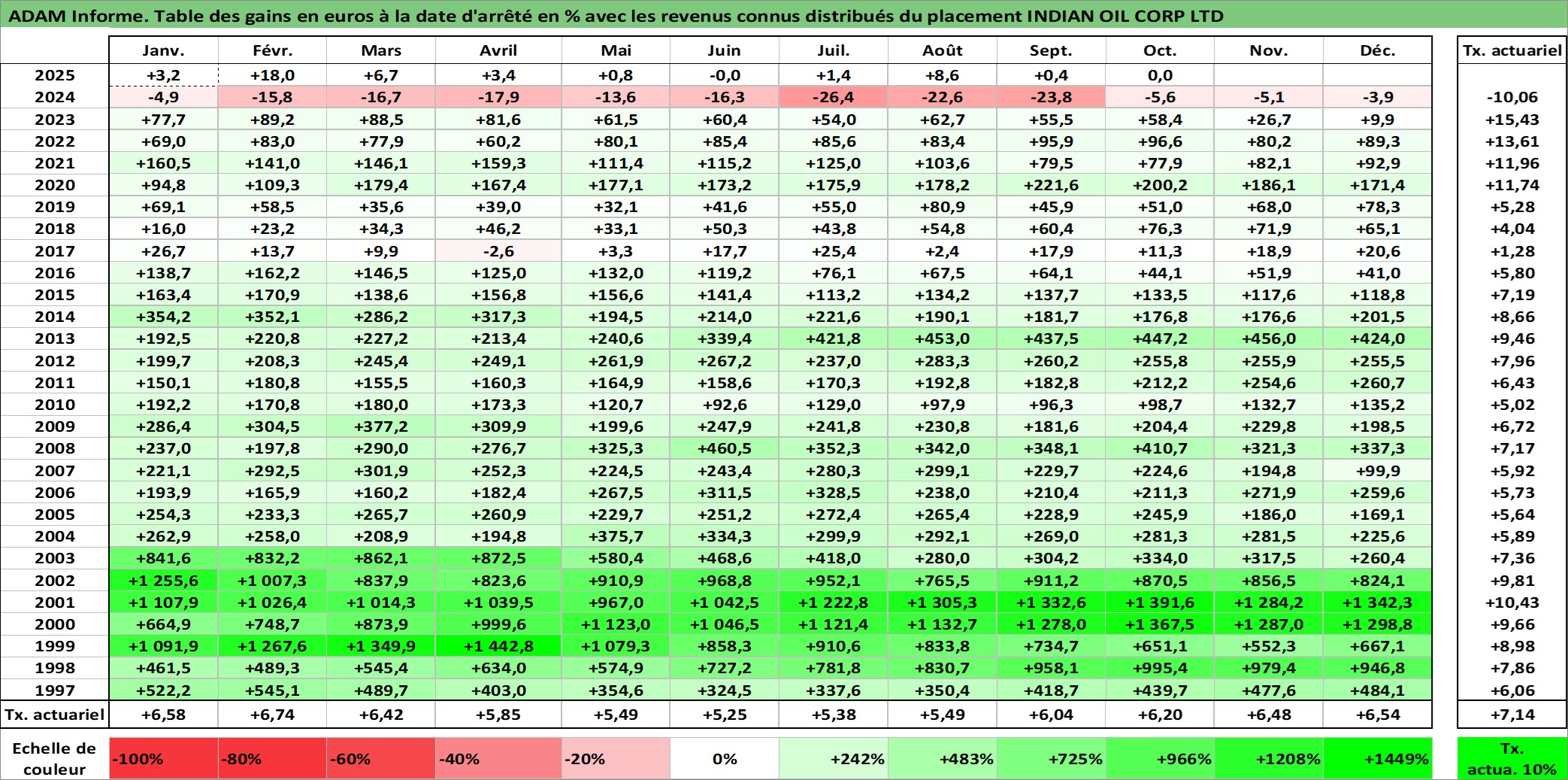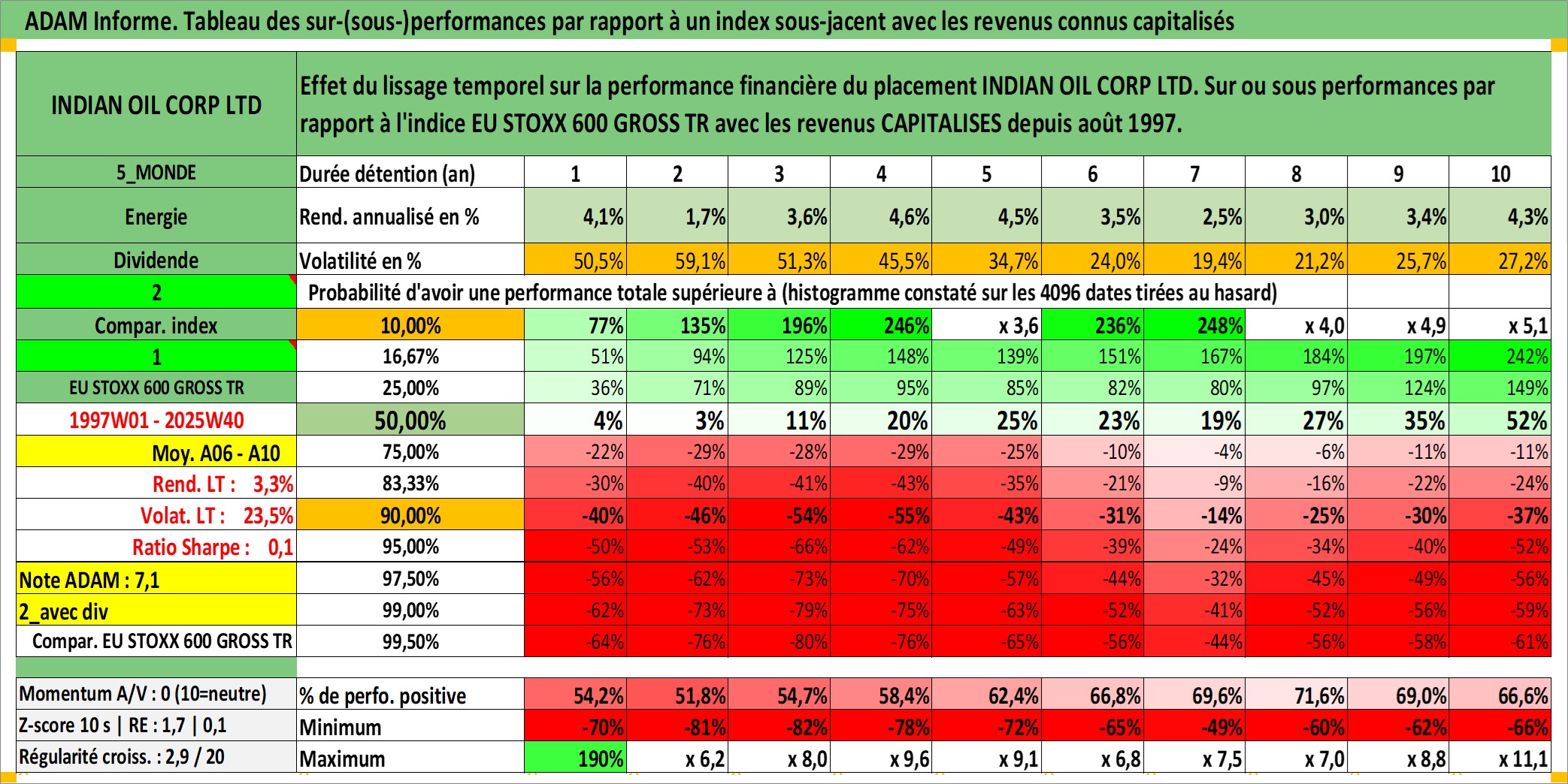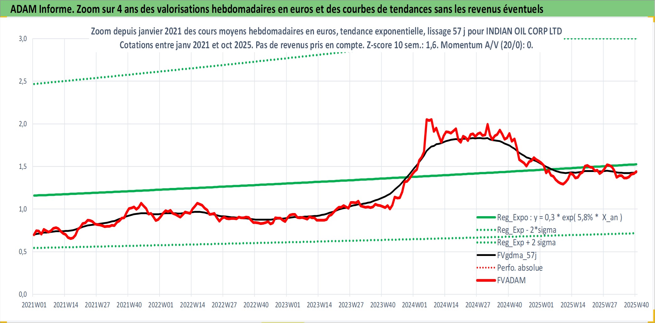 Site dédié aux investisseursPage dédiée sur site financeAnalyse des valorisations hebdomadaires de l'action INDIAN OIL CORP LTD. Cet actif est cote en INR. Les valorisations sont en contrevaleur EURO et couvrent les semaines 1997W01 a 2025W40. Les revenus de cet actif financier sont pris en compte depuis la semaine 1997W35. La note globale ESG de cet actif est estimee a 3.0 (apres rebasage entre 0 et 20).
