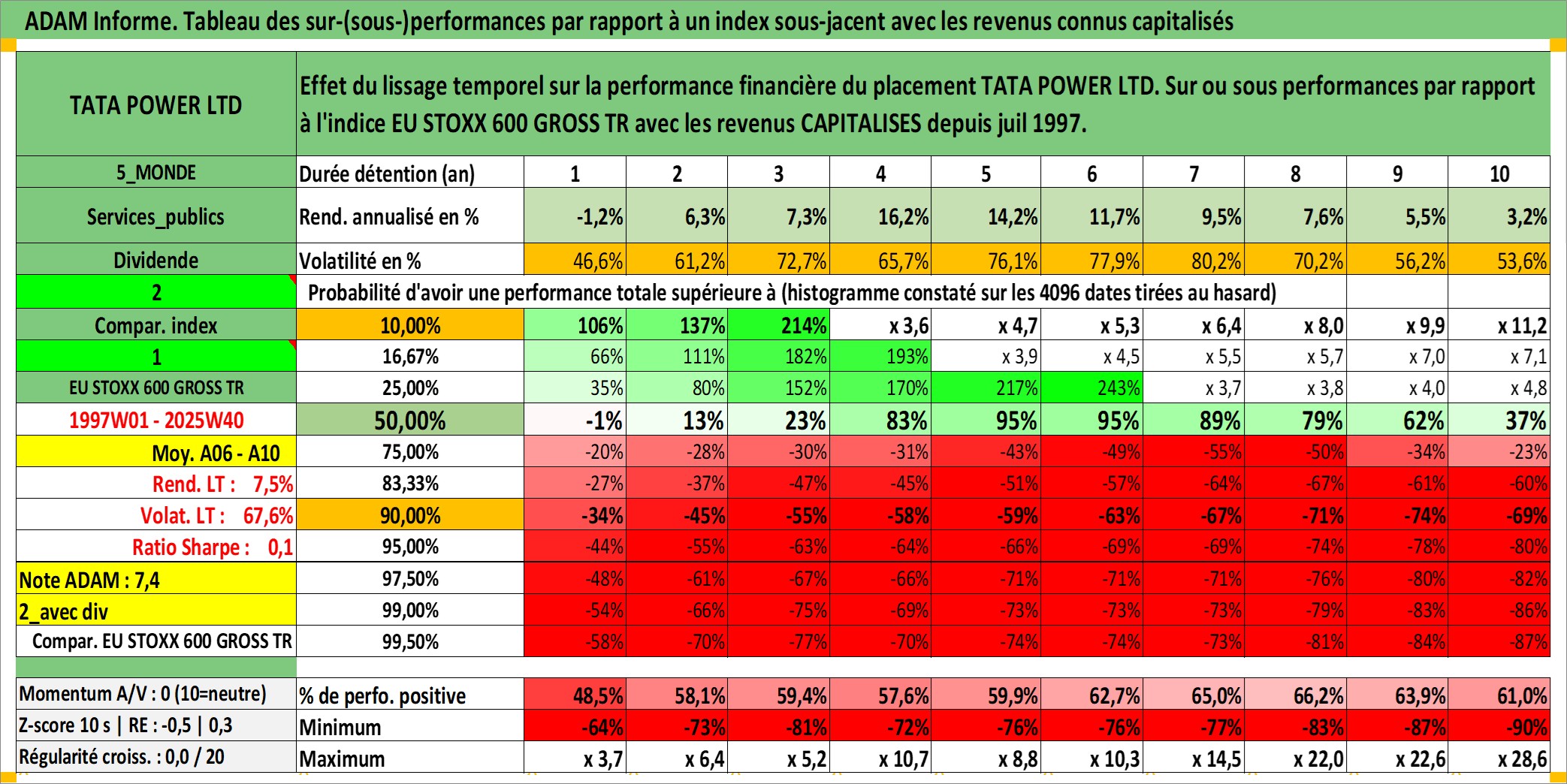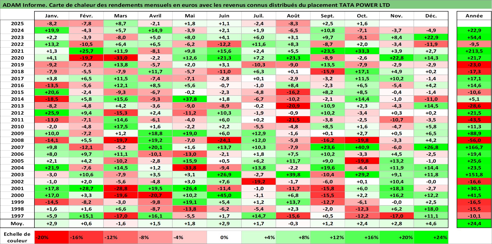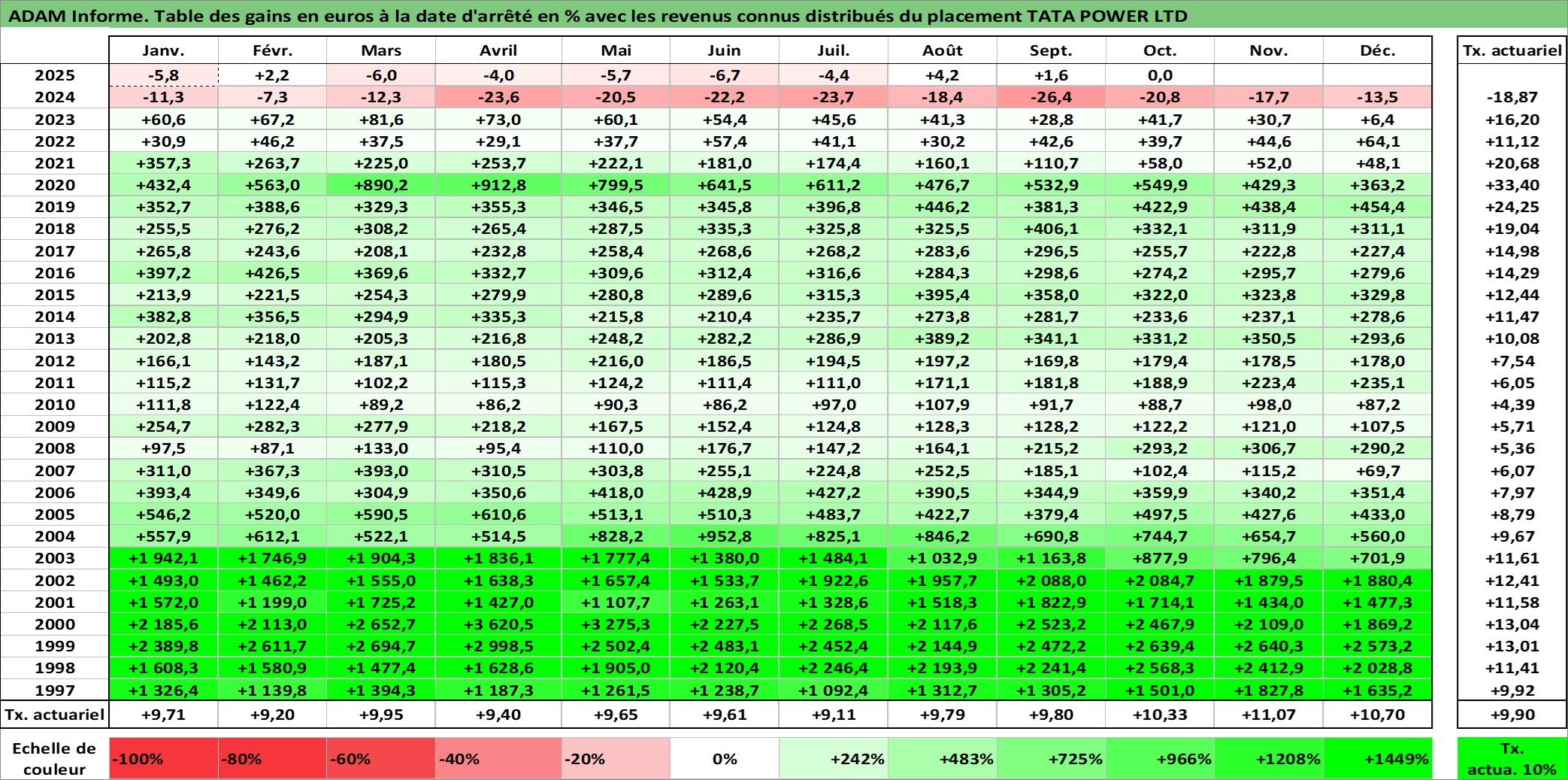 Site dédié aux investisseursPage dédiée sur site financeAnalyse des valorisations hebdomadaires de l'action TATA POWER LTD. Cet actif est cote en INR. Les valorisations sont en contrevaleur EURO et couvrent les semaines 1997W01 a 2025W40. Les revenus de cet actif financier sont pris en compte depuis la semaine 1997W28. La note ESG de cet actif n'est pas connue.